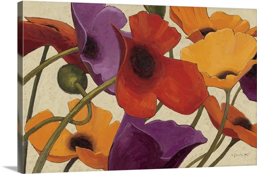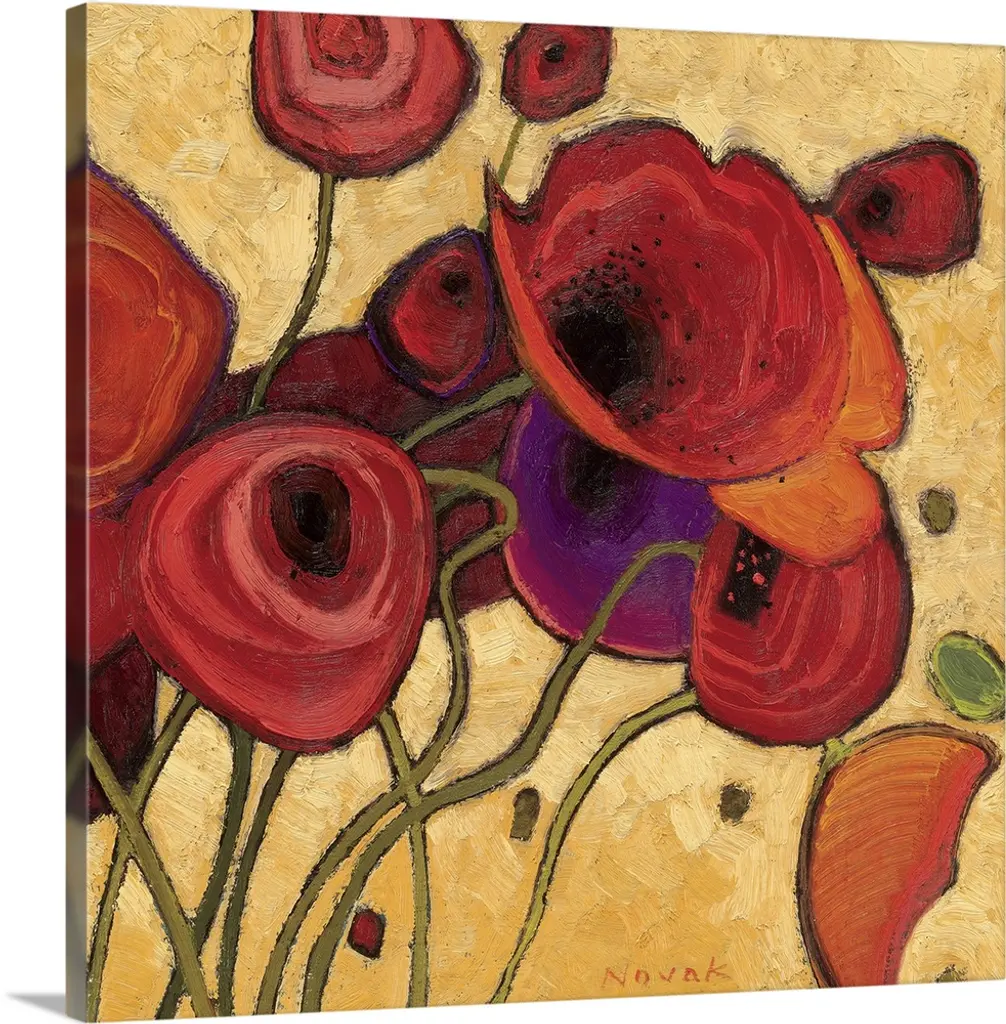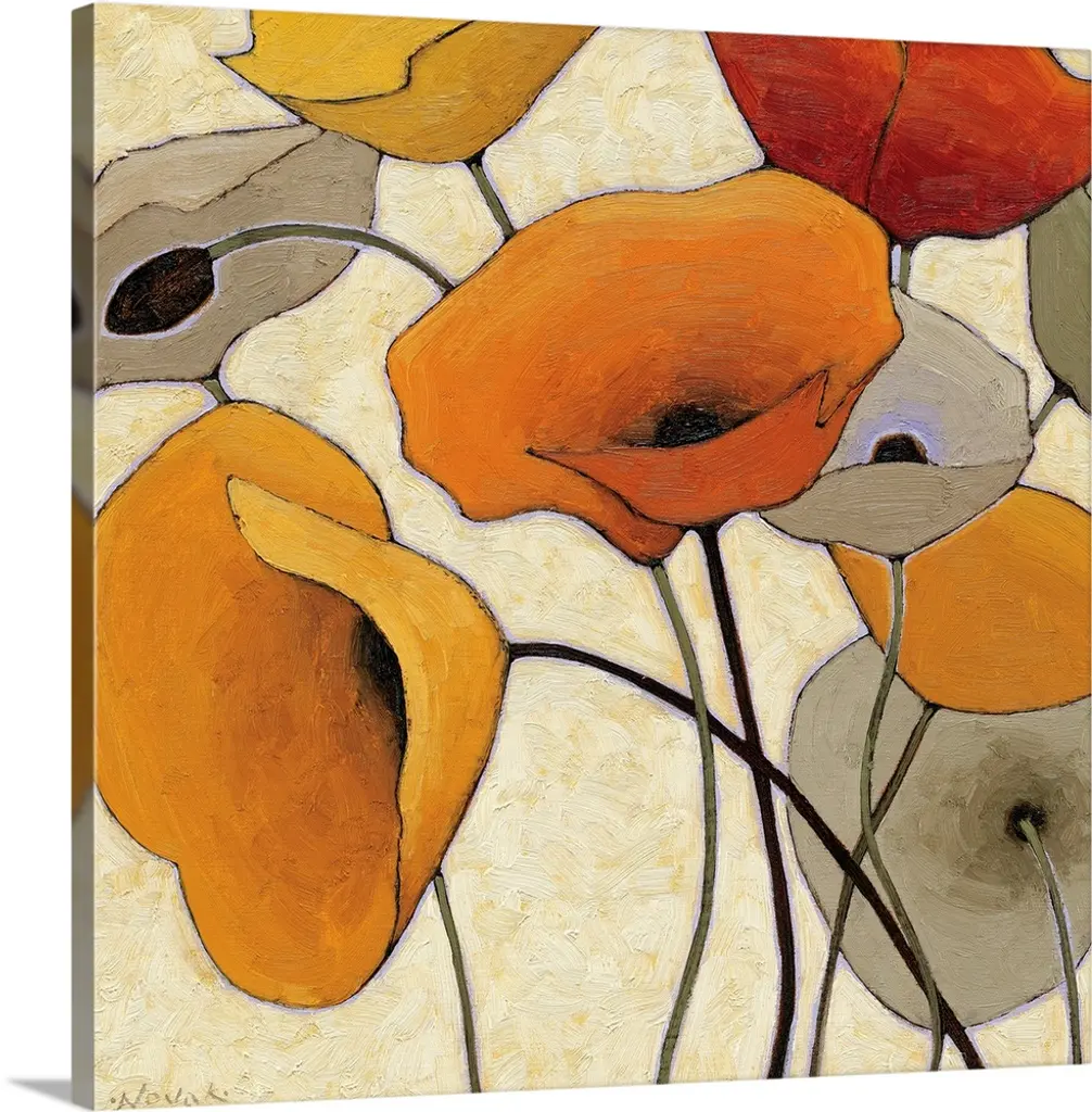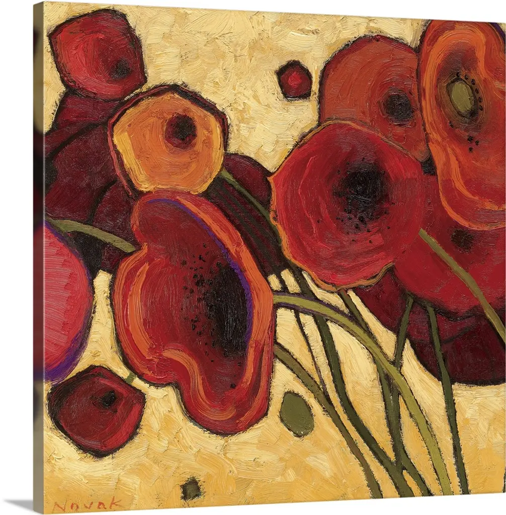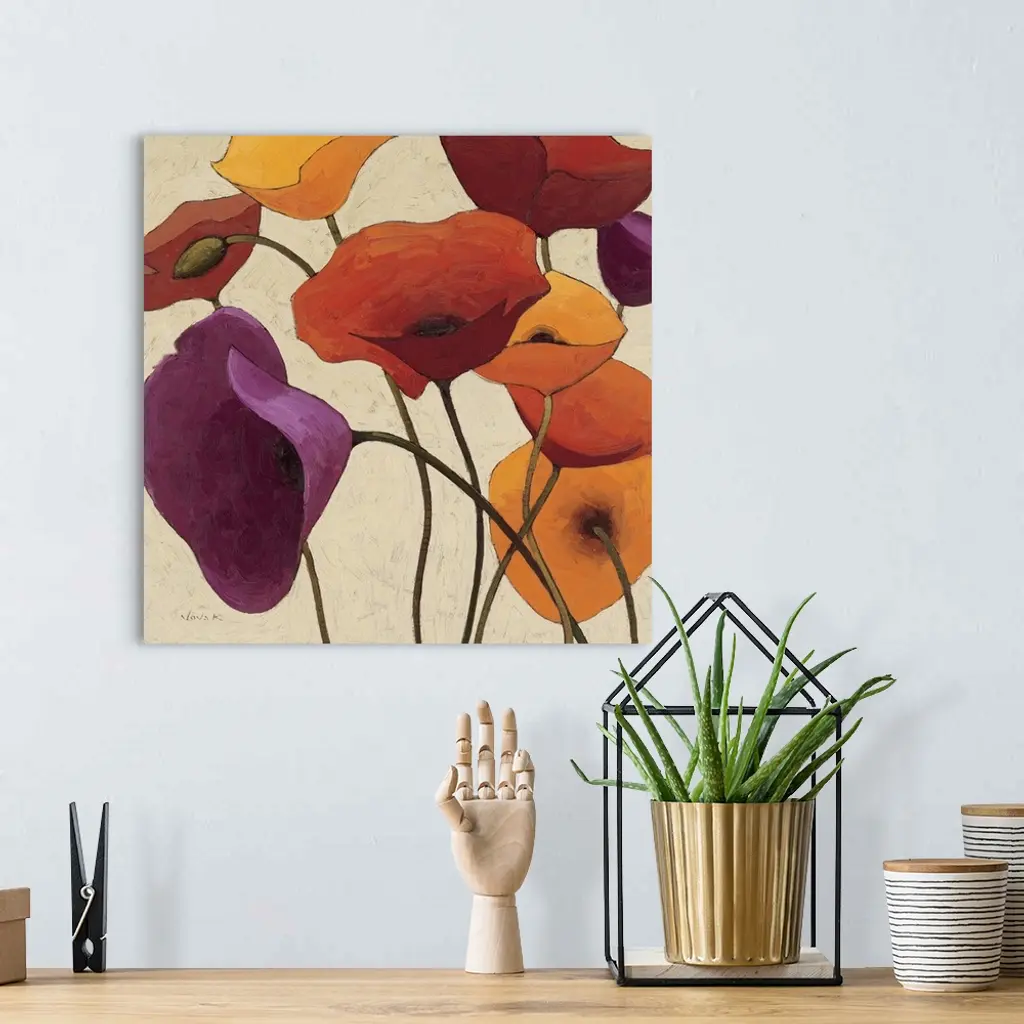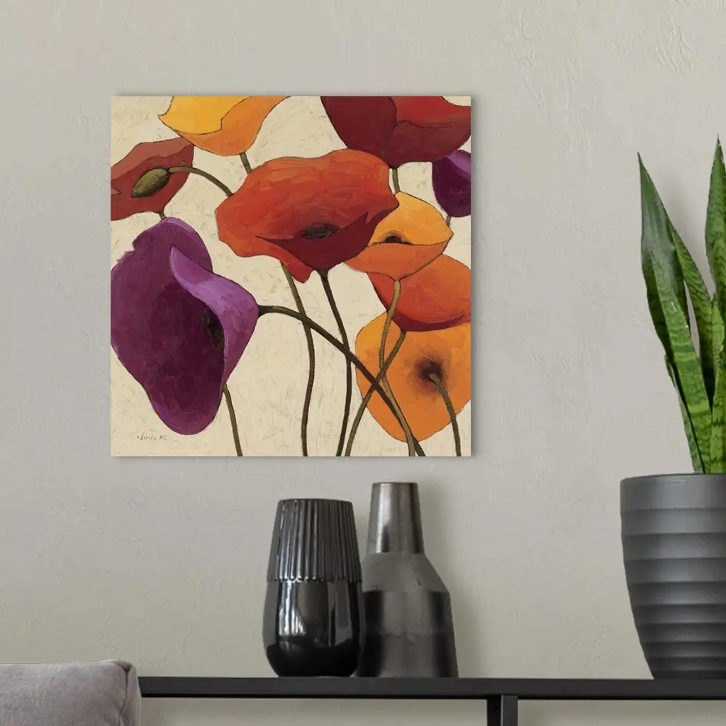 This decorative accent is a square contemporary painting of stylized poppy flowers against a neutral backdrop.