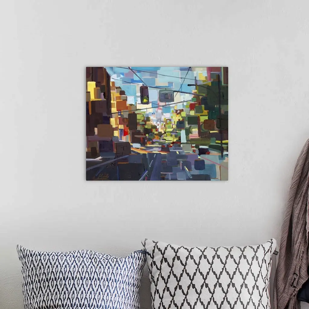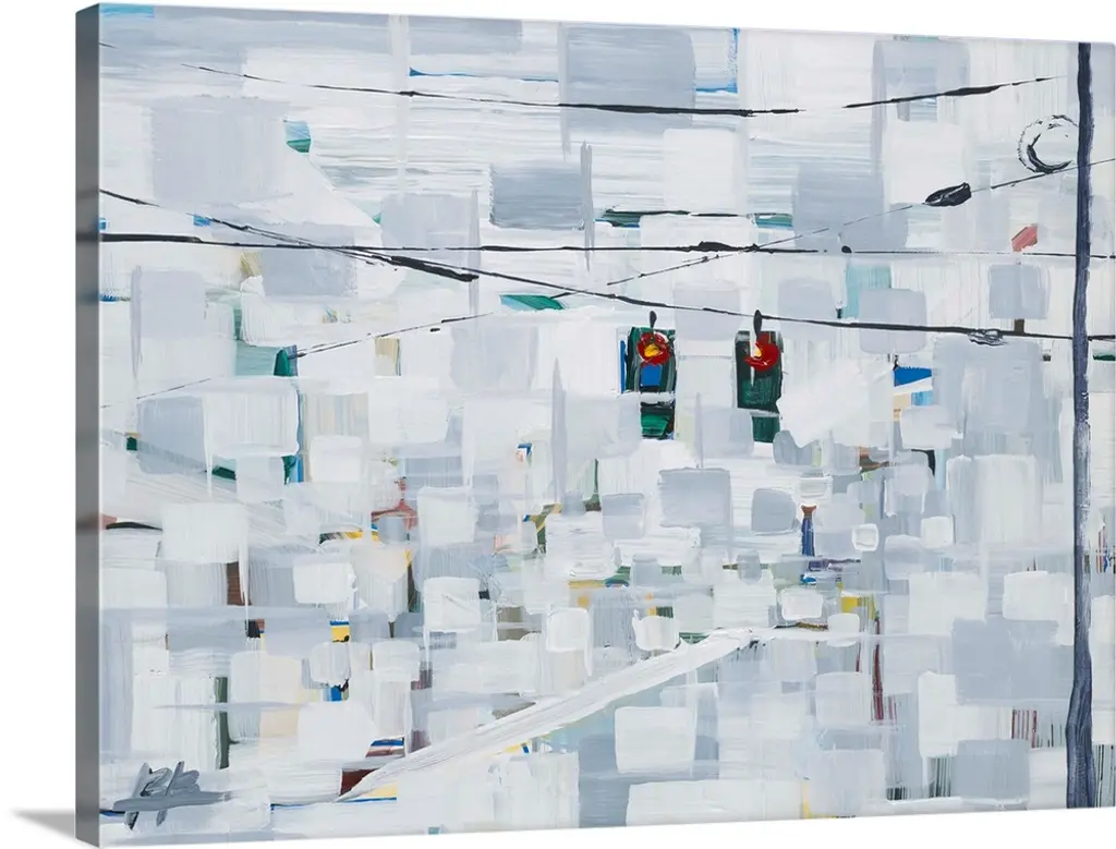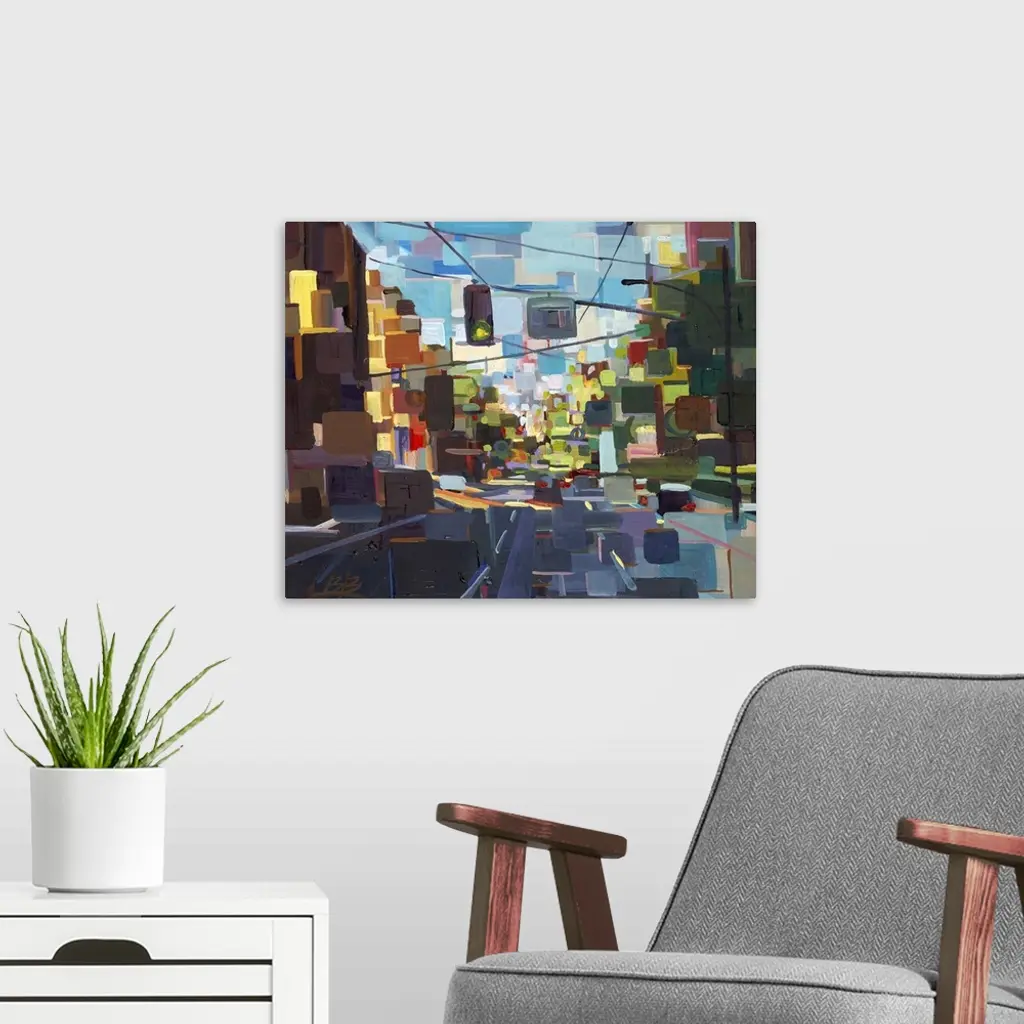 Contemporary abstract painting of an urban environment deconstructed into geometric shapes.