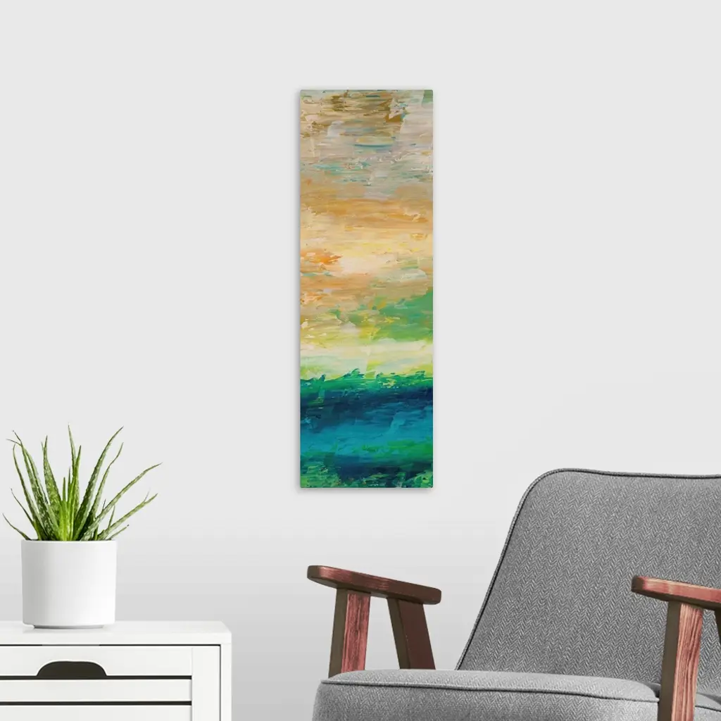 Vertical abstract painting reminiscent of the sky in the morning.