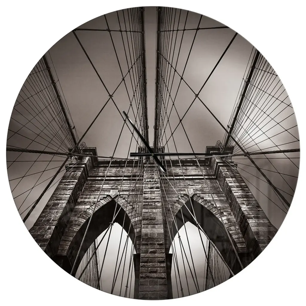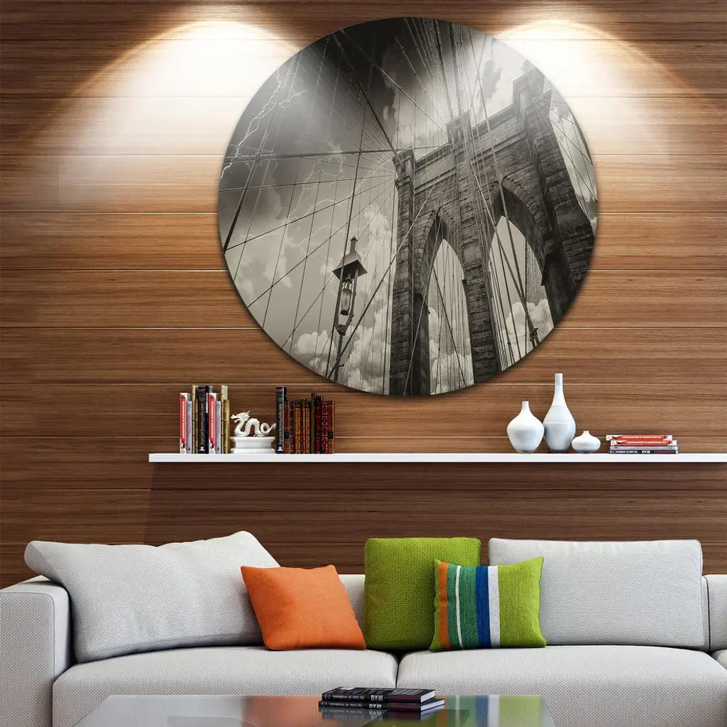 Bring Contemporary Abstraction to your home with this large Circle Metal wall art. This Upward View of Brooklyn Bridge Metal Artwork makes it the focal point of any room or office. - White Gloss Coating ensures colors are extra vibrant with light reflection.- Aluminum grade Sheet Metal with 1 inch mounting frame on the back giving the illusion that the artwork is floating on the wall..- Mounting Brackets are included along with instructions.- High Quality Digital images are created directly into a glossy aluminum panel producing a stunning and captivating print into the glossy finish of the metal.- Water, Fire and Scratch resistant HD Aluminum panels.- Looks better than any photo paper and guaranteed to last at least 20 years- Easy to clean with a microfiber cloth. Colors are far superior to regular Canvas Art. - Easy to Hang