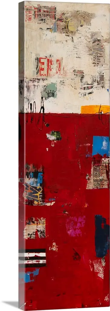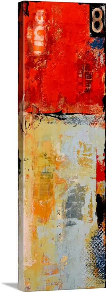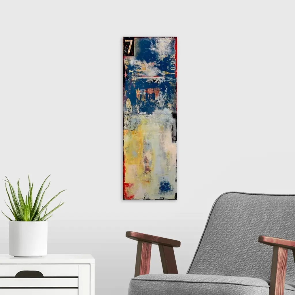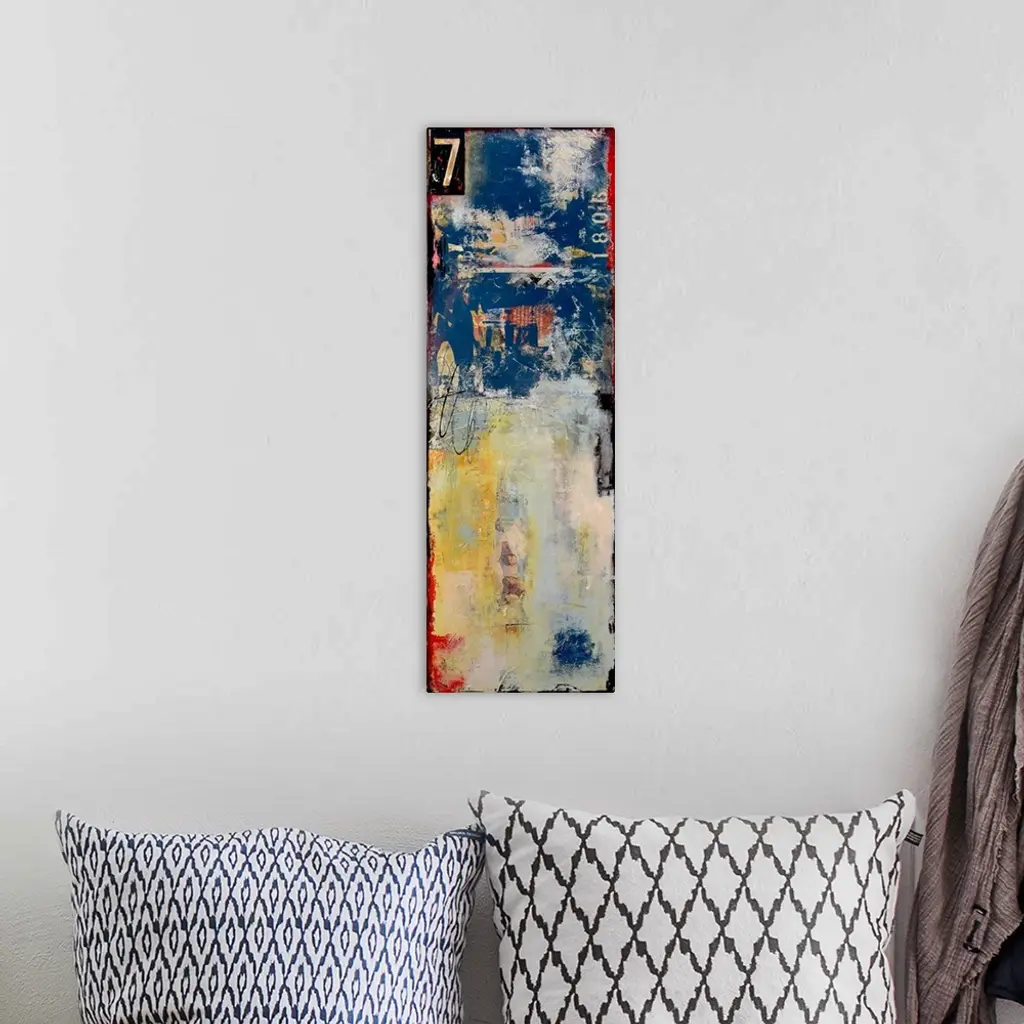 Tall panel abstract artwork in shades of blue, gray, yellow, black, and red created with mixed media and a large number 7 in the top left corner.