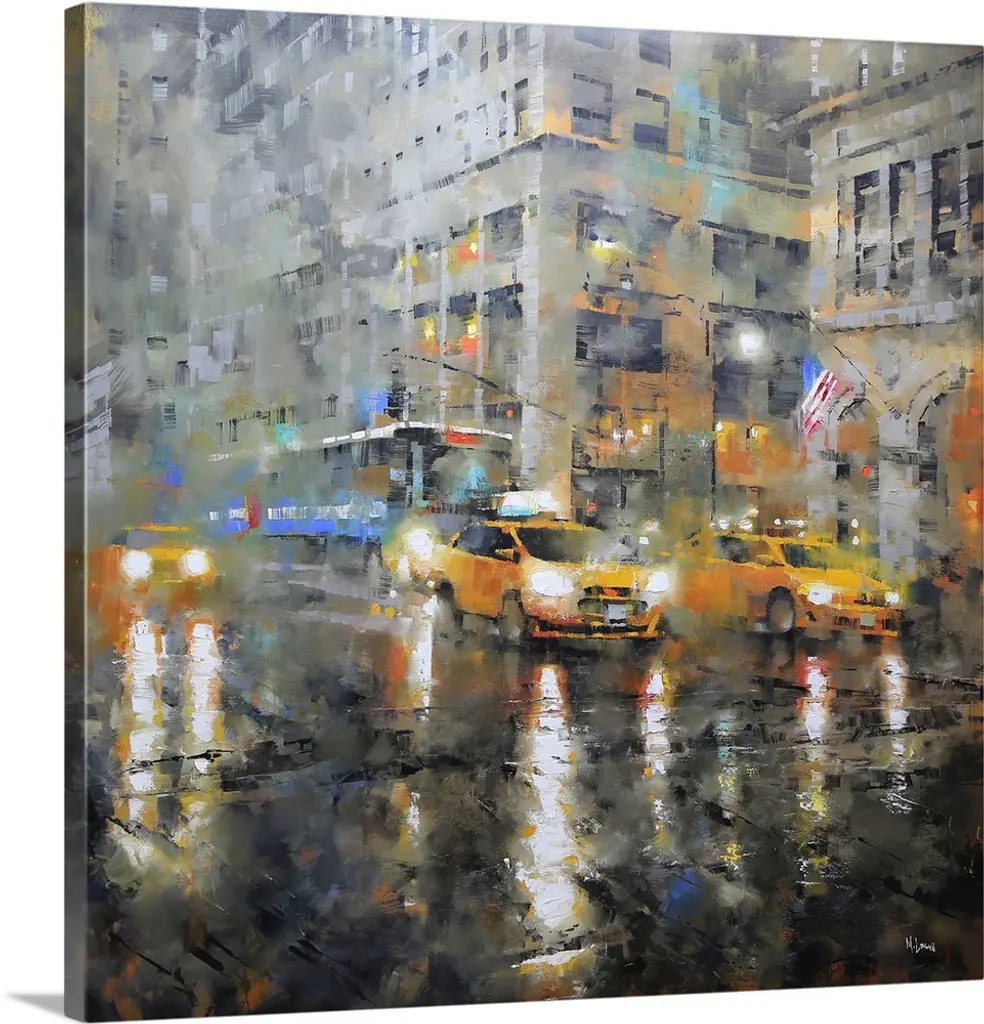 Contemporary painting of a city street lined with cars.