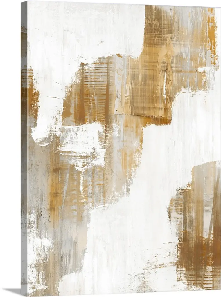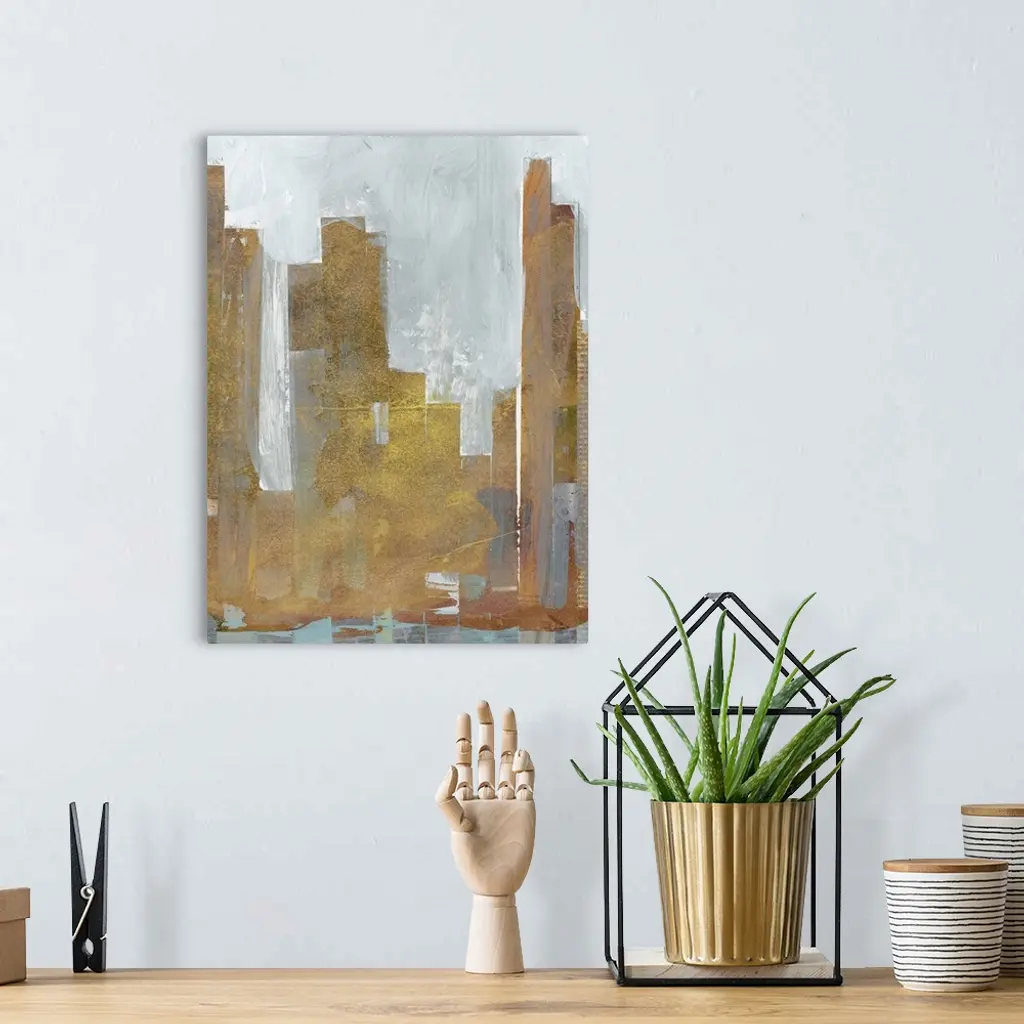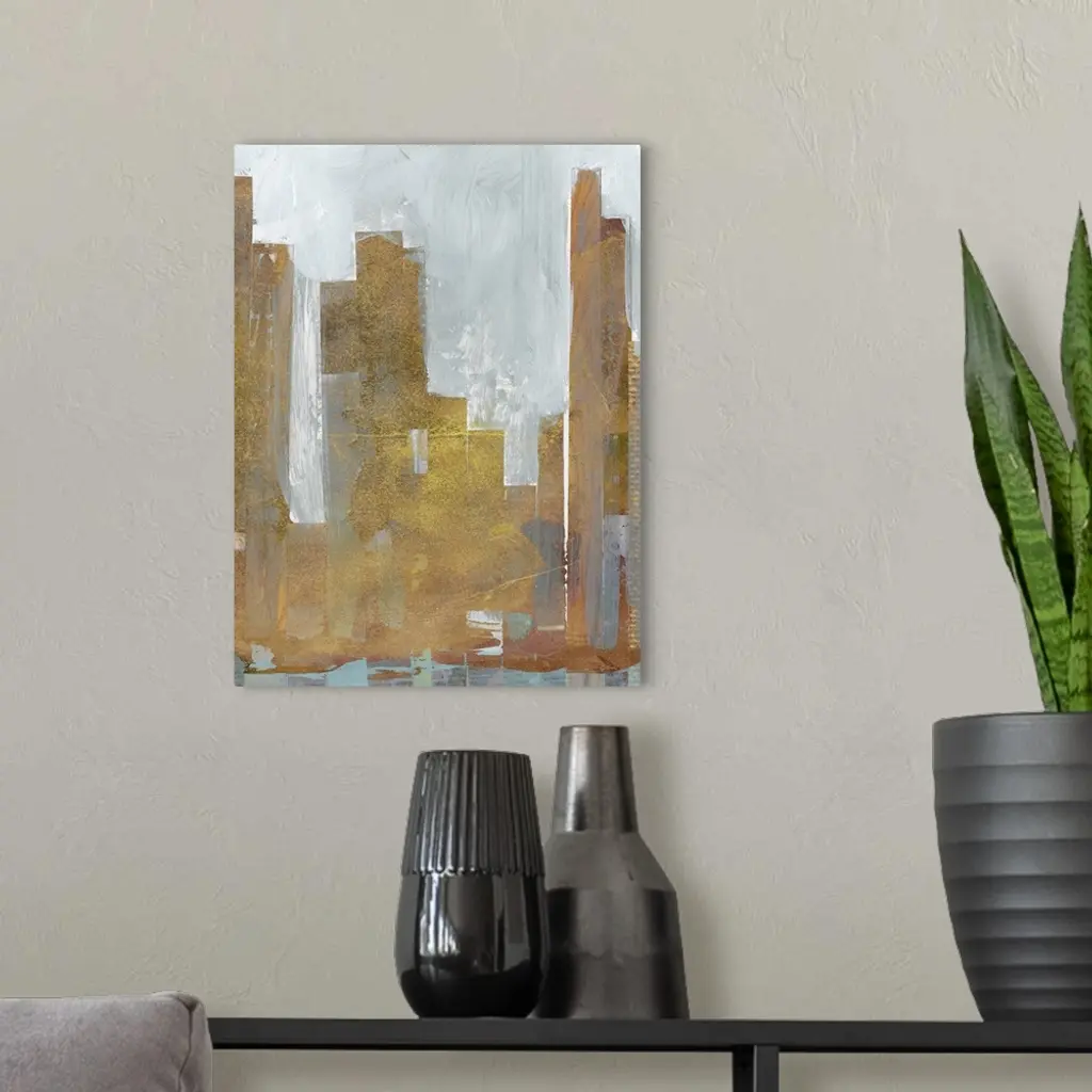 Contemporary abstract artwork using muted colors and geometric shapes resembling a city skyline.