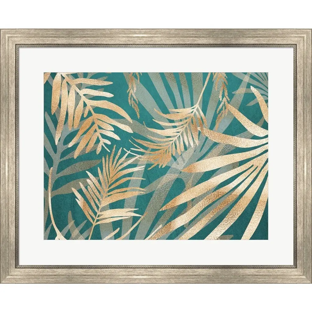 Glam Leaves Teal 2 by Urban Epiphany is a high quality piece of framed artwork. The finished size of this piece is 29.25" X 24". It has a Classic Champagne Silver with Ornate Inner Edge frame, is single matted and finished with high quality Acrylic Plexiglass. 100% Satisfaction Guaranteed.