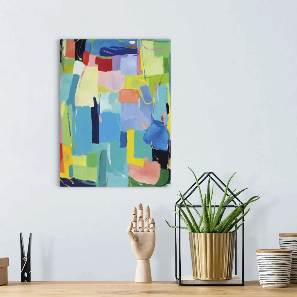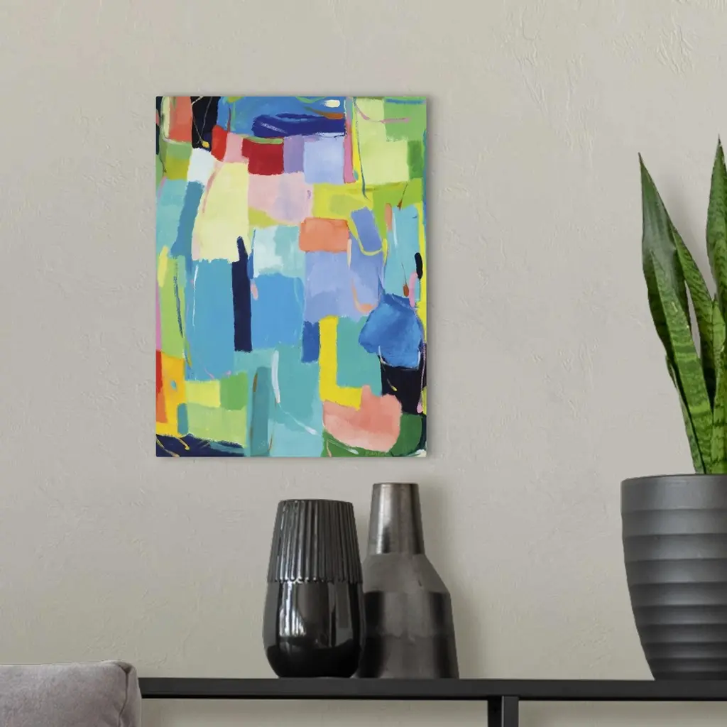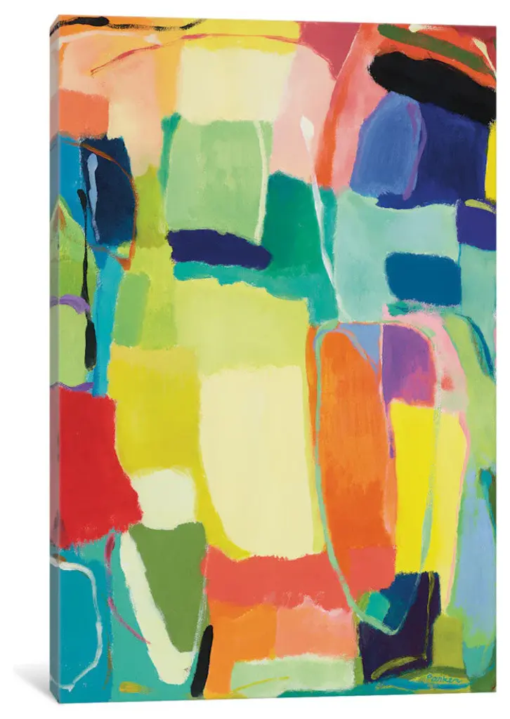 Abstract painting of soft, rounded rectangular shapes in bright, spring-like colors