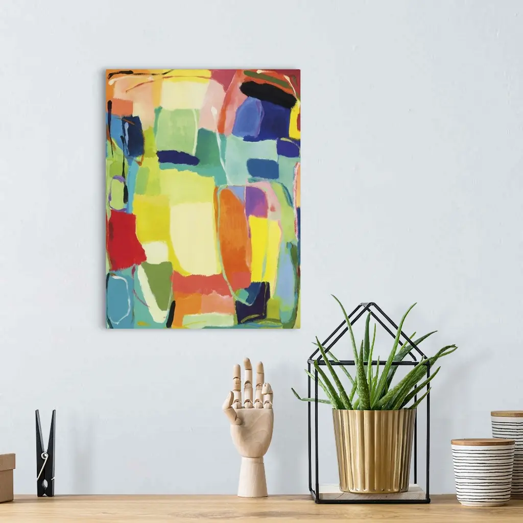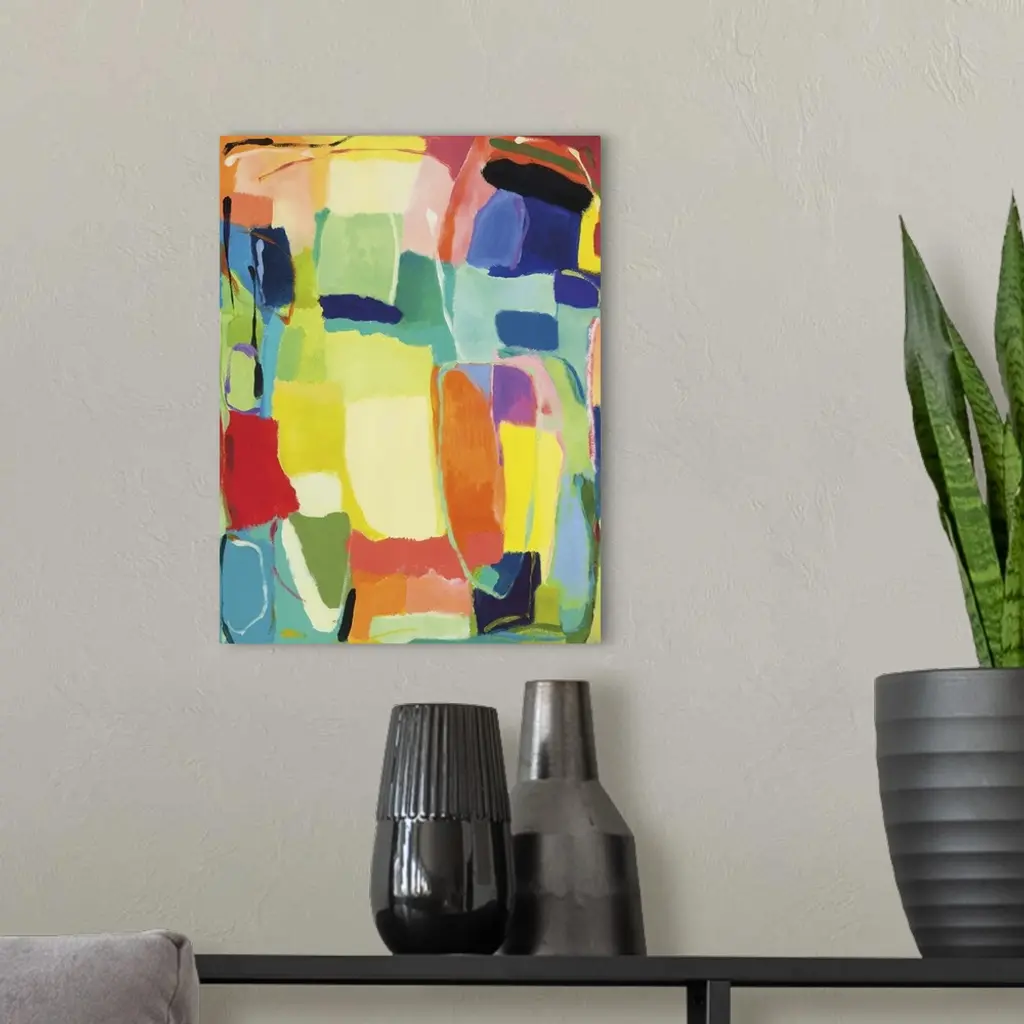 Abstract painting of soft, rounded rectangular shapes in bright, spring-like colors