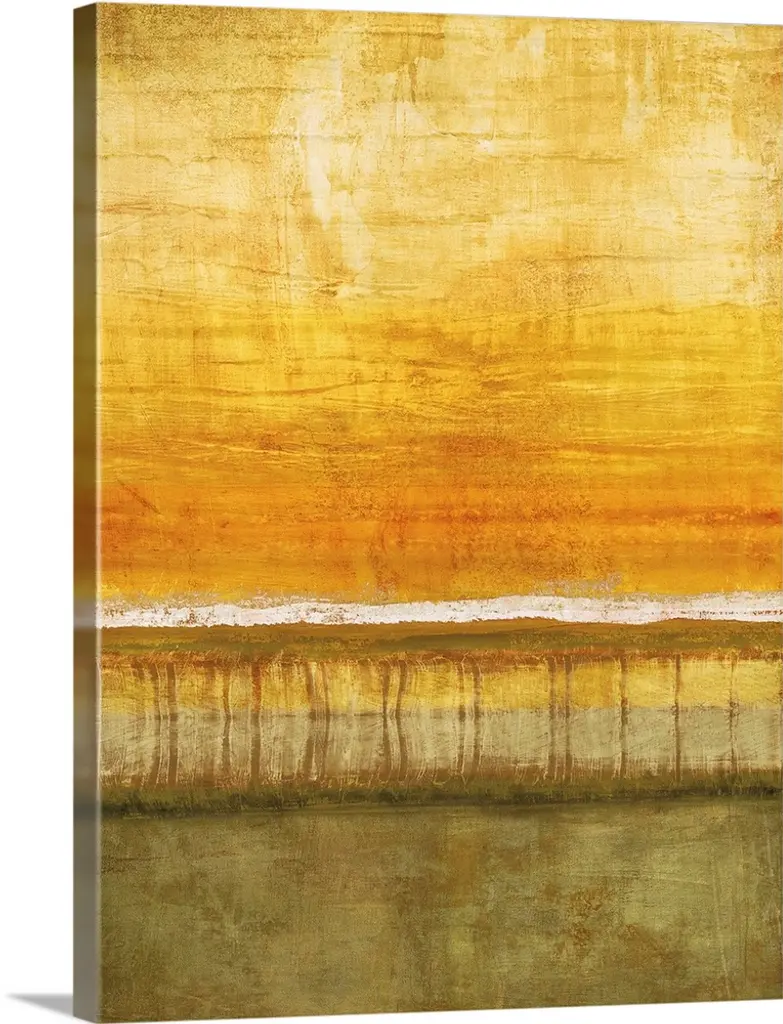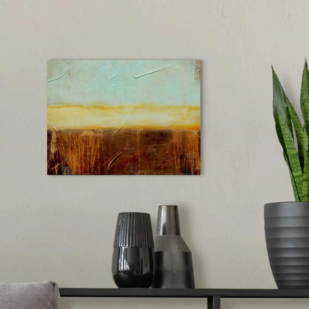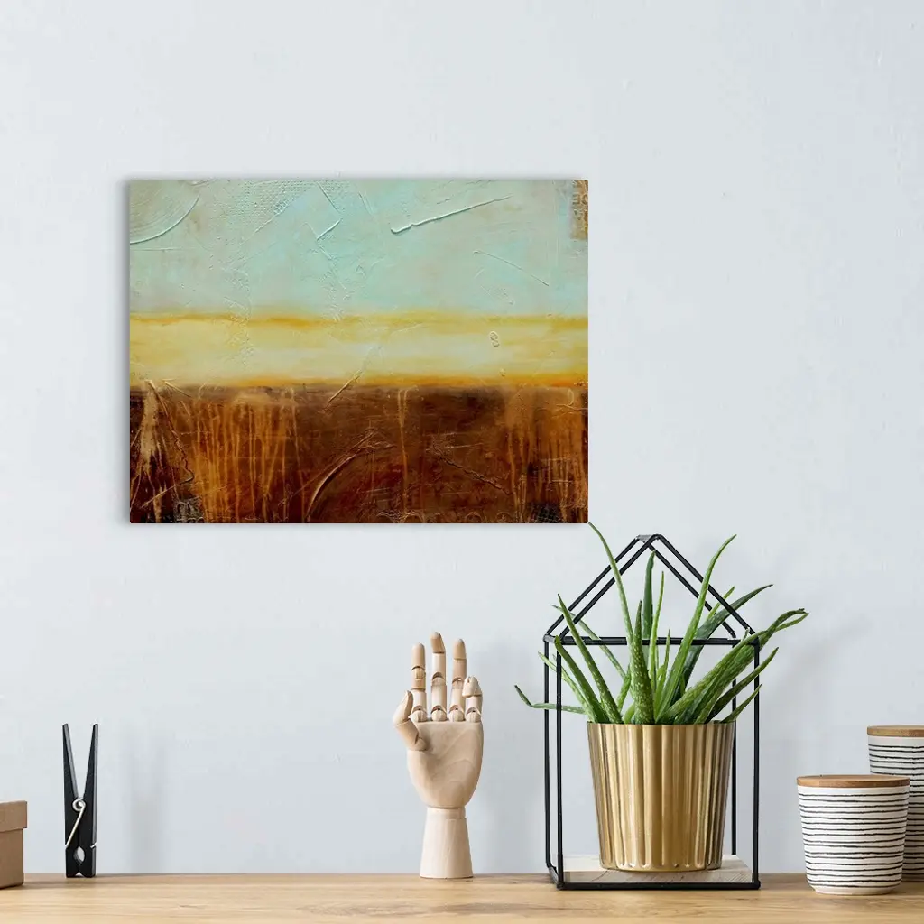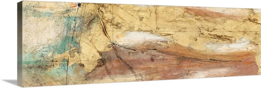 Horizontal abstract painting that is a stack of colors and paint textures.