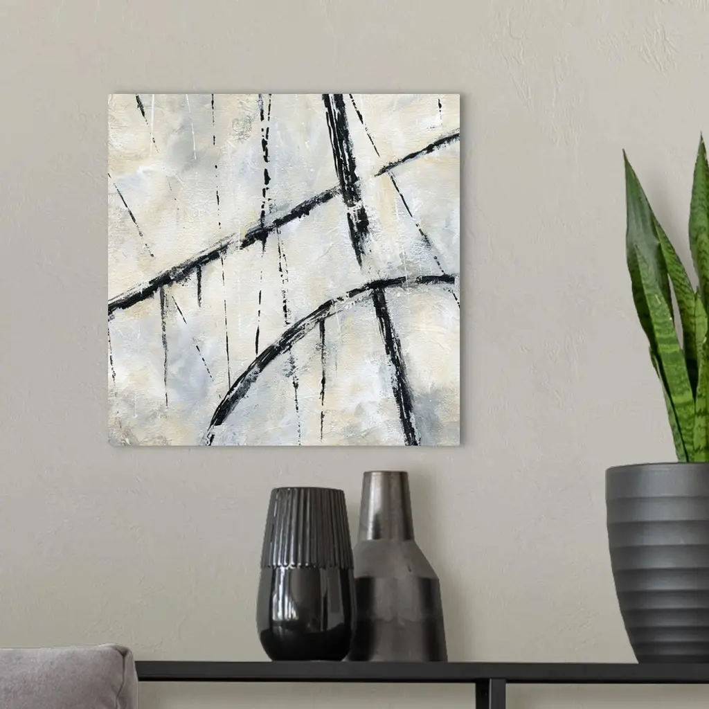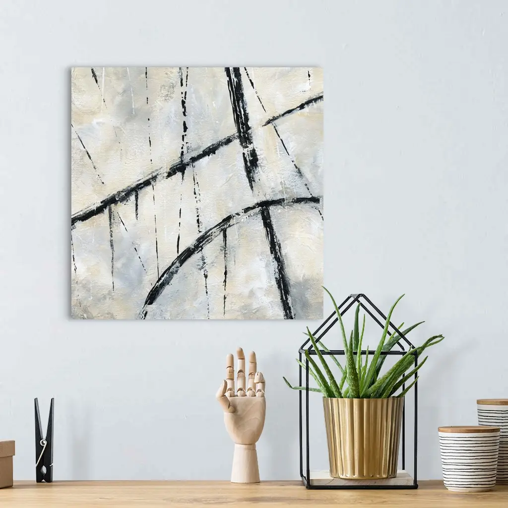 Square abstract painting with bold, black, dripping lines mixed with thin black lines on a white, tan, and gray background.