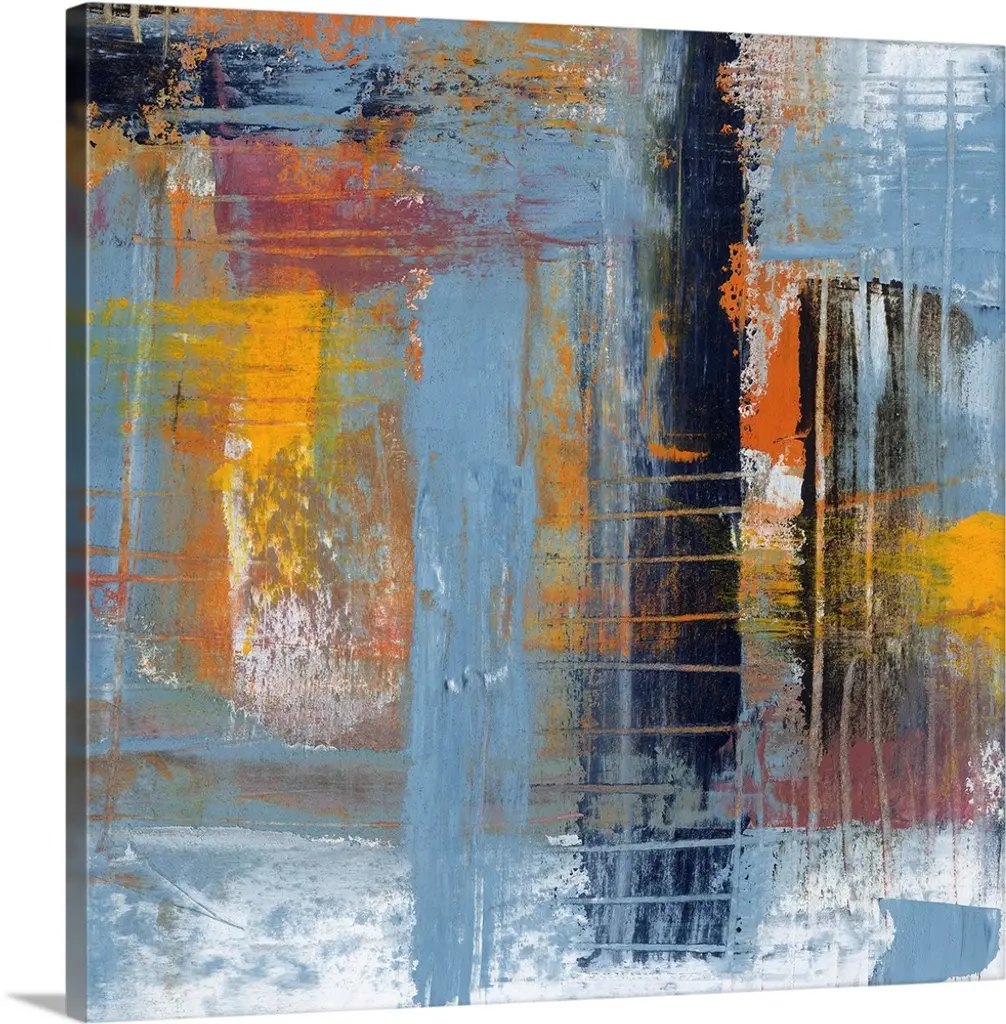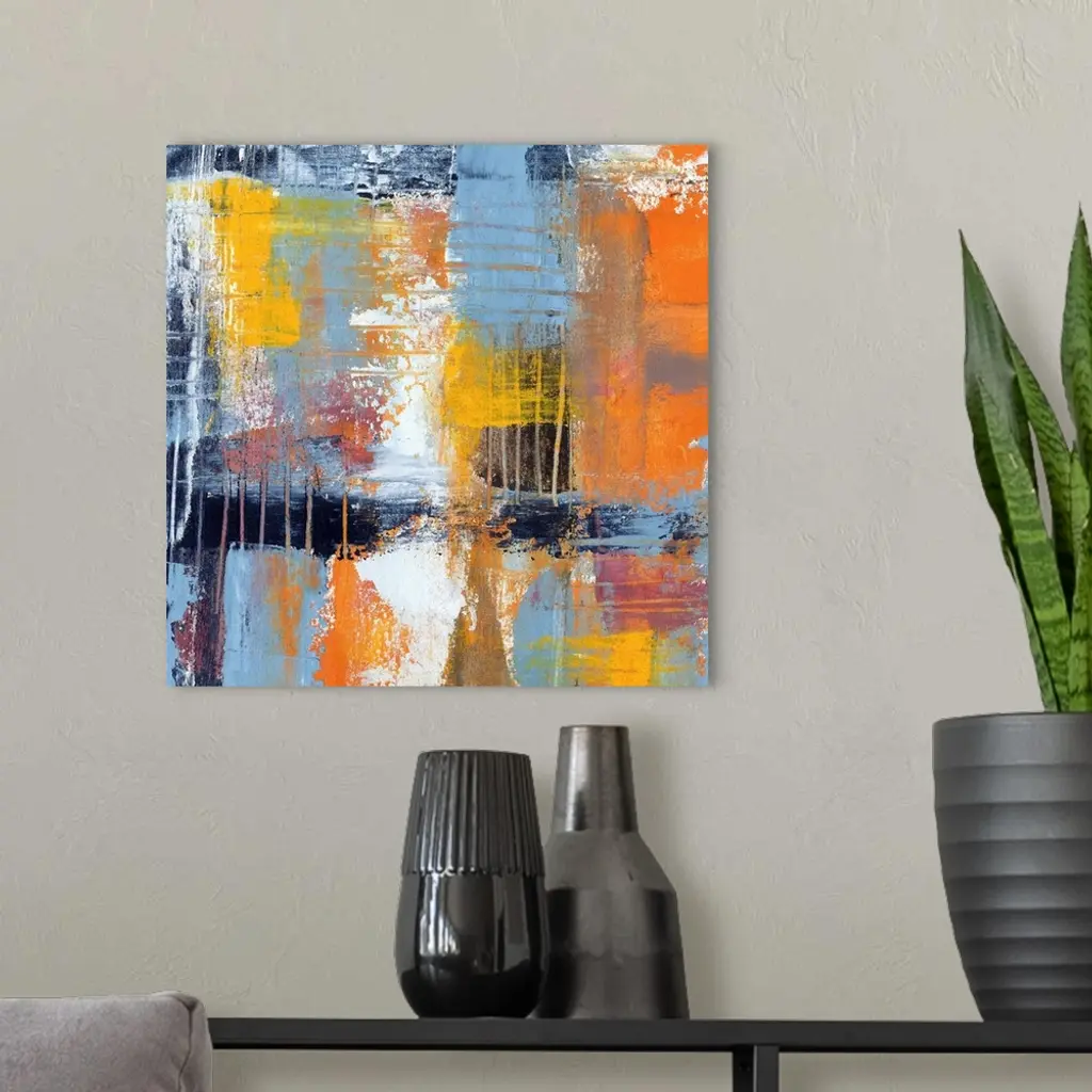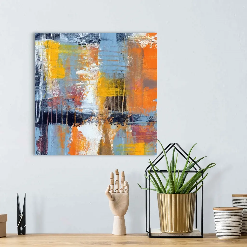 Colorful contemporary abstract painting using muted blue orange and yellow tones.