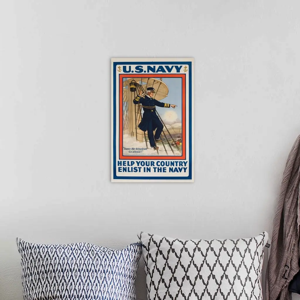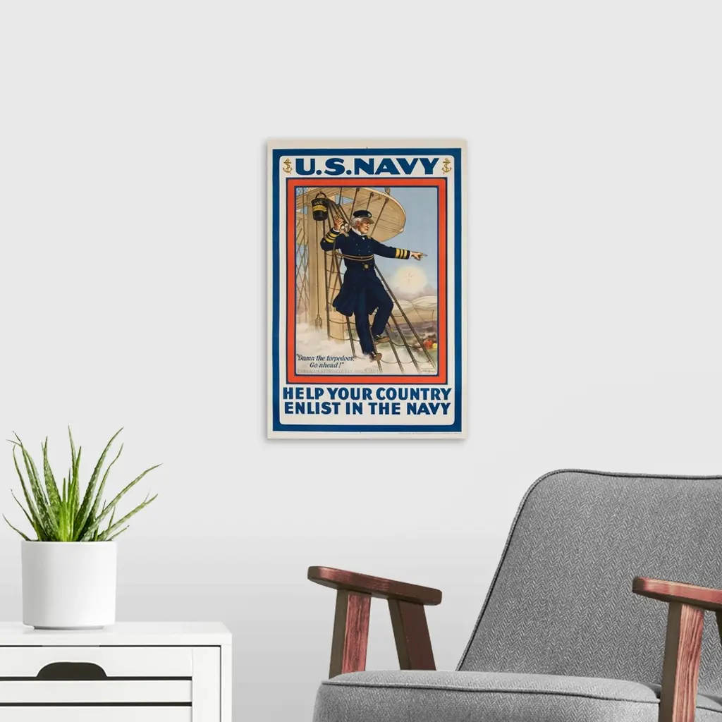 World War I poster. Help Your Country , Enlist in the Navy, Image of Admiral Farragut with the quote, Damn the Torpedos, Go Ahead!