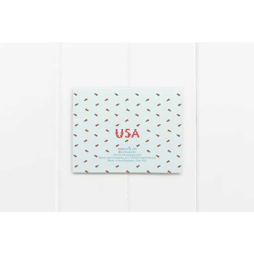 This 8-pack of greeting cards is elegantly illustrated by artist Ingrid Ramus, founder and owner of the Ramus & Co brand. Artwork features a US flag made of flowers. All greeting cards are made in the USA on heavyweight uncoated and locally-sourced and manufactured card stock. Each card is accompanied by a hand-embossed envelope made with heavyweight 95lb paper and a peel-and-stick flap - no licking envelopes here! All Ramus & Co. greeting cards are printed on FSC and SFI certified paper sourced from a regional mill that harnesses 66% of its energy from on-site sustainable sources, such as emission-free hydroelectricity and biomass co-generation from wood waste. All 8 greeting cards come packaged as a boxed set. Husband-and-wife team Calvin and Ingrid Ramus founded Ramus & Company in 2019, in New England, USA. Ingrid, the creative designer behind the brand, originates from Mexico, where she cultivated her skills in fashion and textile design. Drawing from her unique and inquisitive perspective on preppy style, Ingrid prolifically designs whimsical yet classic stationery and lifestyle items.