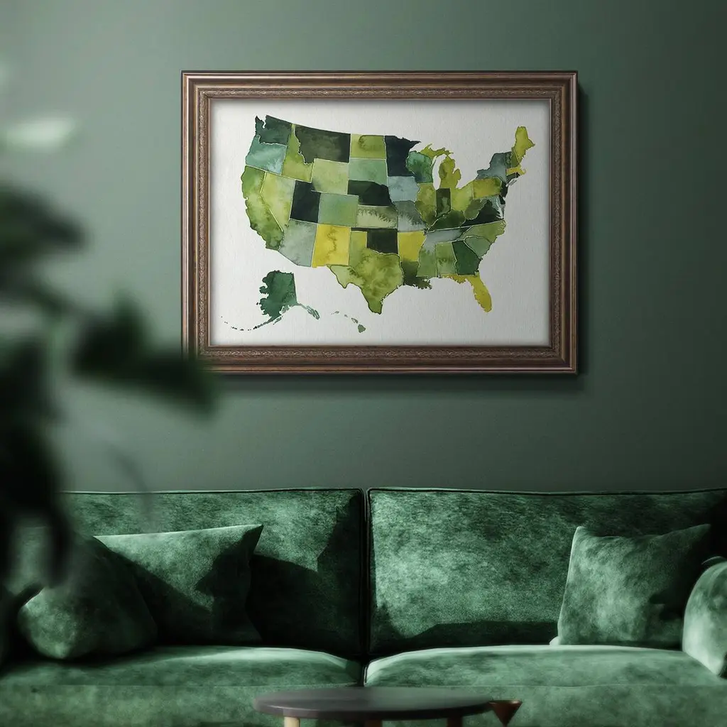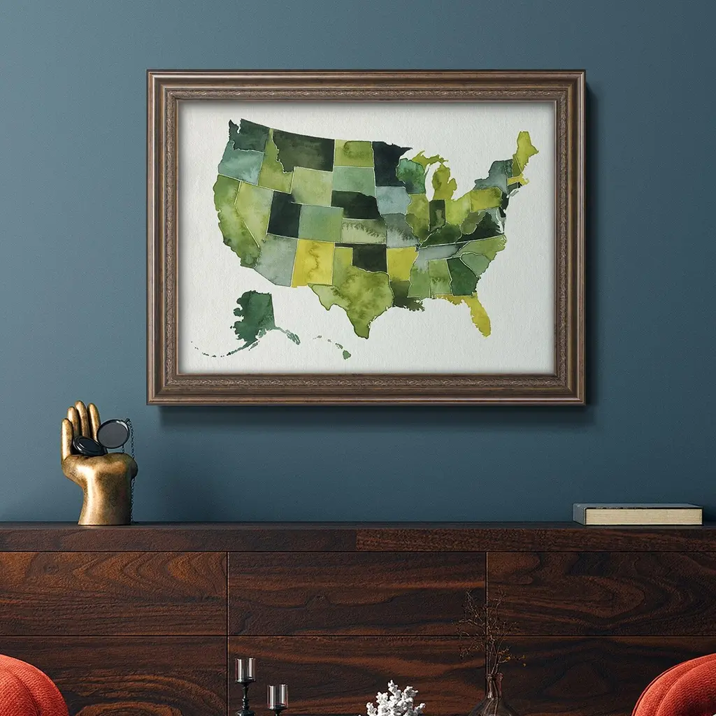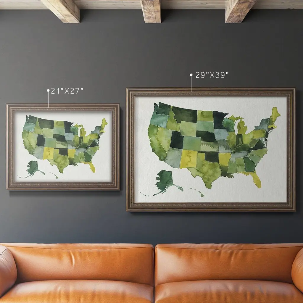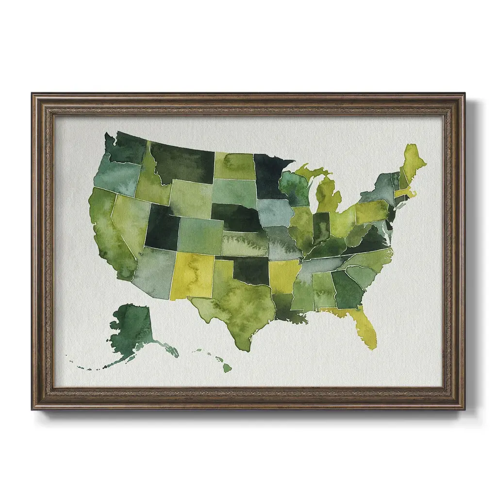 USA in Watercolor I Premium Framed Canvas- Ready to Hang A Premium Framed Canvas created to last. Framed in distressed wood and available in an array of sizes and colors Featuring a beveled a solid wood stretcher bar, each piece comes ready to hand 3 SIZES AVAILABLE 16''X20'' - Overall Size 18'X27'' - Overall Size 24''x36'' - Overall Size Each piece is made to order. Each piece comes with hanging hardware. Made in the USA Ready to Hang Giclee Paper Print Acrylic Glass Beveled Matt Board