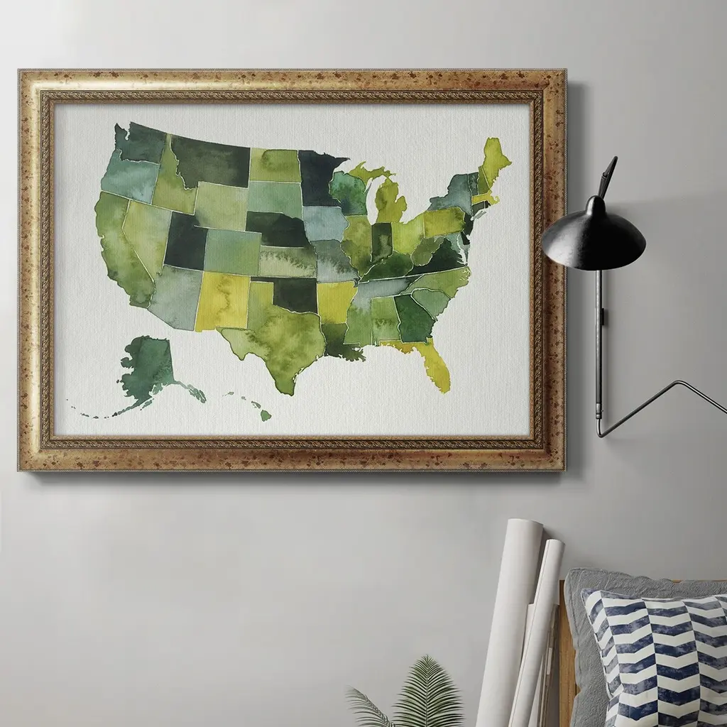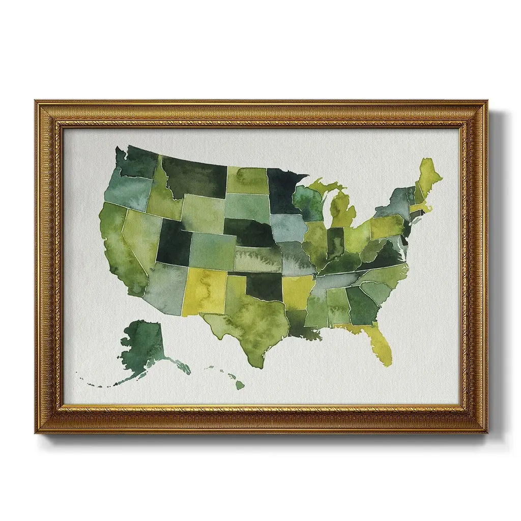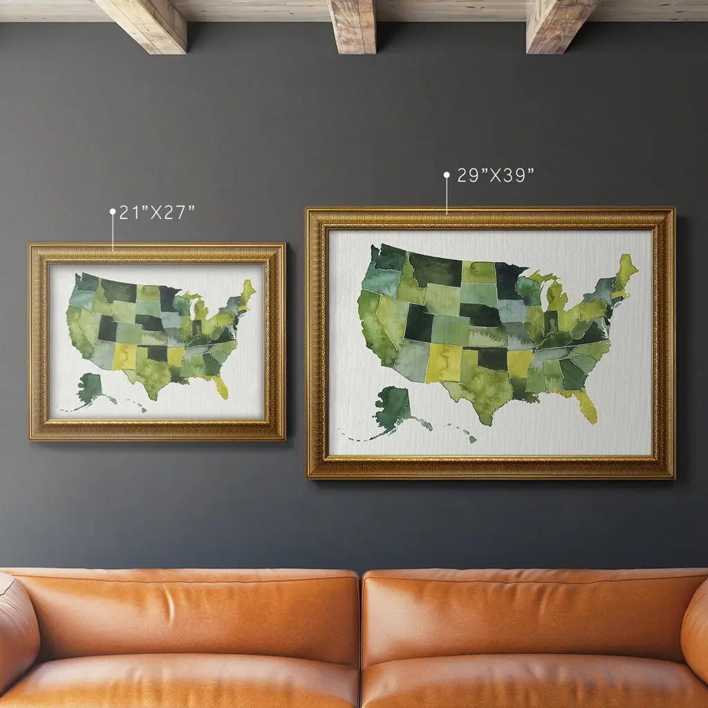 USA in Watercolor I Premium Framed Canvas- Ready to Hang A Premium Framed Canvas created to last. Framed in distressed wood and available in an array of sizes and colors Featuring a beveled a solid wood stretcher bar, each piece comes ready to hand 3 SIZES AVAILABLE 16''X20'' - Overall Size 18'X27'' - Overall Size 24''x36'' - Overall Size Each piece is made to order. Each piece comes with hanging hardware. Made in the USA Ready to Hang Giclee Paper Print Acrylic Glass Beveled Matt Board
