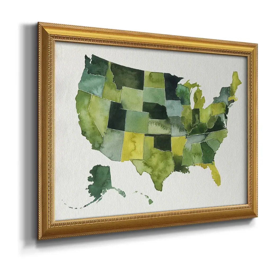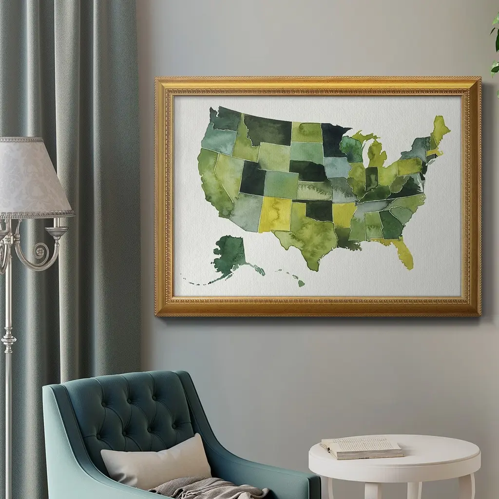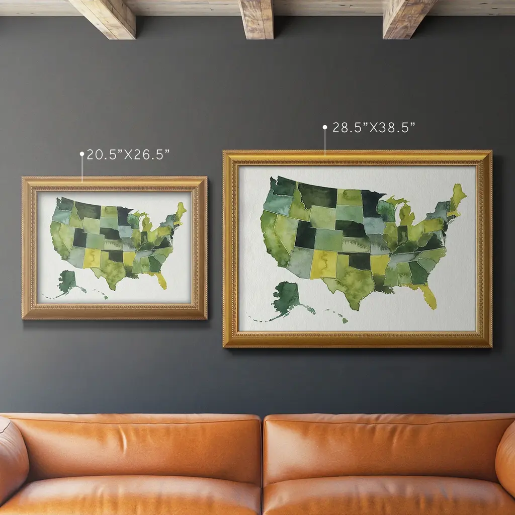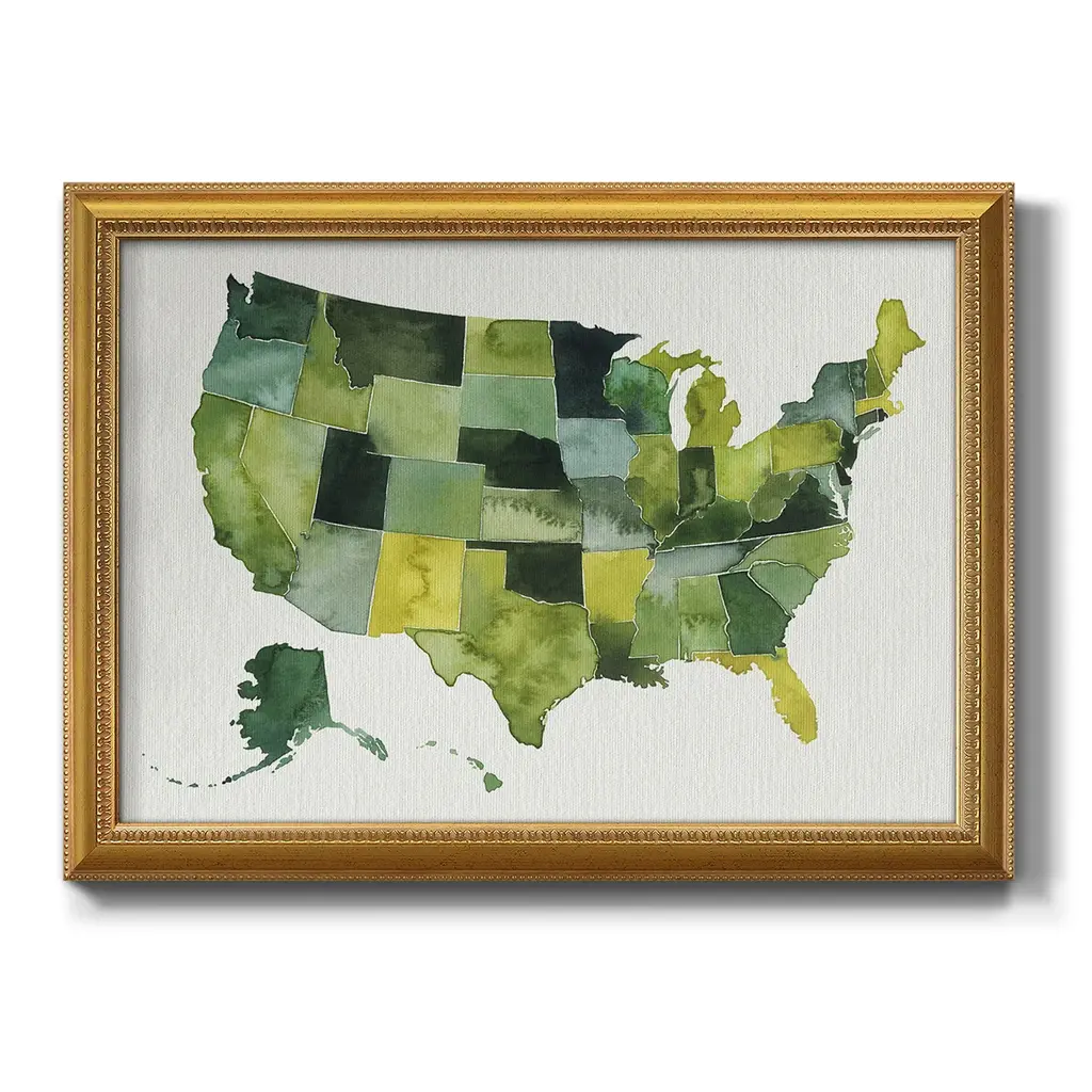 USA in Watercolor I Premium Framed Canvas- Ready to Hang A Premium Framed Canvas created to last. Framed in distressed wood and available in an array of sizes and colors Featuring a beveled a solid wood stretcher bar, each piece comes ready to hand 3 SIZES AVAILABLE 16''X20'' - Overall Size 18'X27'' - Overall Size 24''x36'' - Overall Size Each piece is made to order. Each piece comes with hanging hardware. Made in the USA Ready to Hang Giclee Paper Print Acrylic Glass Beveled Matt Board