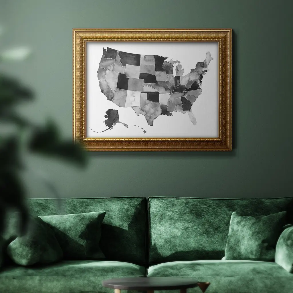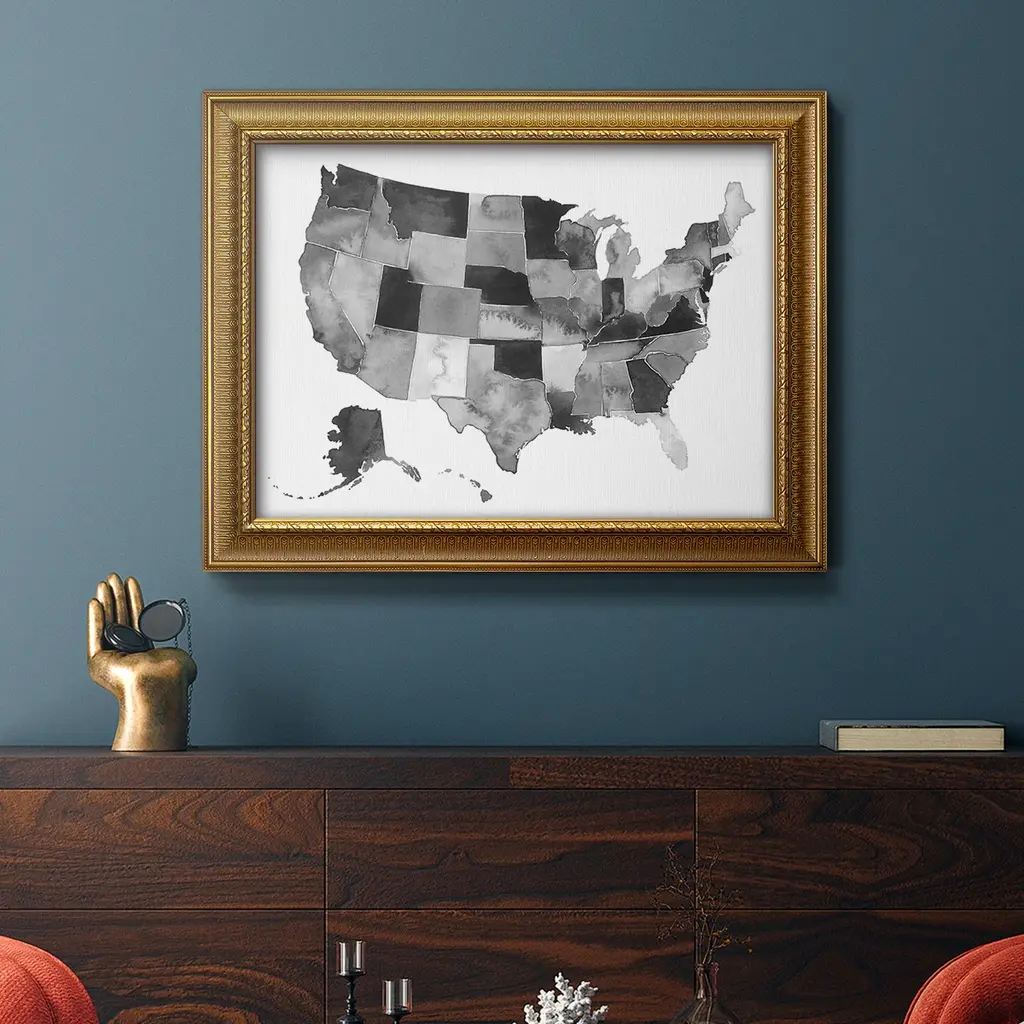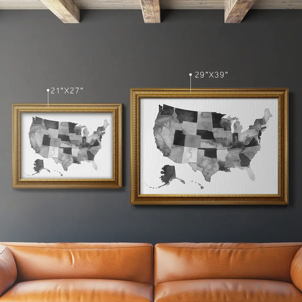 USA in Watercolor II Premium Framed Canvas- Ready to Hang A Premium Framed Canvas created to last. Framed in distressed wood and available in an array of sizes and colors Featuring a beveled a solid wood stretcher bar, each piece comes ready to hand 3 SIZES AVAILABLE 16''X20'' - Overall Size 18'X27'' - Overall Size 24''x36'' - Overall Size Each piece is made to order. Each piece comes with hanging hardware. Made in the USA Ready to Hang Giclee Paper Print Acrylic Glass Beveled Matt Board