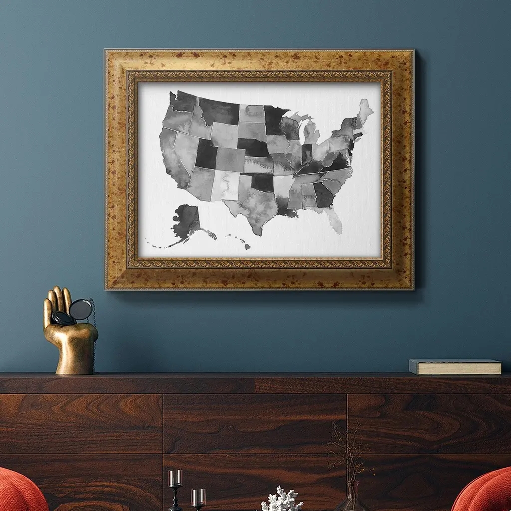 USA in Watercolor II Premium Framed Canvas- Ready to Hang A Premium Framed Canvas created to last. Framed in distressed wood and available in an array of sizes and colors Featuring a beveled a solid wood stretcher bar, each piece comes ready to hand 3 SIZES AVAILABLE 16''X20'' - Overall Size 18'X27'' - Overall Size 24''x36'' - Overall Size Each piece is made to order. Each piece comes with hanging hardware. Made in the USA Ready to Hang Giclee Paper Print Acrylic Glass Beveled Matt Board