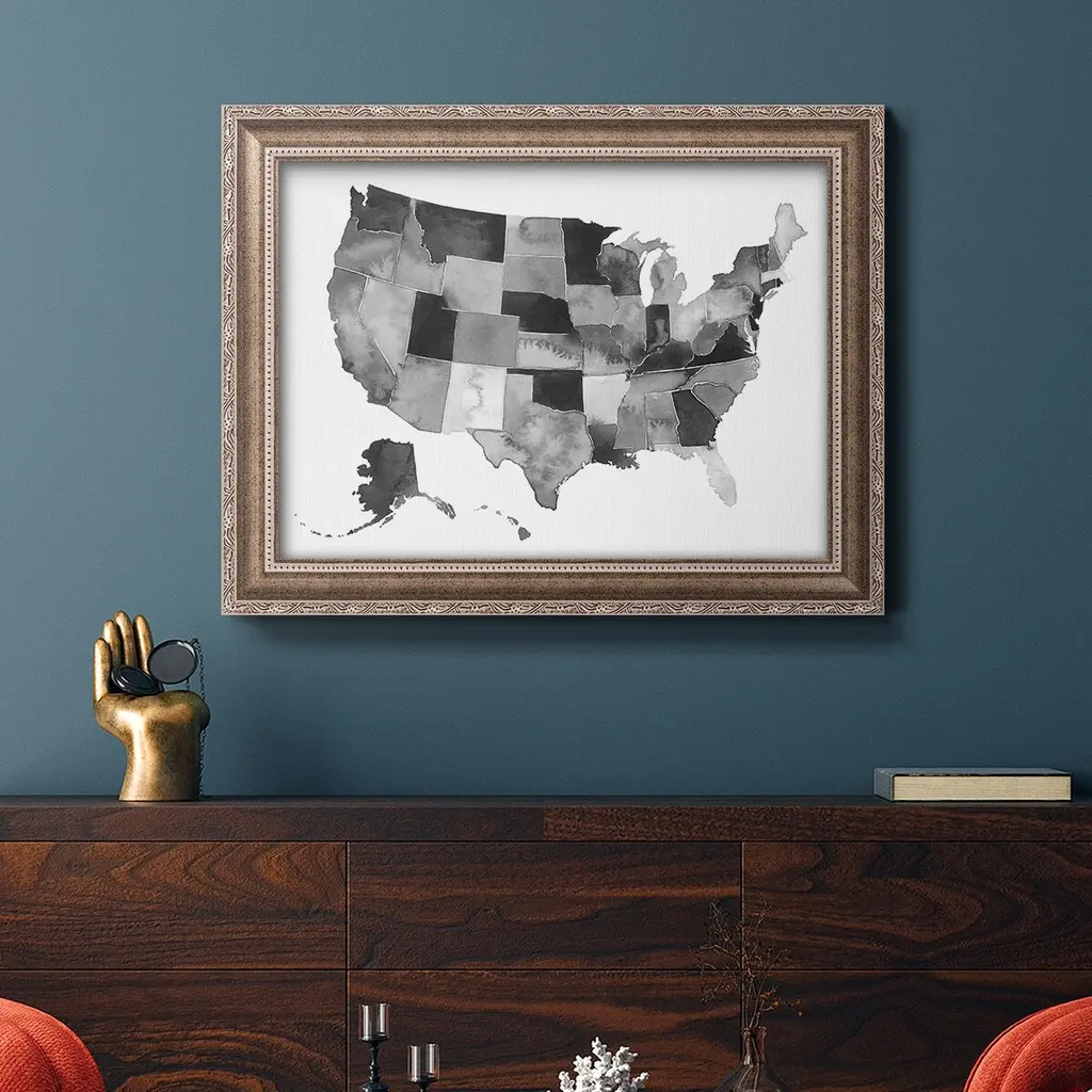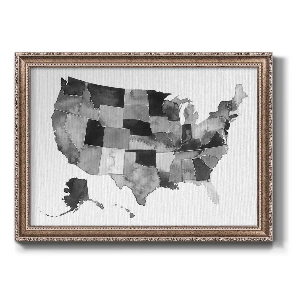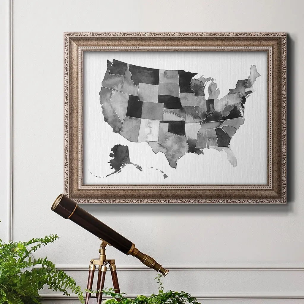 USA in Watercolor II Premium Framed Canvas- Ready to Hang A Premium Framed Canvas created to last. Framed in distressed wood and available in an array of sizes and colors Featuring a beveled a solid wood stretcher bar, each piece comes ready to hand 3 SIZES AVAILABLE 16''X20'' - Overall Size 18'X27'' - Overall Size 24''x36'' - Overall Size Each piece is made to order. Each piece comes with hanging hardware. Made in the USA Ready to Hang Giclee Paper Print Acrylic Glass Beveled Matt Board