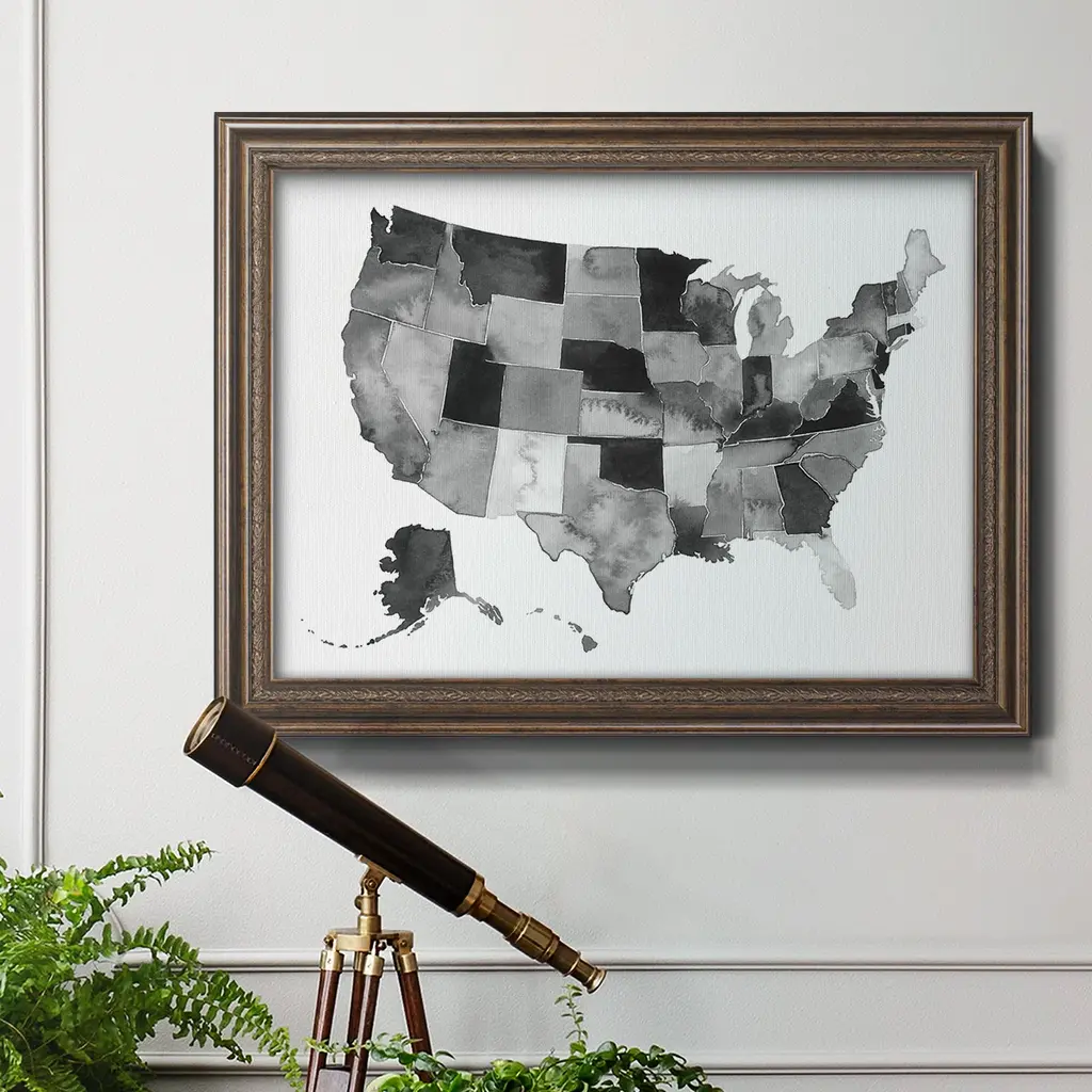 USA in Watercolor II Premium Framed Canvas- Ready to Hang A Premium Framed Canvas created to last. Framed in distressed wood and available in an array of sizes and colors Featuring a beveled a solid wood stretcher bar, each piece comes ready to hand 3 SIZES AVAILABLE 16''X20'' - Overall Size 18'X27'' - Overall Size 24''x36'' - Overall Size Each piece is made to order. Each piece comes with hanging hardware. Made in the USA Ready to Hang Giclee Paper Print Acrylic Glass Beveled Matt Board