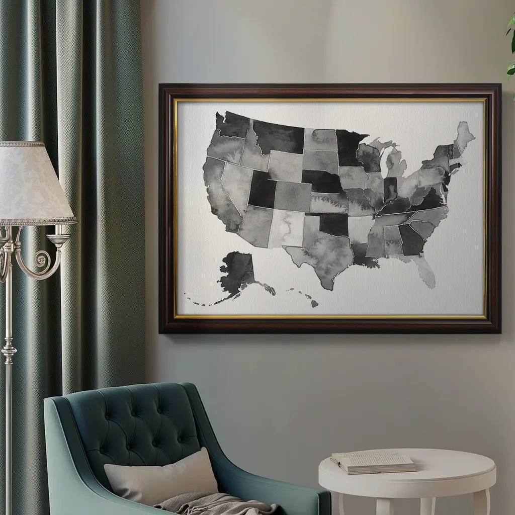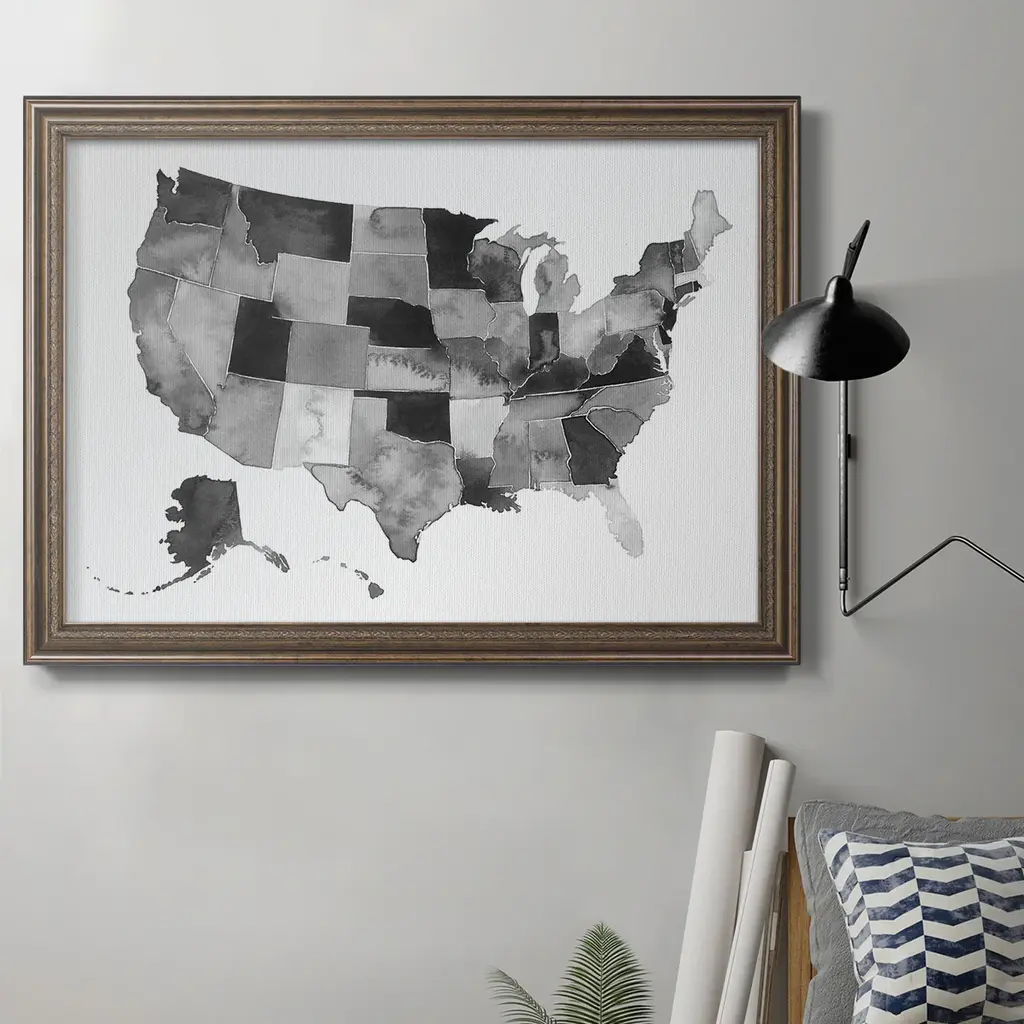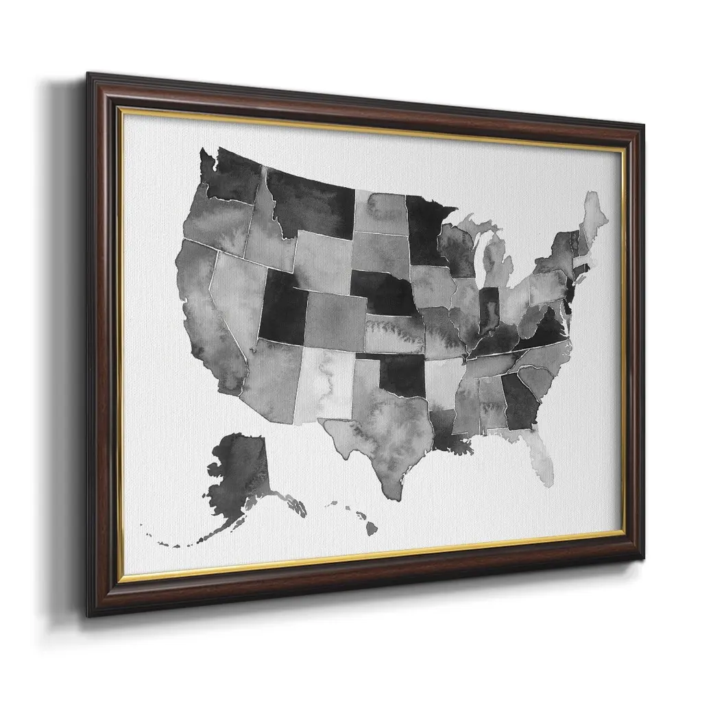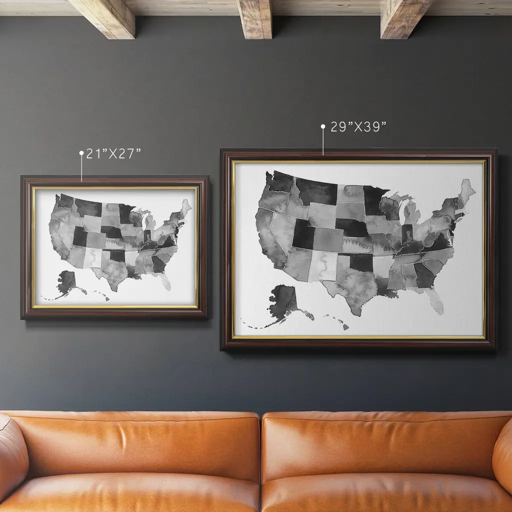 USA in Watercolor II Premium Framed Canvas- Ready to Hang A Premium Framed Canvas created to last. Framed in distressed wood and available in an array of sizes and colors Featuring a beveled a solid wood stretcher bar, each piece comes ready to hand 3 SIZES AVAILABLE 16''X20'' - Overall Size 18'X27'' - Overall Size 24''x36'' - Overall Size Each piece is made to order. Each piece comes with hanging hardware. Made in the USA Ready to Hang Giclee Paper Print Acrylic Glass Beveled Matt Board