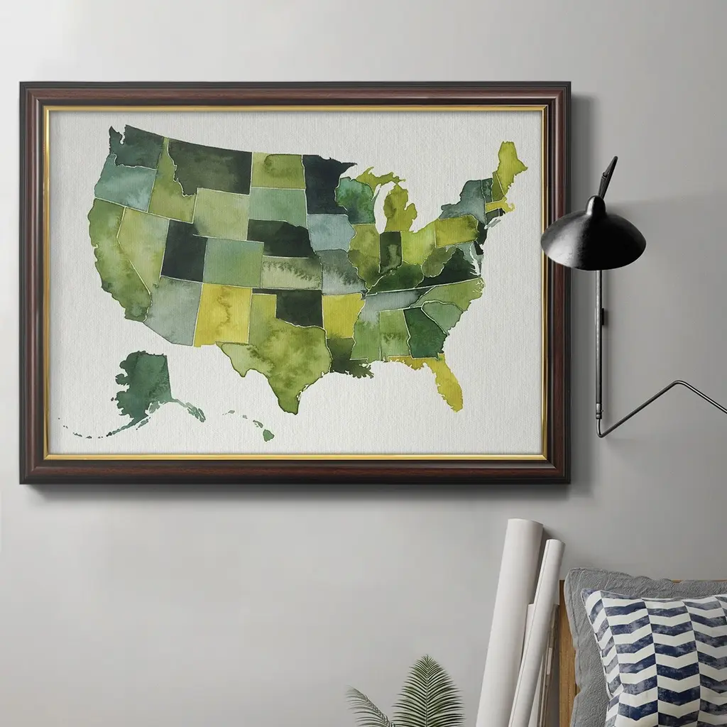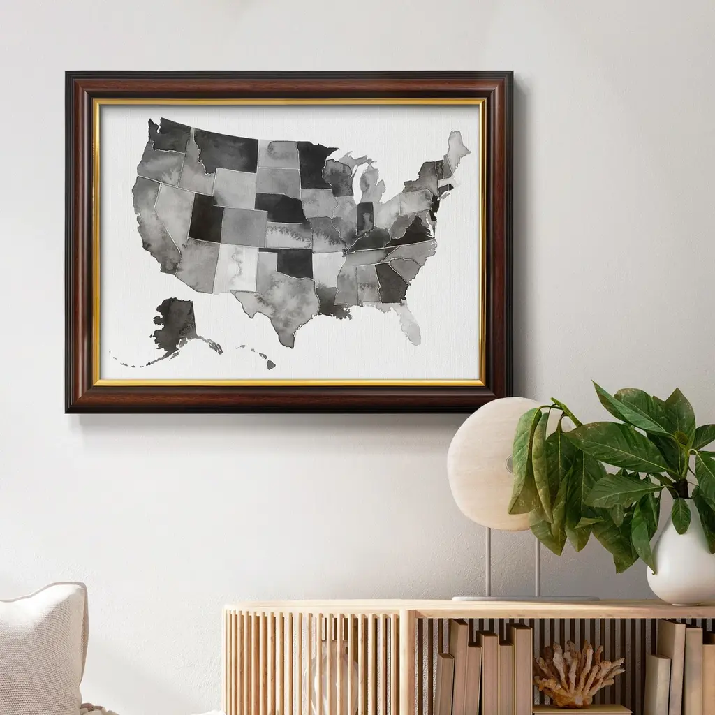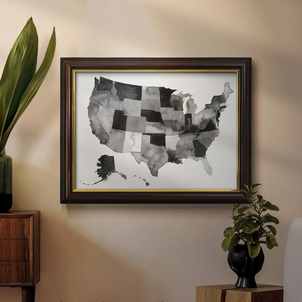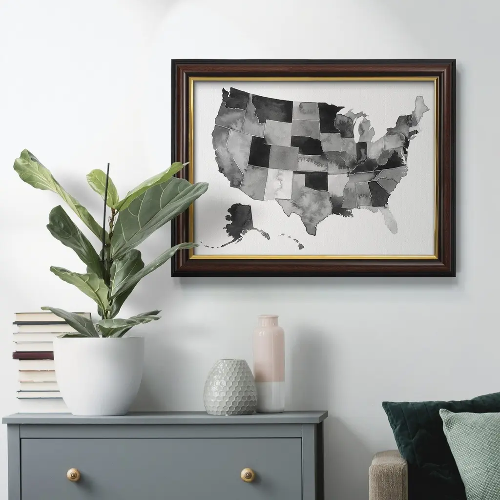 USA in Watercolor II Premium Framed Canvas- Ready to Hang A Premium Framed Canvas created to last. Framed in distressed wood and available in an array of sizes and colors Featuring a beveled a solid wood stretcher bar, each piece comes ready to hand 3 SIZES AVAILABLE 16''X20'' - Overall Size 18'X27'' - Overall Size 24''x36'' - Overall Size Each piece is made to order. Each piece comes with hanging hardware. Made in the USA Ready to Hang Giclee Paper Print Acrylic Glass Beveled Matt Board