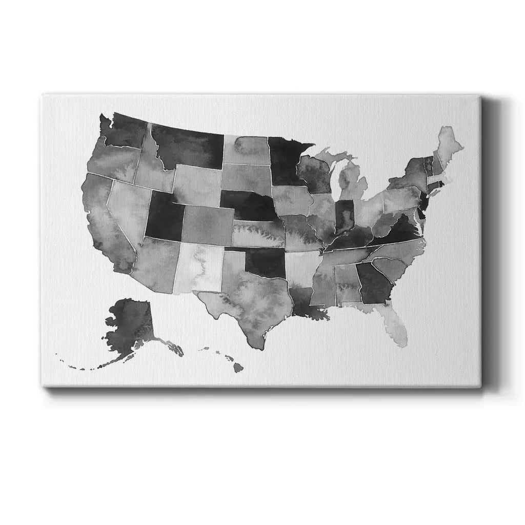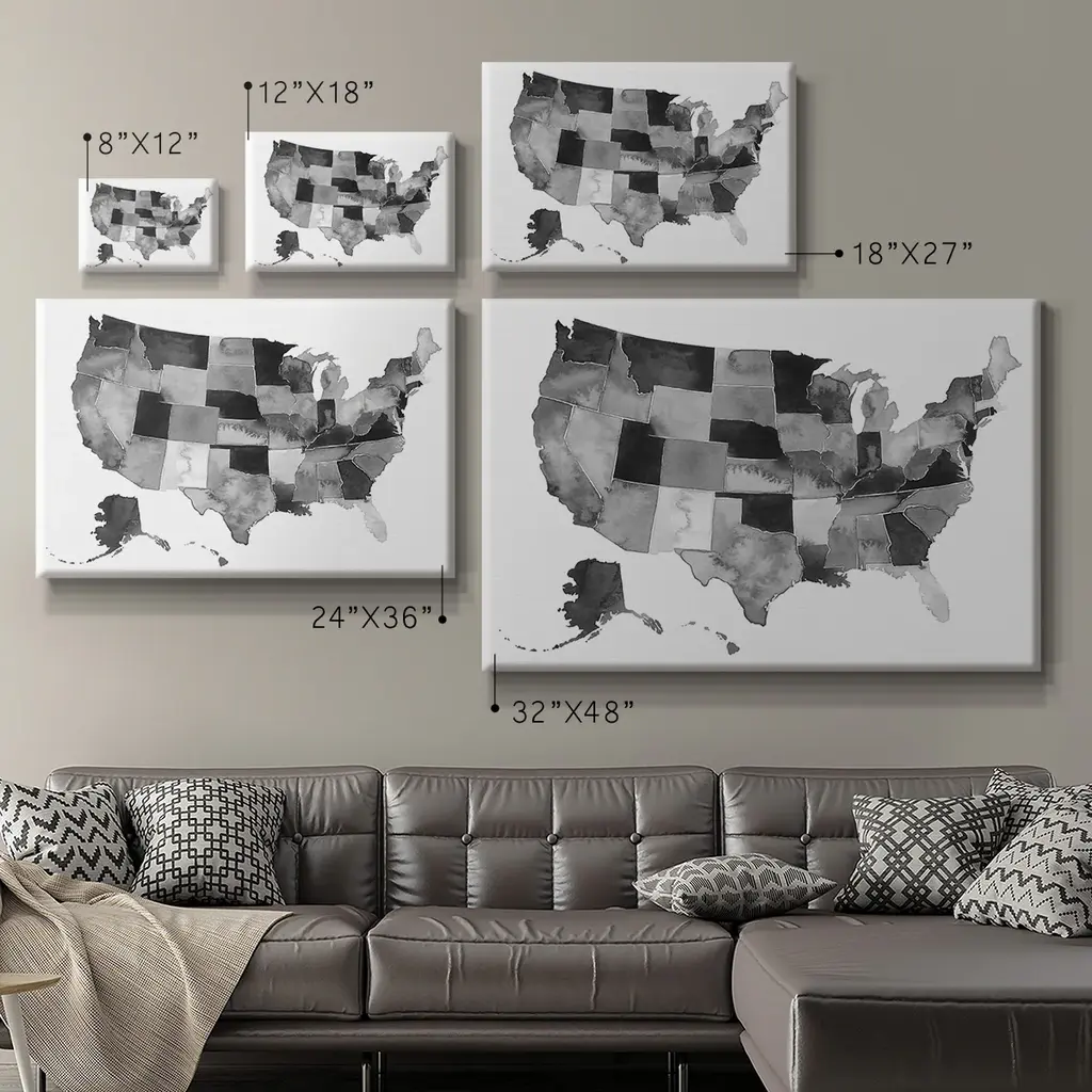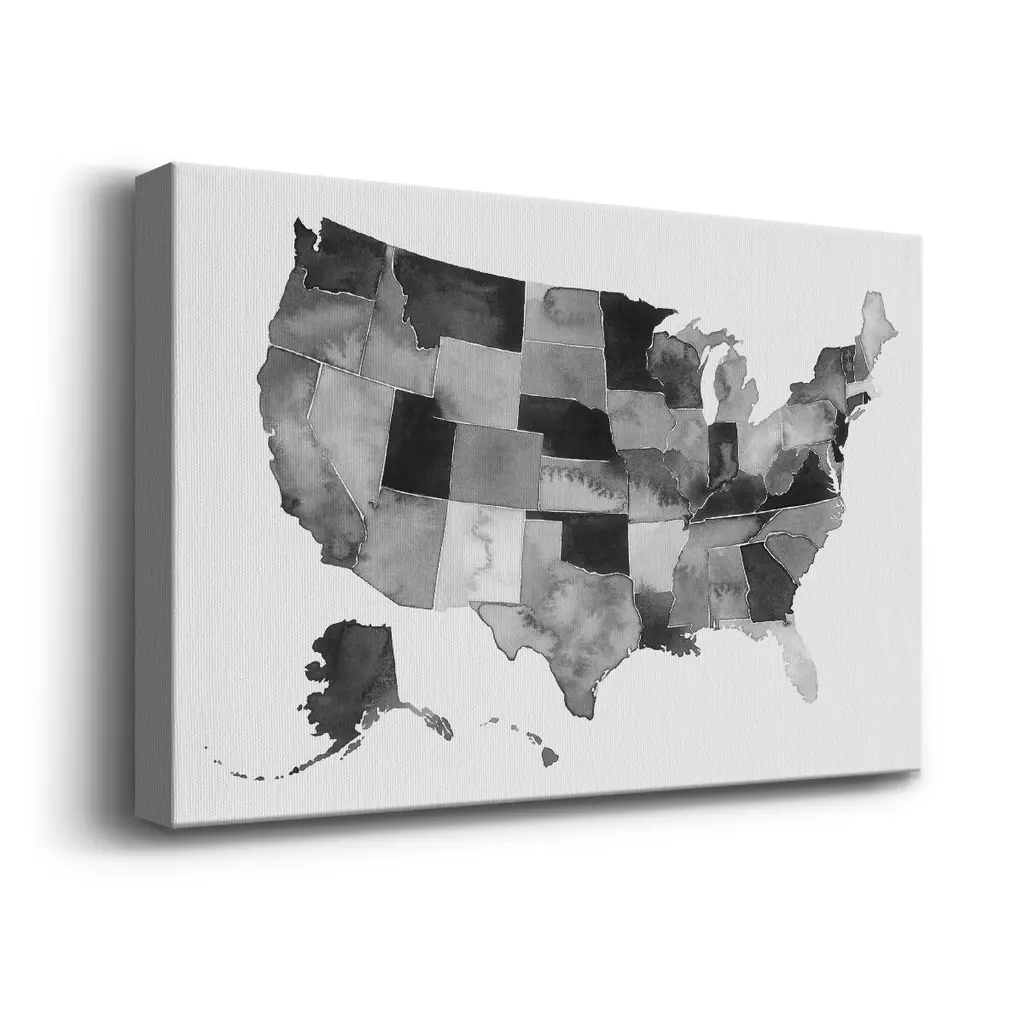 USA in Watercolor II Premium Gallery Wrapped Canvas - Ready to Hang A premium hand stretched gallery wrapped canvas print created to last. Featuring a beveled a solid wood stretcher bar, each piece comes ready to hand 6 SIZES AVAILABLE 8''X12'' - Overall Size 12''X18'' - Overall Size 18''X27'' - Overall Size 24''x36'' - Overall Size 32''x48'' - Overall Size 40''x60'' - Overall Size Each piece is made to order. Built to Last Each piece comes ready to hang Solid wood stretcher Fade and Water resistant Made domestically
