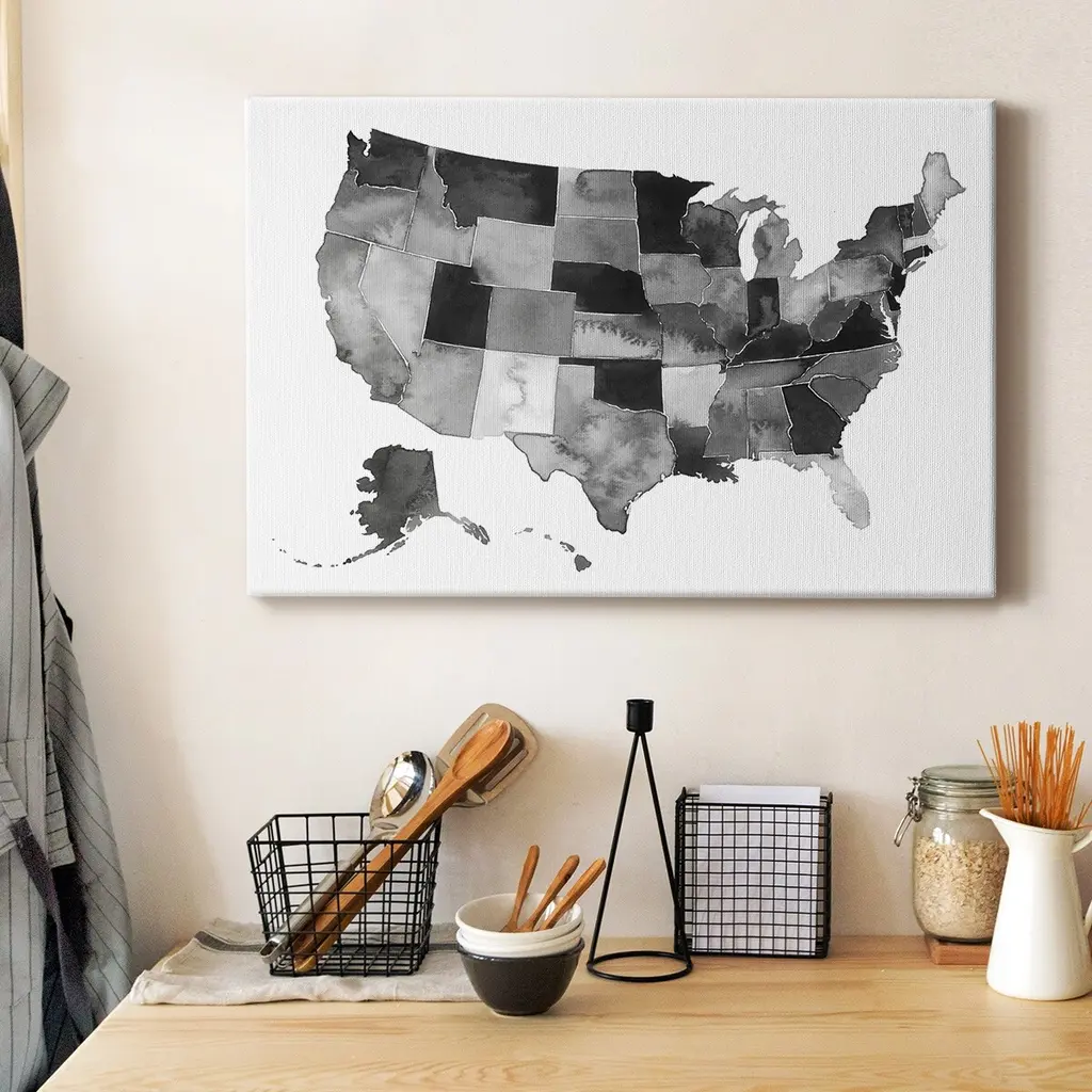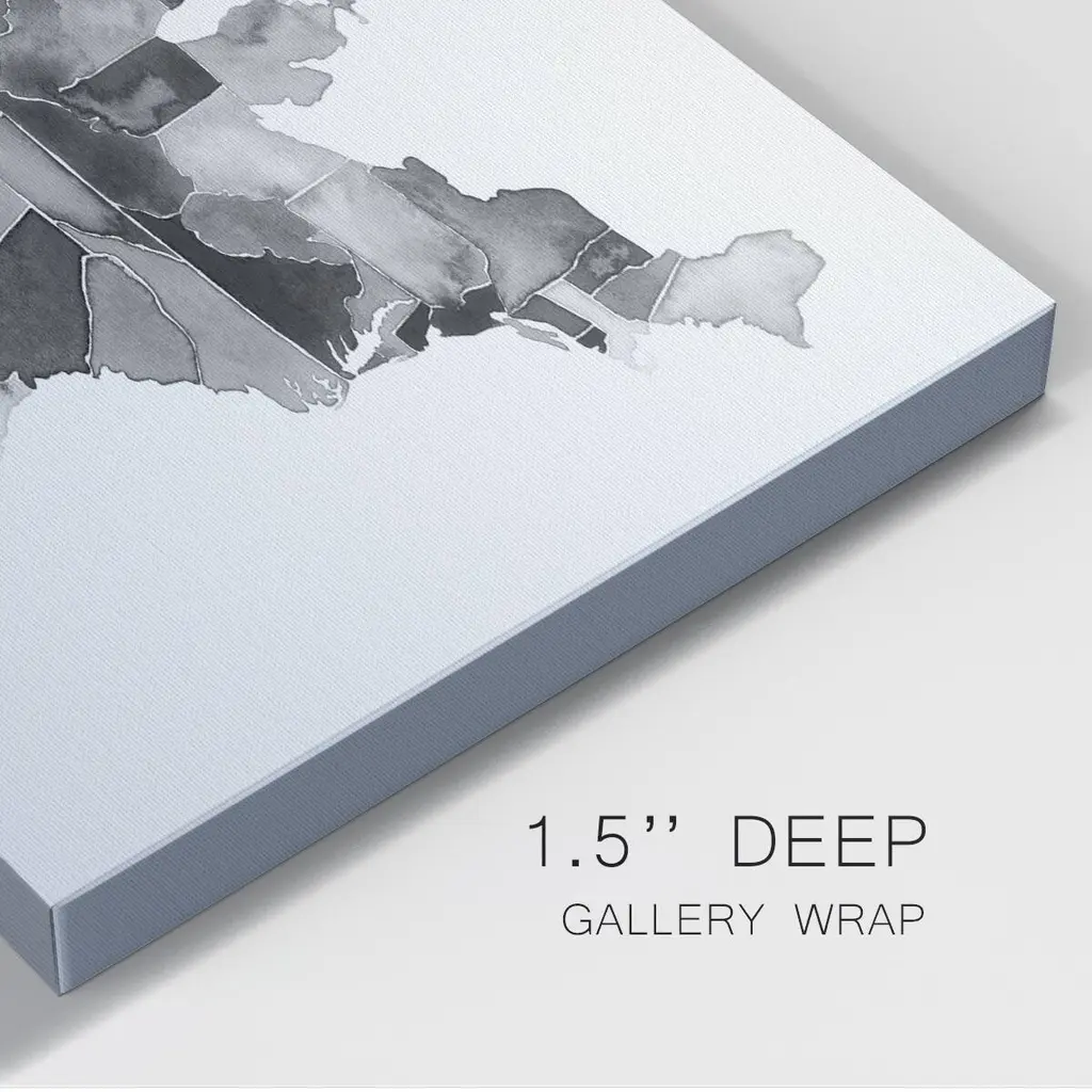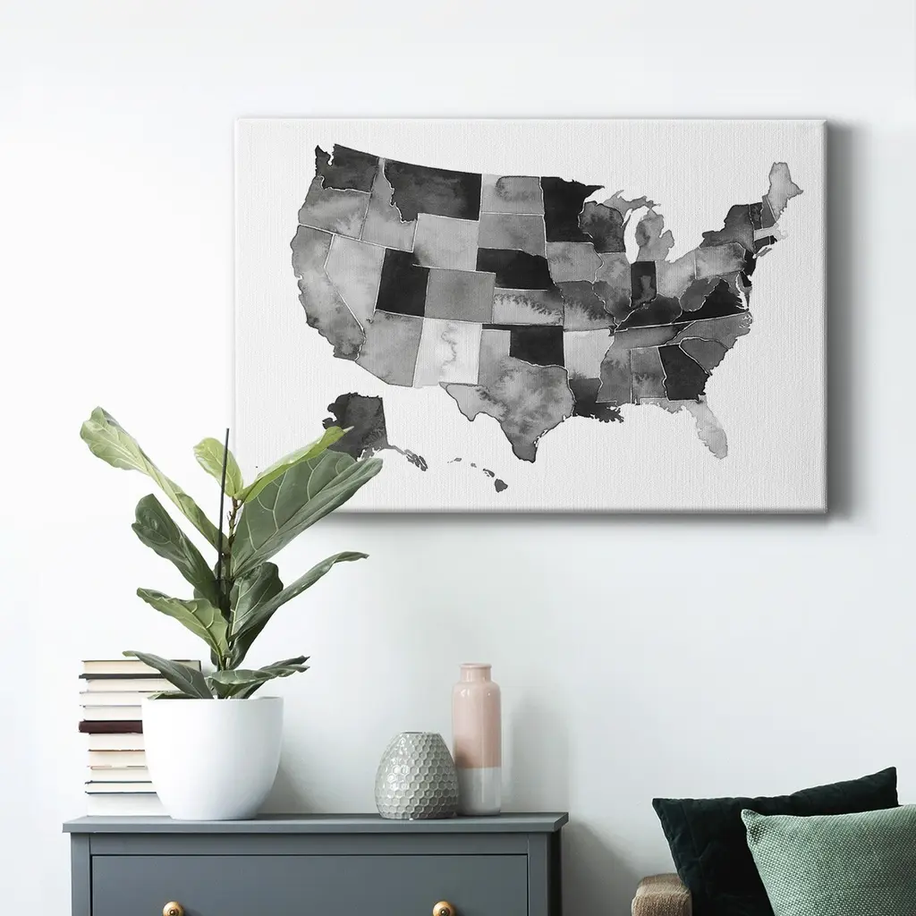 USA in Watercolor II Premium Gallery Wrapped Canvas - Ready to Hang A premium hand stretched gallery wrapped canvas print created to last. Featuring a beveled a solid wood stretcher bar, each piece comes ready to hand 6 SIZES AVAILABLE 8''X12'' - Overall Size 12''X18'' - Overall Size 18''X27'' - Overall Size 24''x36'' - Overall Size 32''x48'' - Overall Size 40''x60'' - Overall Size Each piece is made to order. Built to Last Each piece comes ready to hang Solid wood stretcher Fade and Water resistant Made domestically