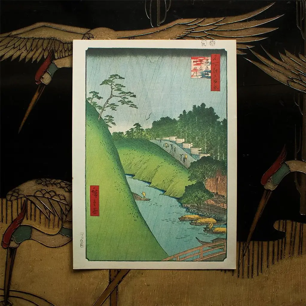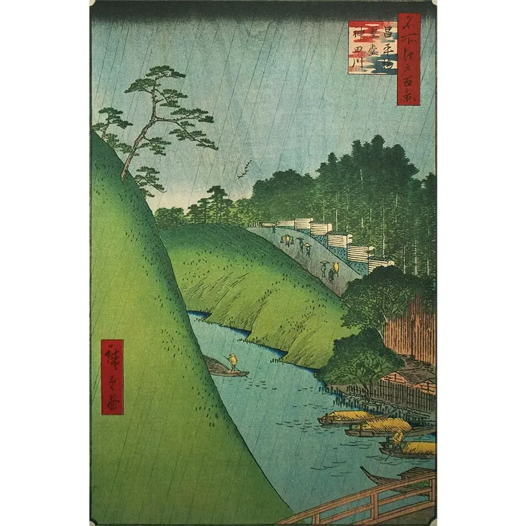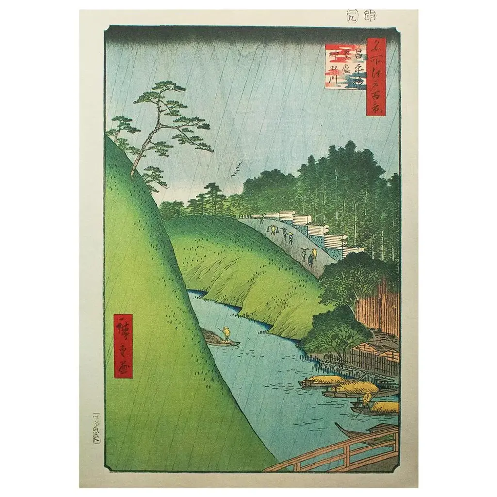 A rare vintage reproduction print after Utagawa Hiroshige I, also known as Ando Hiroshige (1797 - 1858), "Shōhei Bridge, Seidō, Kanda River", from the series Meisho Edo hyakkei (100 famous views of Edo), 1857. Signed Hiroshige ga. This is not a woodblock reproduction print, but a quality offset print. Good colors, heavy paper. Comes from an old collection of Japanese woodblock prints from North New Jersey estate. Japan, circa 1940s. We have 80-90 prints from One Hundred Views of Edo in our collection and we will be regularly adding them to our Print Shop. Ando Hiroshige (1797 - October 12, 1858) was born in 1797 under the name of Ando Tokutaro in Edo (Tokyo) as the son of a samurai and fireman. He became one of the greatest masters of ukiyo-e (Japanese woodblock prints), especially in the genre of Japanese landscape prints. At the age of twelve, both his parents died. Two years later, in 1811, the young Hiroshige received a chance to join the famous Utagawa painting school. At that time, the ukiyo-e master Toyohiro Utagawa was the head of the studio. In 1812 he was formally allowed to take the name Utagawa. From then on he called himself Utagawa Hiroshige. In the ukiyo-e literature he is usually referenced as Hiroshige Ando. The first work by Utagawa Hiroshige was a book illustration published in 1818, when he was 21 years old. Until 1830, Hiroshige created prints in the traditional style learned from his master Toyohiro Utagawa. His early commissions were book illustrations. Typical subjects out of that time are kabuki actors prints, beautiful women and a few warrior prints. From 1830 on, Hiroshige Utagawa tried his luck with a new genre - landscape prints. One of his great masterpieces is the series Tokaido gojusan-tsugi no uchi created from 1833 to 1834 with 55 Hiroshige prints in oban format. In the literature you will find slightly varying English translations like Fifty-three Stages of the Tokaido or From the Fifty-three Stations of the Tokaido. The Tokaido was a coastal highway connecting Edo with Kyoto, the residence of the emperor. The stations must be imagined as a kind of turn-pikes where tolls had to be paid. The stations had lodges and simple restaurants where travelers could spend the night and get a meal. The Fifty-three Stations of the Tokaido became the basis of Hiroshige's fame and commercial success. For the next twenty years he concentrated his efforts on landscape prints. Ukiyo-e publishing in the last century was not a cultural institution subsidized by public funds, but rather a commercial business like book publishing or a movie production in our time. And when a film turns out to become a big success, the public is asking for more, and the producer is only too happy to prepare the next follow-up. Print publishing in the Edo period was not different. And so Hiroshige Utagawa produced more series of the Tokaido. Other famous series produced by Utagawa Hiroshige are: Famous Places of the Eastern Capital (meaning Edo). Famous Places of Kyoto. Famous Places in the Sixty-Odd Provinces. Sixty-nine Stations of the Kiso Highway. Eight Views of Lake Biwa. Thirty-Six Views of Mount Fuji. His last great series Meisho Edo Hyakkei, One Hundred Famous Views of Edo is considered as one of his greatest masterpieces. During his lifetime, Ando Hiroshige was well known and commercially successful. But the Japanese society did not take too much notice of him. Comparable to Utamaro, his real reputation started with his discovery in Europe. The late Hiroshige prints are considered as lower in quality. He had produced too many and too fast in order to meet the demand of the market. Hiroshige Utagawa died at the age of 62 of cholera on October 12, 1858 in Edo. With an output of an estimated 5,400 prints, Ando Hiroshige was one of the prolific artists of ukiyo-e.