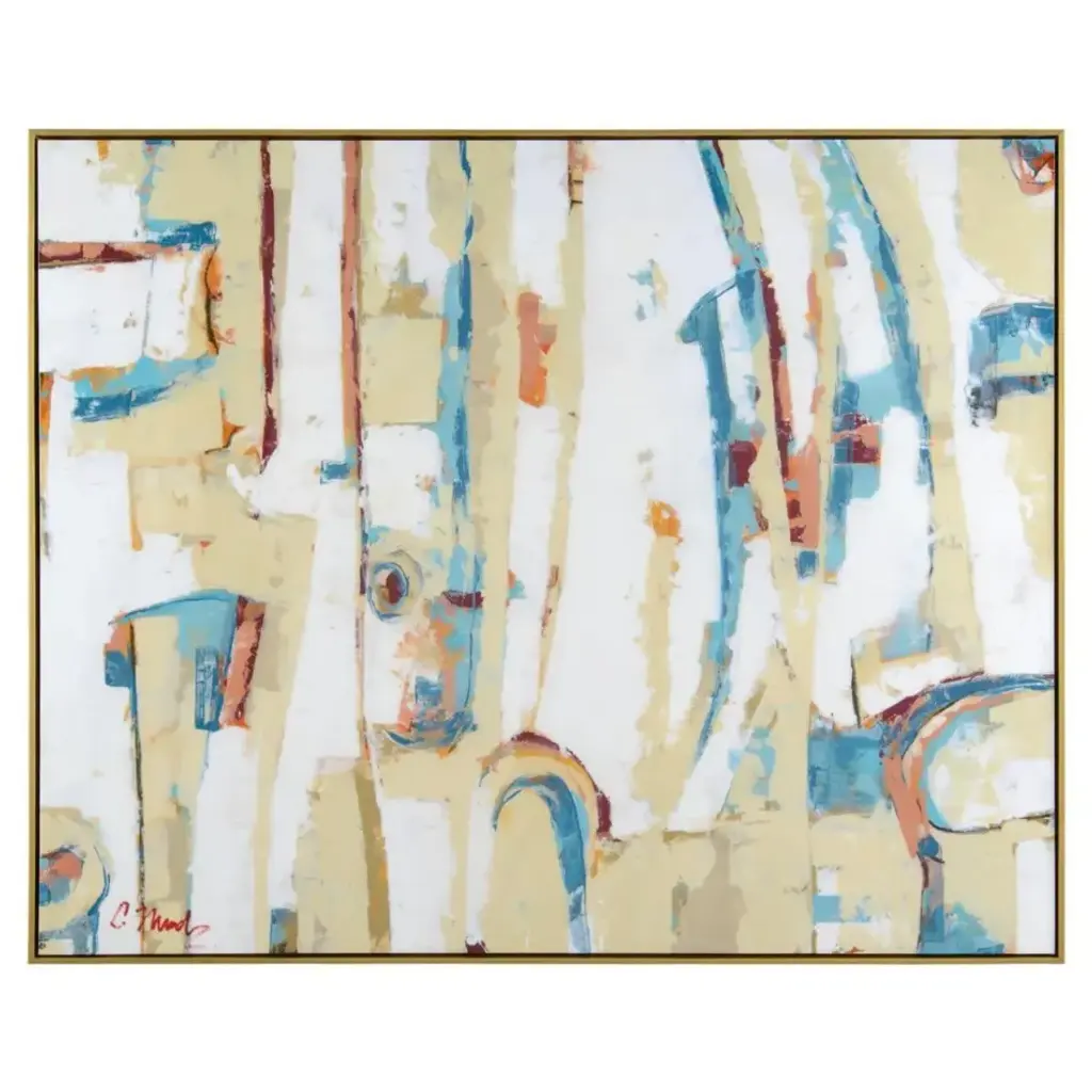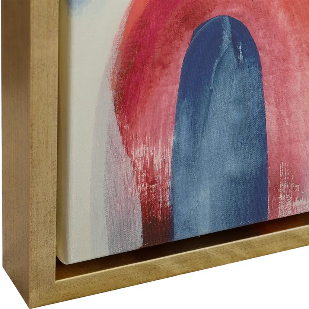 Giclee on canvas, this abstract piece features a rainbow effect of splashy colors highlighted by white accents. A solid wood gallery frame with gold finish completes the artwork. May be hung horizontal or vertical. Each canvas is proudly handcrafted and printed in the USA. Artwork by Jill Martin.