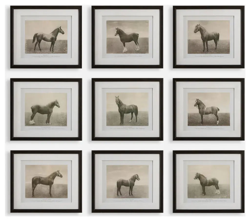 This Regal Set Showcases Nine Antiqued Sketches Of Horses Belonging To Dignitaries And Elite Members Of Society. Surrounded By A Beveled Wood Grain Frame In A Walnut Finish And A Crisp White Linen Liner. Each Print Is Placed Under Protective Glass. Framed Prints, S/9 from the Equine Dynasty collection in Dark Walnut finishThis Regal Set Showcases Nine Antiqued Sketches Of Horses Belonging To Dignitaries And Elite Members Of Society. Surrounded By A Beveled Wood Grain Frame In A Walnut Finish And A Crisp White Linen Liner. Each Print Is Placed Under Protective Glass.Width: 15.88"Height: 13.88"Weight: 2.50 lb