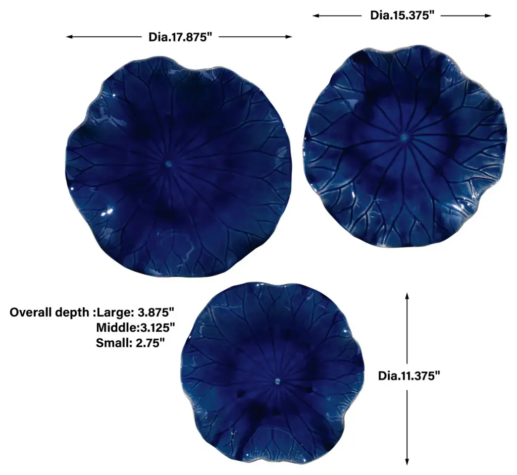 A trio of ceramic flowers with detailed veining, glazed in a rich cobalt blue. May be hung on wall or used as tabletop accessory. Sizes: sm-11x3x11, med-15x3x15, lg-18x4x18