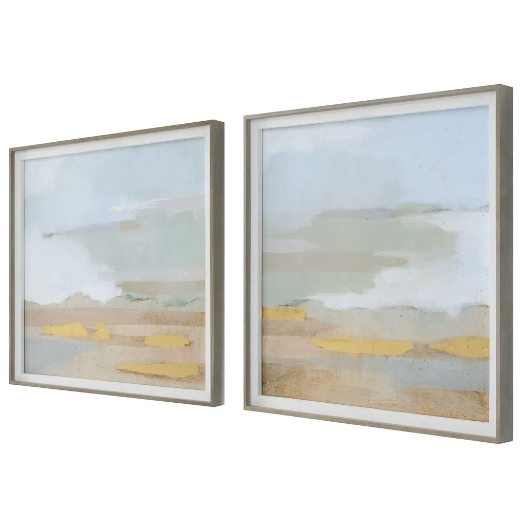 These serene landscape prints are shown under glass featuring clay, sage, and light blue tones with gold leaf accents. Each print is accented by a linen liner and a natural wood tone frame. Artwork by Victoria Borges. Uttermost's art combines premium quality materials with unique high-style design. With the advanced product engineering and packaging reinforcement, Uttermost maintains some of the lowest damage rates in the industry. Each product is designed, manufactured and packaged with shipping in mind. Features: Set includes: Two (2) framed prints Materials: Pine, Glass, MDF, Veneer, Linen, Paper Finish: Wood look Designer: Grace Feyock Dimensions: Overall dimensions: 19.5 inches wide x 19.5 inches high x 1.5 inches deep Mirror dimensions: 18 inches wide x 18 inches high x 0.093 inch deep Item weight: 7 lbs This product will ship to you in one (1) box.WARNING: This product can expose you to chemicals including titanium dioxide which is known to the State of California to cause cancer. For more information, go to www.P65Warnings.ca.gov/furniture.