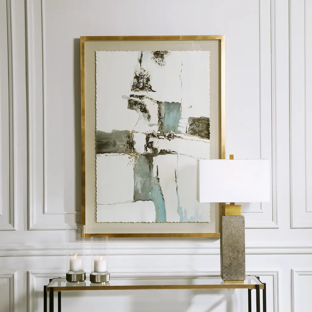 Uttermost's art combines premium quality materials with unique high-style design. With the advanced product engineering and packaging reinforcement, uttermost maintains some of the lowest damage rates in the industry. Each product is designed, manufactured and packaged with shipping in mind. Hand painted on parchment, this elegant watercolor artwork exhibits dark grey-blue, charcoal, and light taupe tones with dimensional gold leaf embellishment. the hand torn edges are accented by a beige linen background and a light gold finished shadowbox frame. May be hung horizontal or vertical. Features: Set includes: One (1) abstract art Materials: 30% paper, 20% pine, MDF 20%, 10% glass, 10% linen, 10% acrylic Finish: Gold leaf Color: Black, blue, gold Designer: Grace Feyock Dimensions: Abstract art: 52.8 inches high x 37.8 inches wide x 1.5 inches deep Mirror/glass: 51 inches high x 36 inches wide x 0.09 inches deep This product will ship to you in one (1) box. Accessories pictured are NOT included. WARNING: This product can expose you to chemicals including titanium dioxide which is known to the State of California to cause cancer. For more information, go to www.P65Warnings.ca.gov/furniture.