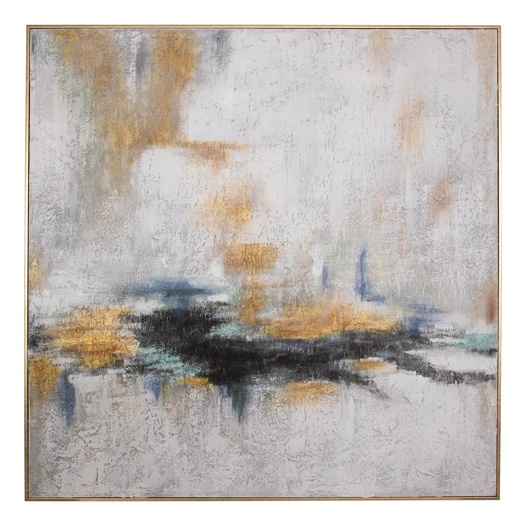 Uttermost's art combines premium quality materials with unique high-style design. With the advanced product engineering and packaging reinforcement, Uttermost maintains some of the lowest damage rates in the industry. Each product is designed, manufactured and packaged with shipping in mind. Minimal yet striking, this hand painted artwork displays a neutral color palette with strong navy, blue, and gold tones and unique textures and distressing. The piece is accented by a gold leaf finished gallery frame. Features: Set includes: One (1) painted art Materials: Firewood, fibre canvas, PU Finish: Gold leaf Color: Gold, white, black, cobalt blue, aqua tones, grey Designer: Constance Lael-Linyard Dimensions: Painted art: 50.88 inches high x 50.88 inches wide x 2.25 inches deep This product will ship to you in one (1) box. WARNING: This product can expose you to chemicals including titanium dioxide which is known to the State of California to cause cancer. For more information, go to www.P65Warnings.ca.gov/furniture.