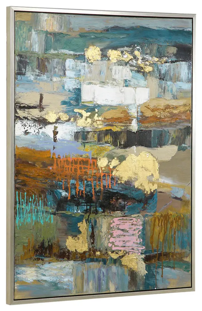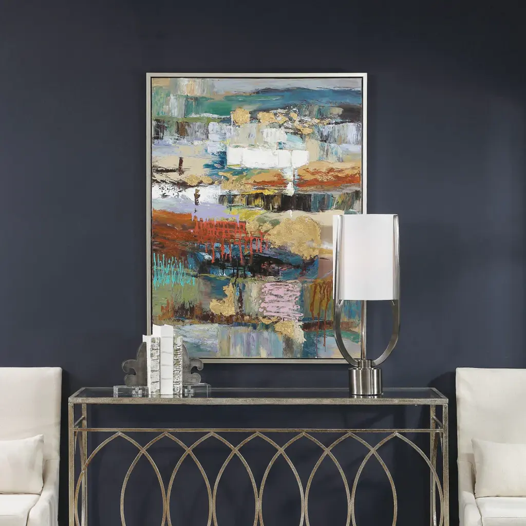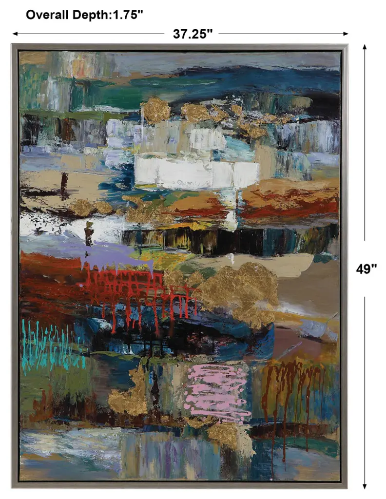 Bold, Graphic Brushstrokes Make Up This Modern, Hand Painted Abstract On Canvas. The Multi-colored Composition Showcases Dynamic Shades Of Blue, Green, Black, Brown, And Yellow With Pops Of Salmon And Lavender. An Antiqued Silver Leaf Gallery Frame Completes This Artwork. Due To The Handcrafted Nature Of This Work, Each Piece May Have Subtle Differences. This Piece May Be Hung Horizontal Or Vertical.
