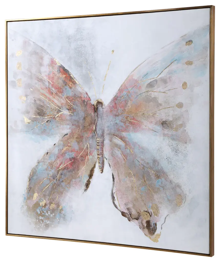 Showcasing A Whimsical Flair, This Hand Painted Canvas Pairs Vibrant Shades Of Fuchsia And Red-orange With Subdued Shades Of Powder Blue And Light Gray. This Contemporary Butterfly Artwork Also Features Hints Of Gold And Silver Leaf And Is Complimented By An Antique Gold Leaf Gallery Frame. Due To The Handcrafted Nature Of This Artwork, Each Piece May Have Subtle Differences. Uttermost''s Art Combines Premium Quality Materials With Unique High-style Design. With The Advanced Product Engineering And Packaging Reinforcement, Uttermost Maintains Some Of The Lowest Damage Rates In The Industry. Each Product Is Designed, Manufactured And Packaged With Shipping In Mind.