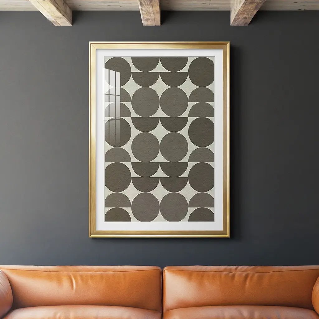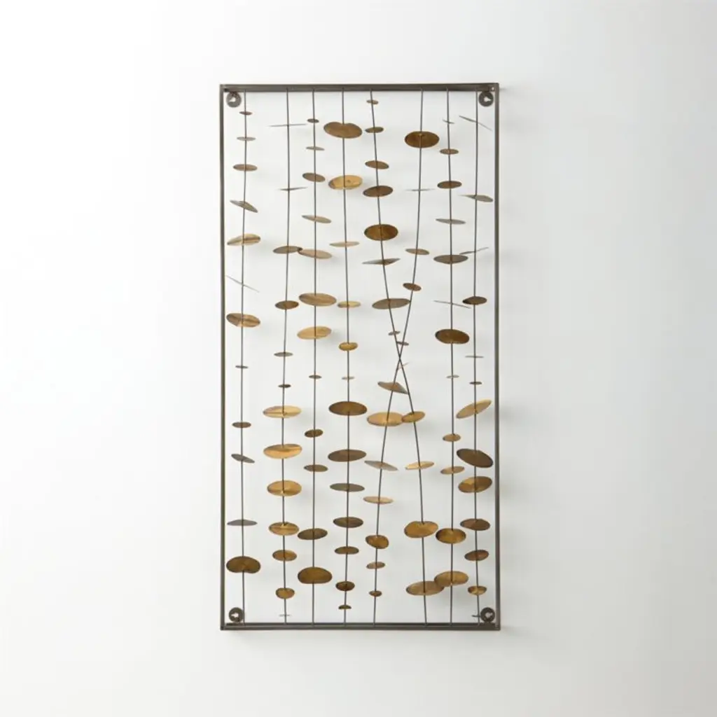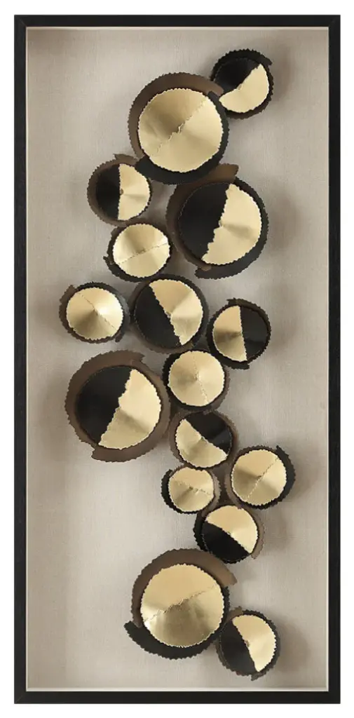 An Artful, Layered Assortment Of Serrated Edge Iron Discs Accented With Gold Leaf Centers. The Artwork Is Displayed Over A Light Oatmeal Linen Backing In A Satin Black Finished Shadow Box Frame Under Glass. May Be Hung Horizontal Or Vertical.