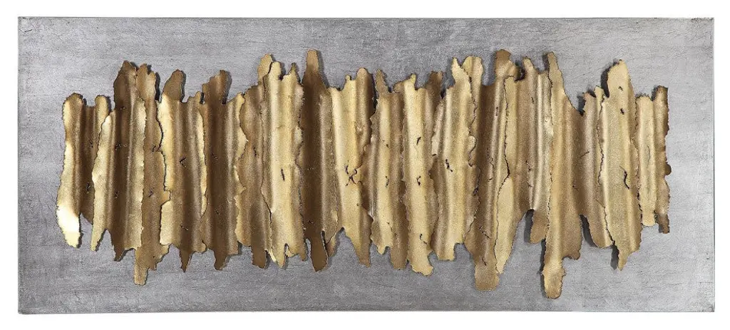 Iron Wall Art Featuring Layers Of Metal Strips With Crude Edging, Finished In An Antique Gold Leaf And Set On A Distressed Silver Leaf Iron Backing. May Be Hung Horizontal Or Vertical. Uttermost''s Wall Art Combines Premium Quality Materials With Unique High-style Design. With The Advanced Product Engineering And Packaging Reinforcement, Uttermost Maintains Some Of The Lowest Damage Rates In The Industry. Each Product Is Designed, Manufactured And Packaged With Shipping In Mind. DimensionsDepth: 2. 75 in. Width: 24 in. Height: 55. 25 in.