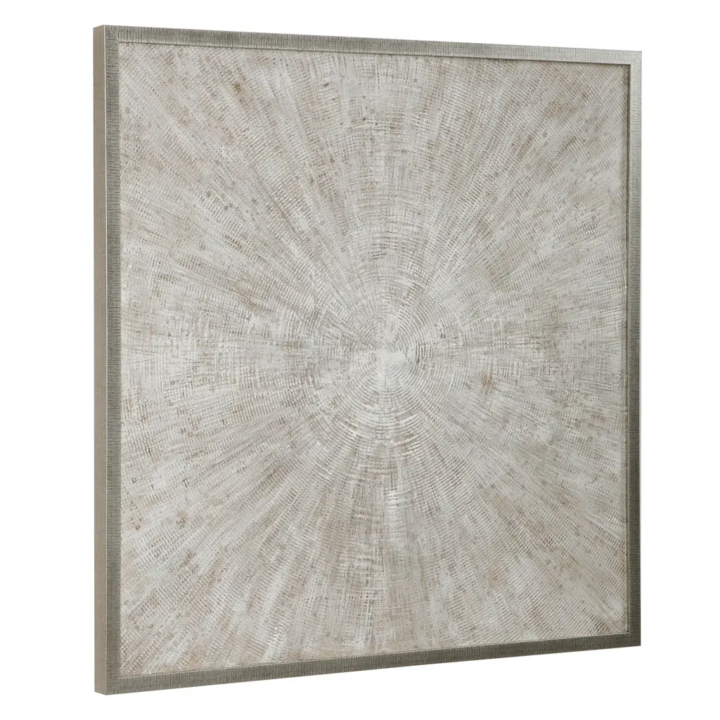 Uttermost's art combines premium quality materials with unique high-style design. With the advanced product engineering and packaging reinforcement, uttermost maintains some of the lowest damage rates in the industry. Each product is designed, manufactured and packaged with shipping in mind. Hand painted on canvas, this artwork features heavy texture with natural beige and white tones and metallic silver highlights. A textured antique silver gallery frame accents the piece. Due to the handcrafted nature of this artwork, each piece may have subtle differences. Features: Set includes: One (1) abstract art Materials: 50% firwood, 30% fiber canvas, 10% PVC, 10% PU frame Frame finish: Silver Color: Brown, silver, white Designer: David Frisch Dimensions: Abstract art: 42.75 inches high x 42.75 inches wide x 2 inches deep This product will ship to you in one (1) box. Accessories pictured are NOT included. Note: WARNING: This product can expose you to chemicals including titanium dioxide which is known to the State of California to cause cancer. For more information, go to www.P65Warnings.ca.gov/furniture.