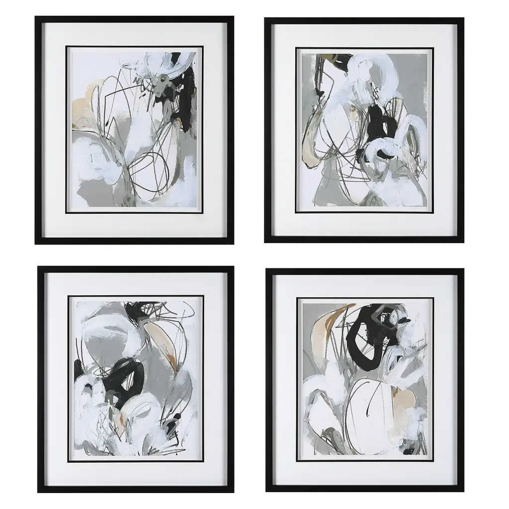 Uttermost's art combines premium quality materials with unique high-style design. With the advanced product engineering and packaging reinforcement, Uttermost maintains some of the lowest damage rates in the industry. Each product is designed, manufactured and packaged with shipping in mind. Displaying perfect contemporary abstraction, this set of artwork pairs neutral color tones with expressive lines and bold details. The ebony, taupe, and grey strokes create a modern, yet timeless feel. Each print is accented by layered black and white matting with a satin black frame under glass. Artwork by June Erica Vess. Features: Set includes: Four (4) framed prints Materials: Plastic, glass, KT board, paper Frame finish: Satin black Color: Ebony, taupe, grey Designer: Grace Feyock Dimensions: Framed print: 28.38 inches high x 24.38 inches wide x 1.63 inches deep Mirror/Glass: 27 inches high x 23 inches wide x 0.09 inches deep This product will ship to you in one (1) box. WARNING: This product can expose you to chemicals including titanium dioxide which is known to the State of California to cause cancer. For more information, go to www.P65Warnings.ca.gov/furniture.