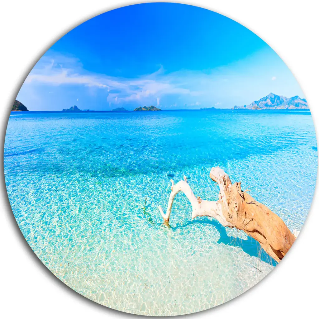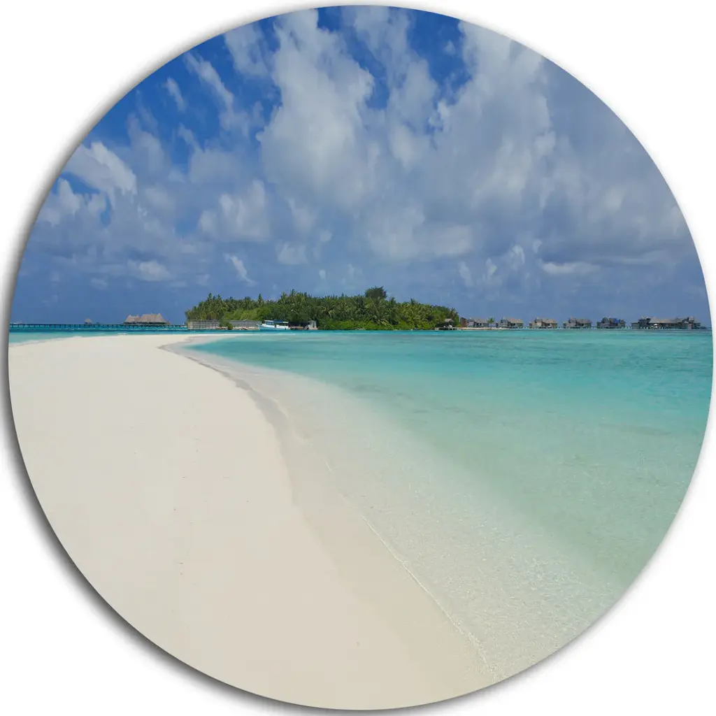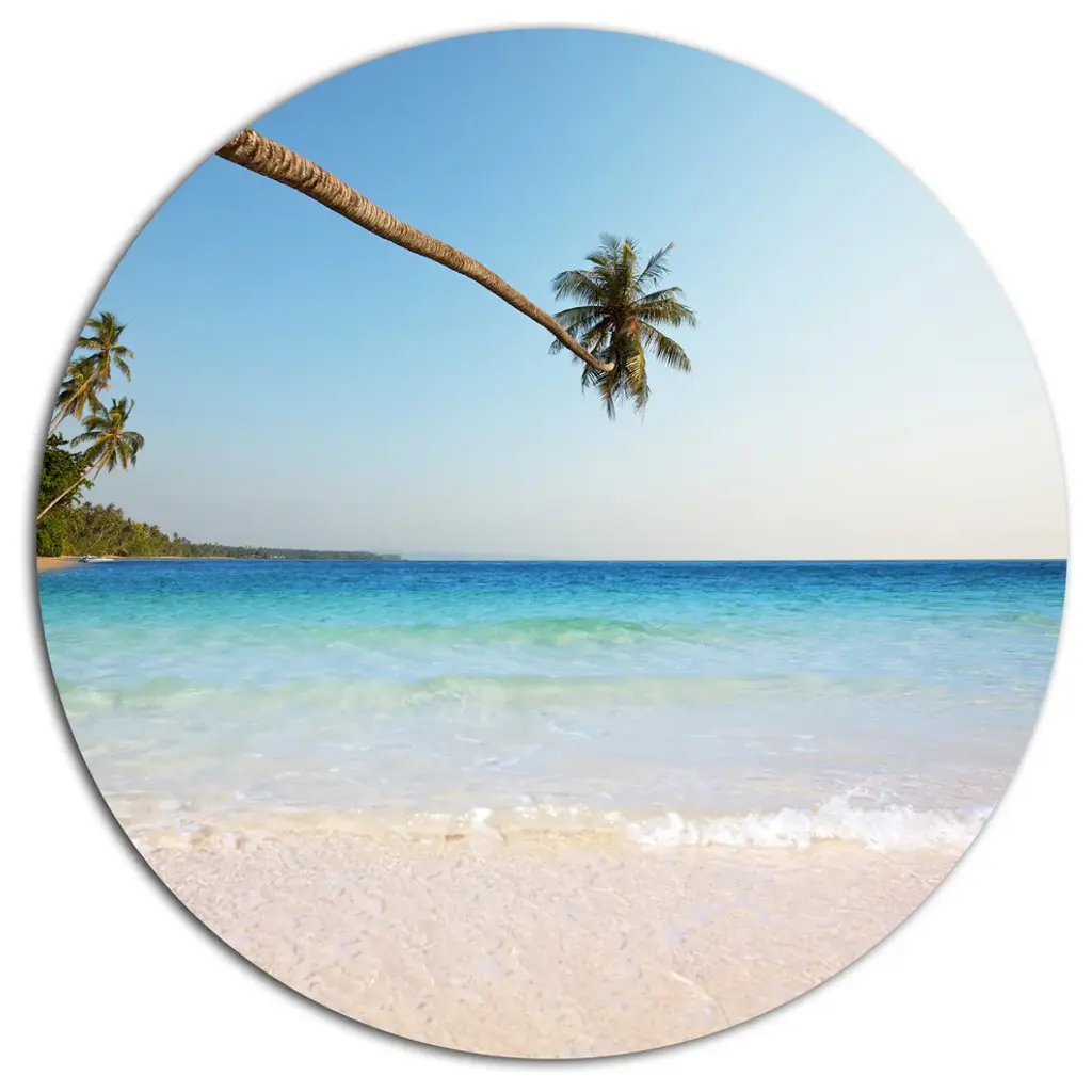 Bring Contemporary Abstraction to your home with this large Circle Metal wall art. This Vacant Beach with Turquoise Water Metal Artwork makes it the focal point of any room or office. - White Gloss Coating ensures colors are extra vibrant with light reflection.- Aluminum grade Sheet Metal with 1 inch mounting frame on the back giving the illusion that the artwork is floating on the wall..- Mounting Brackets are included along with instructions.- High Quality Digital images are created directly into a glossy aluminum panel producing a stunning and captivating print into the glossy finish of the metal.- Water, Fire and Scratch resistant HD Aluminum panels.- Looks better than any photo paper and guaranteed to last at least 20 years- Easy to clean with a microfiber cloth. Colors are far superior to regular Canvas Art. - Easy to Hang