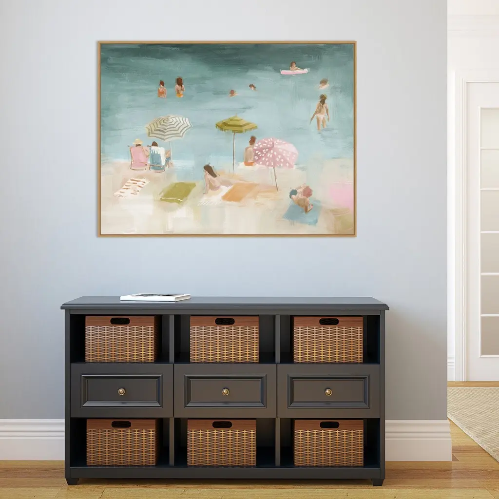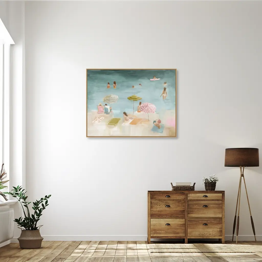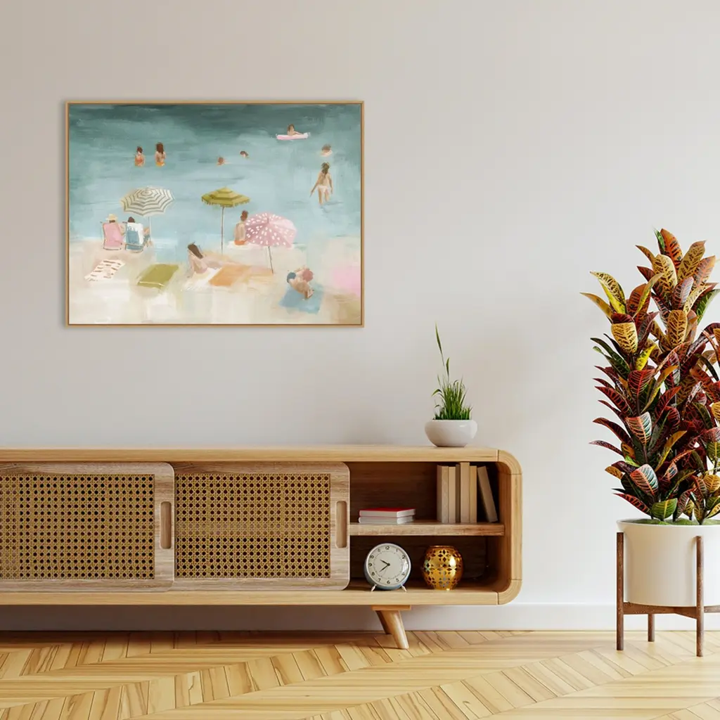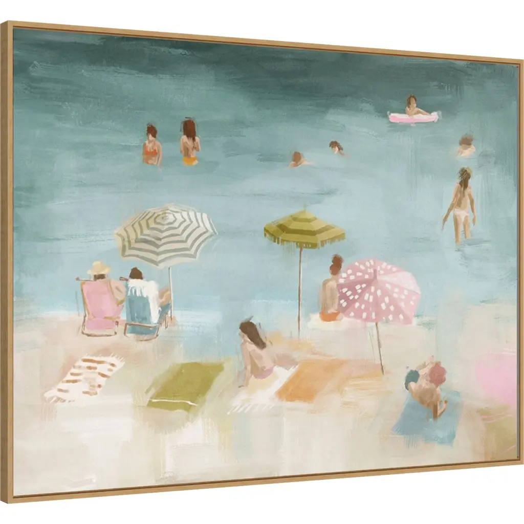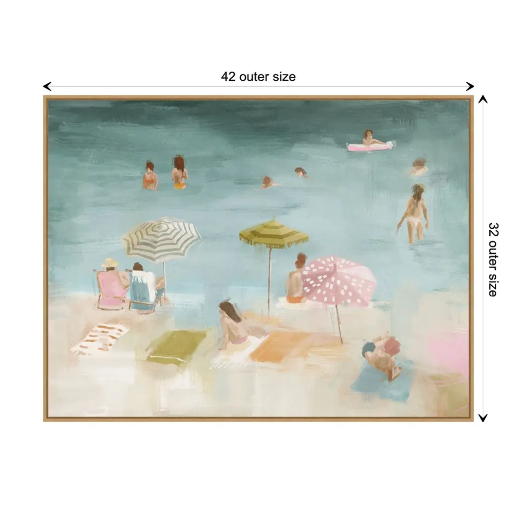 ART DESCRIPTION: A playful and carefree mood is captured in this multicolored beachscape, where people lounge on towels and chairs under patterned umbrellas. The calm sea and sky add to the relaxing vacation vibe, making it the perfect artwork to transport you to a summer getaway. This Amanti Art canvas art print was created by Urban Road and printed by Amanti Art in Madison WI. The canvas is stretched by hand and finished with a float frame. Individually made using traditional custom framing techniques, it has the quality you would expect from your local frame shop. Features: CUSTOM CANVAS ARTWORK DETAILS: Vacation Mood by Urban Road. ART DESCRIPTION: A playful and carefree mood is captured in this multicolored beachscape, where people lounge on towels and chairs under patterned umbrellas. The calm sea and sky add to the relaxing vacation vibe, making it the perfect artwork to transport you to a summer getaway. FRAME DETAILS: The canvas is framed in the Sylvie Maple frame, which is a modern, float frame with natural maple woodgrain coloring and dramatic depth. The frame measures 1 in. wide and stands 2 in. off the wall. The canvas appears as if it is floating in the frame because it has a narrow gap between the edge of the canvas and the frame. The overall size of this framed canvas print measures 42 in. W x 32 in. H. QUALITY AND AUTHENTICITY: Canvas is printed with high-quality, fade-resistant inks for picture-perfect detail and incredible depth of color. Canvas is stretched across a solid surface to resist sagging. We use only premium, high-tension canvas. Our exclusive stretching techniques hide corner folds and provide a taut canvas surface. The artwork is authentically licensed. HASSLE-FREE HANGING: Ready to hang for easy installation. ASSEMBLED IN THE USA: Each piece is assembled to order in Madison, WI USA. FOR HOME OR COMMERCIAL USE: Because of our attention to detail and focus on artistry, architects, interior designers, and homeowners alike choose this framed canvas artwork to create beautiful living spaces.