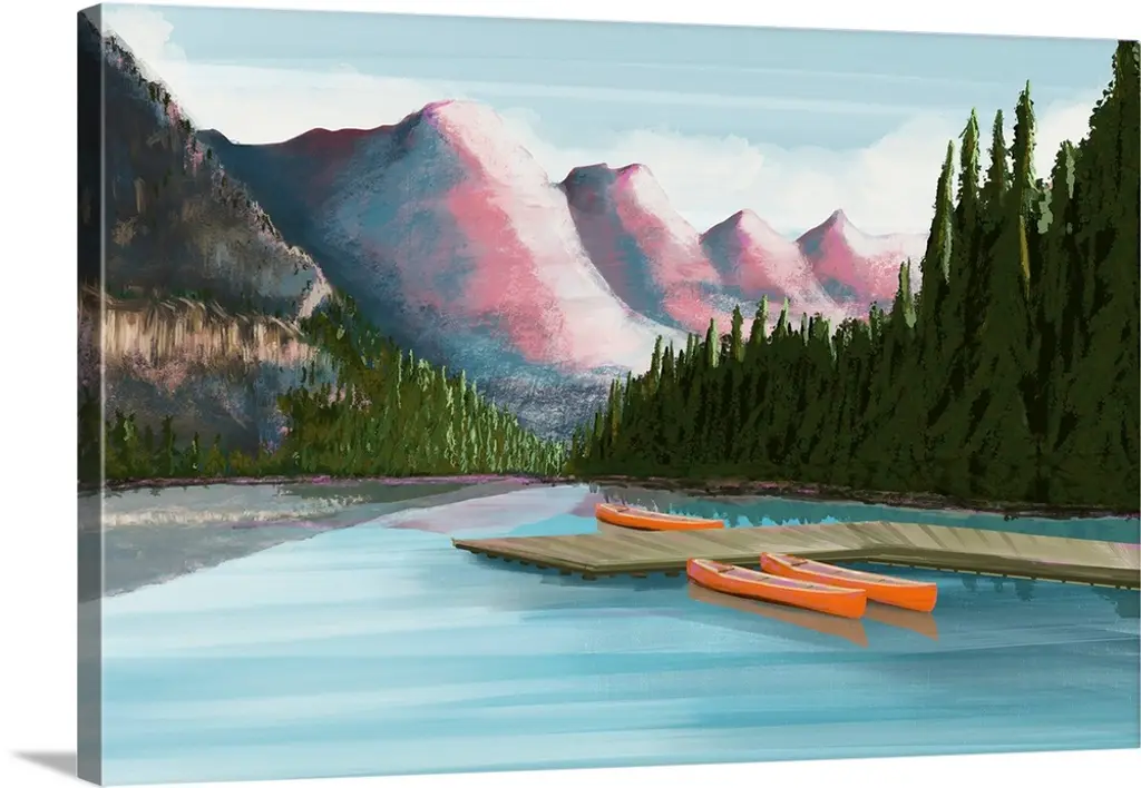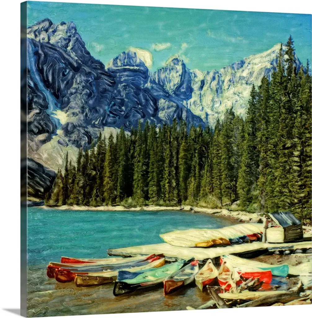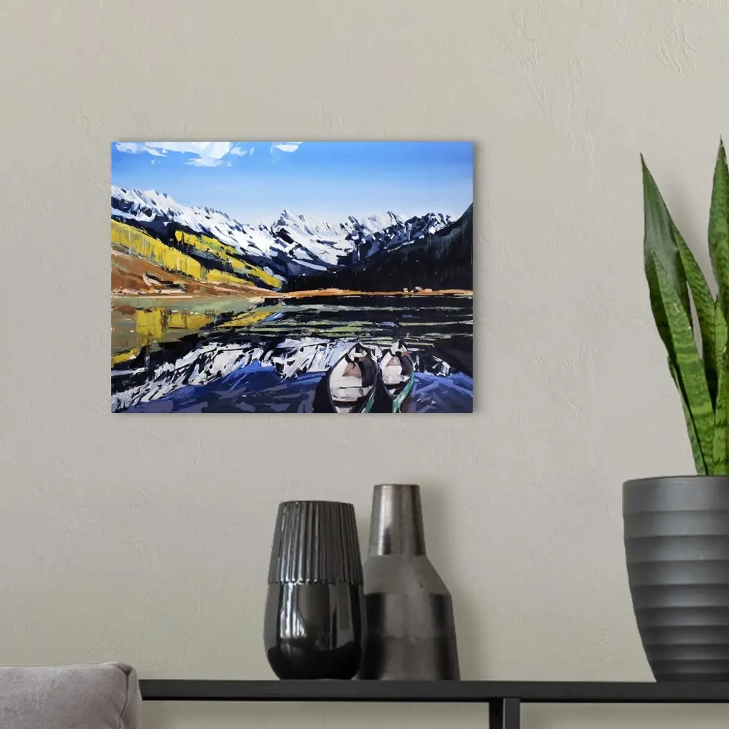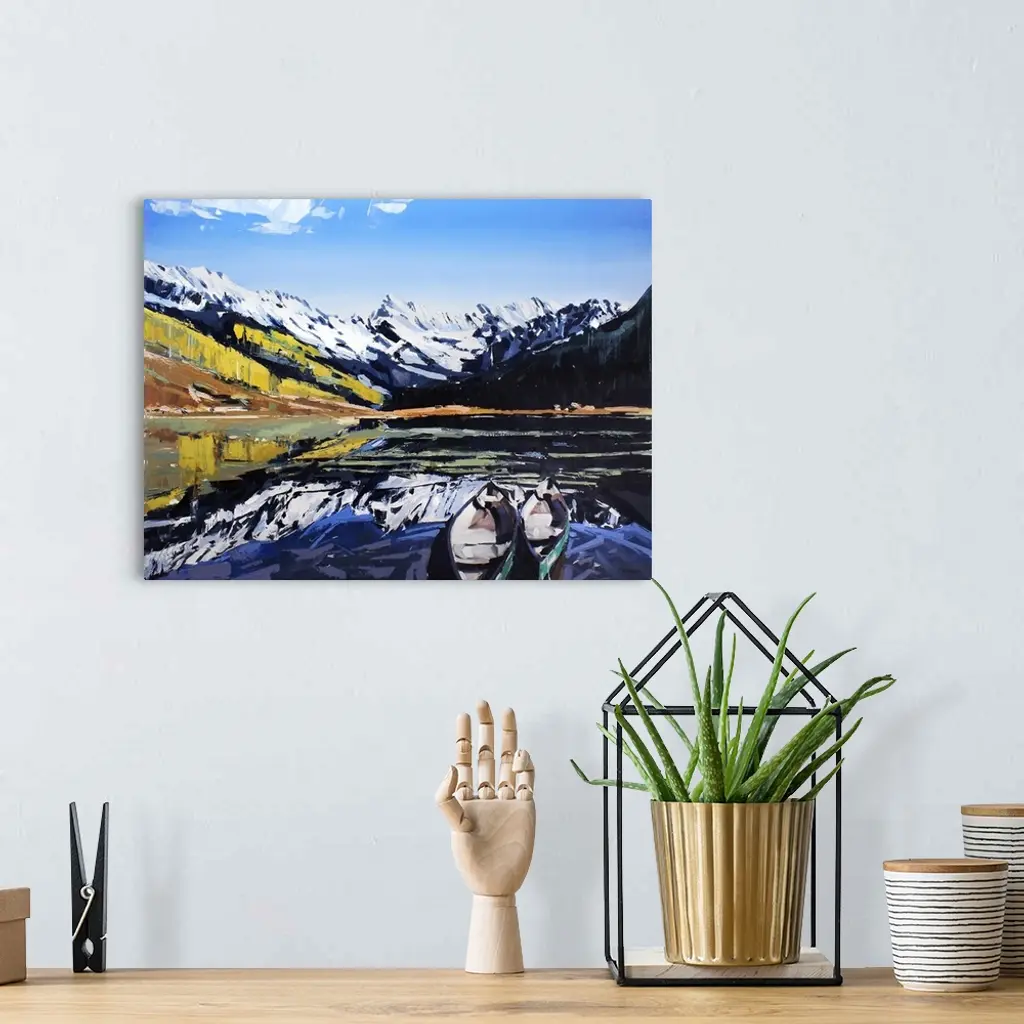 Contemporary palette knife painting of a lake with a canoe, with snow covered mountains reflecting in the water.