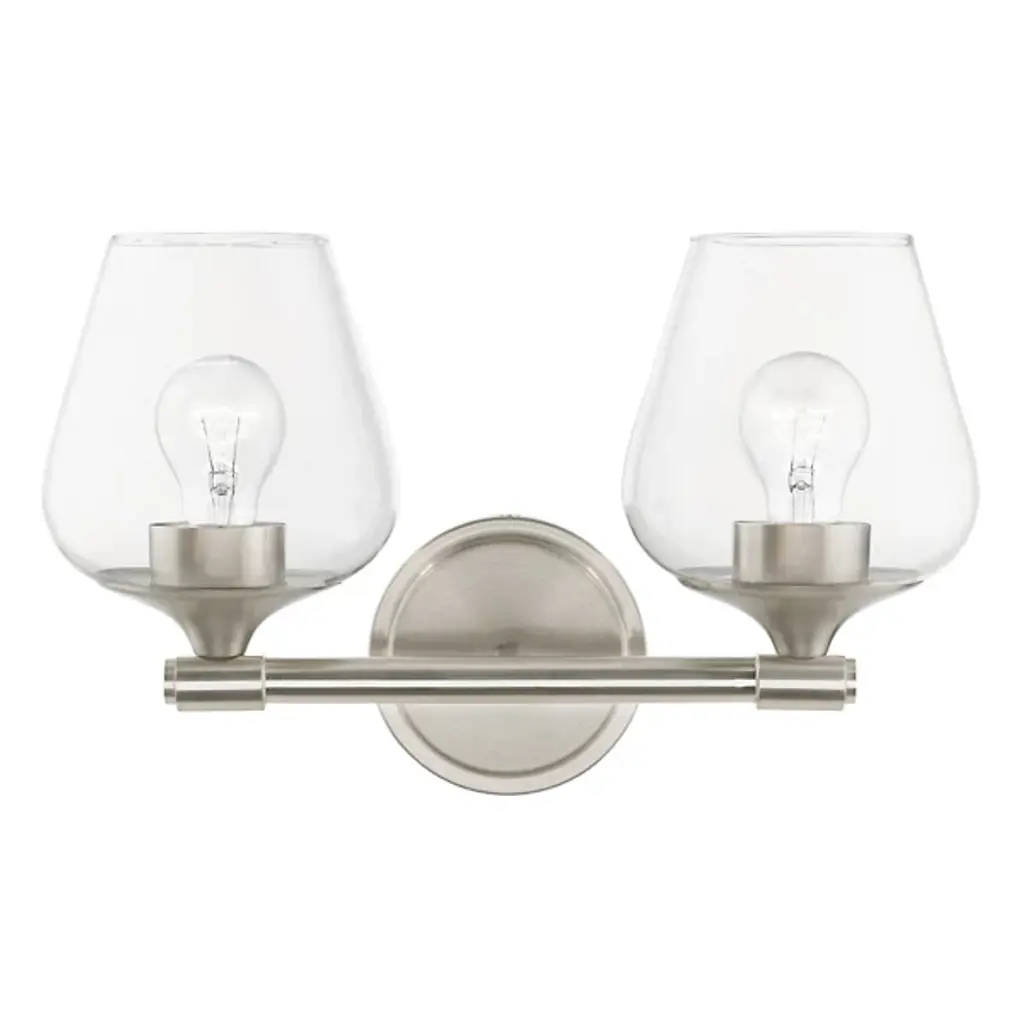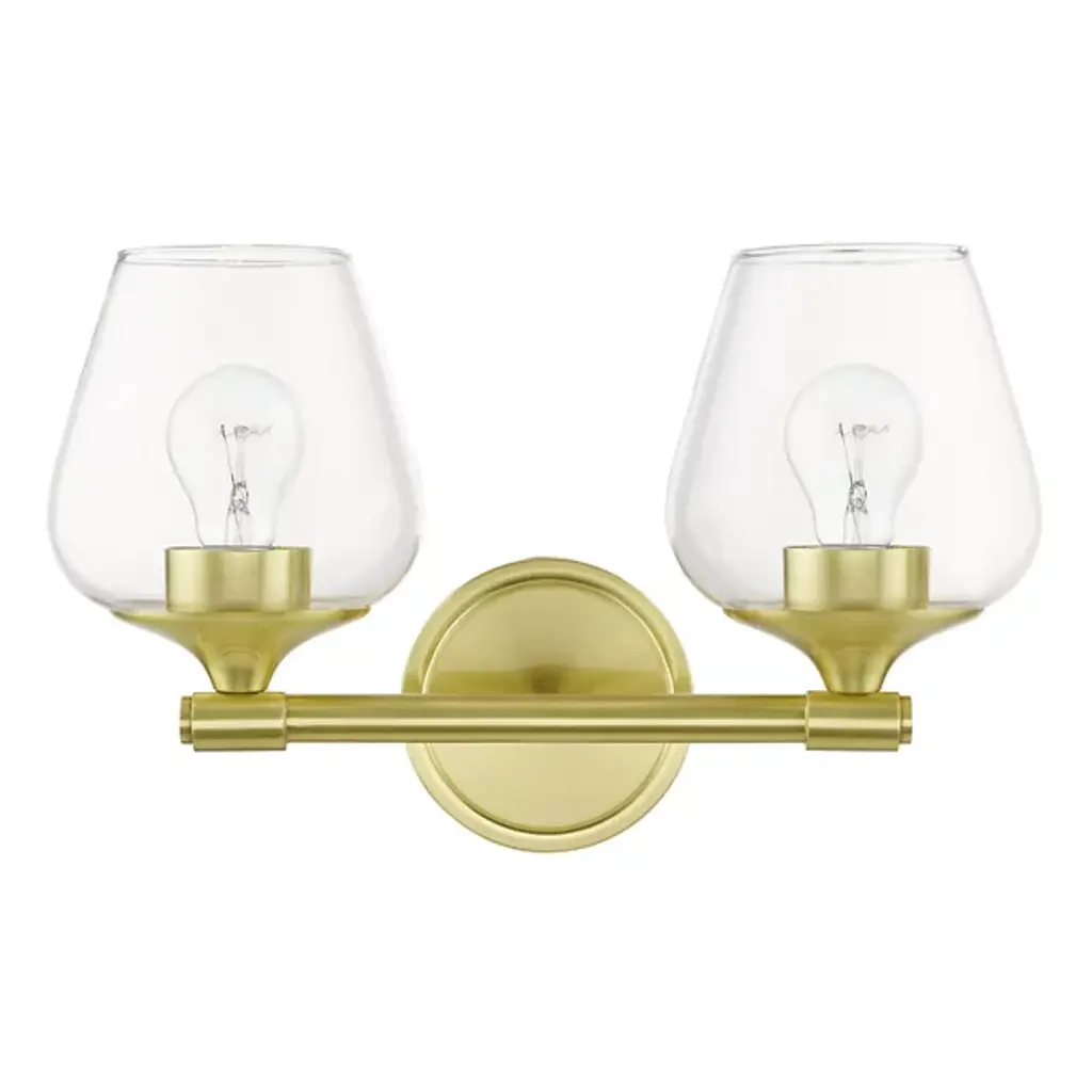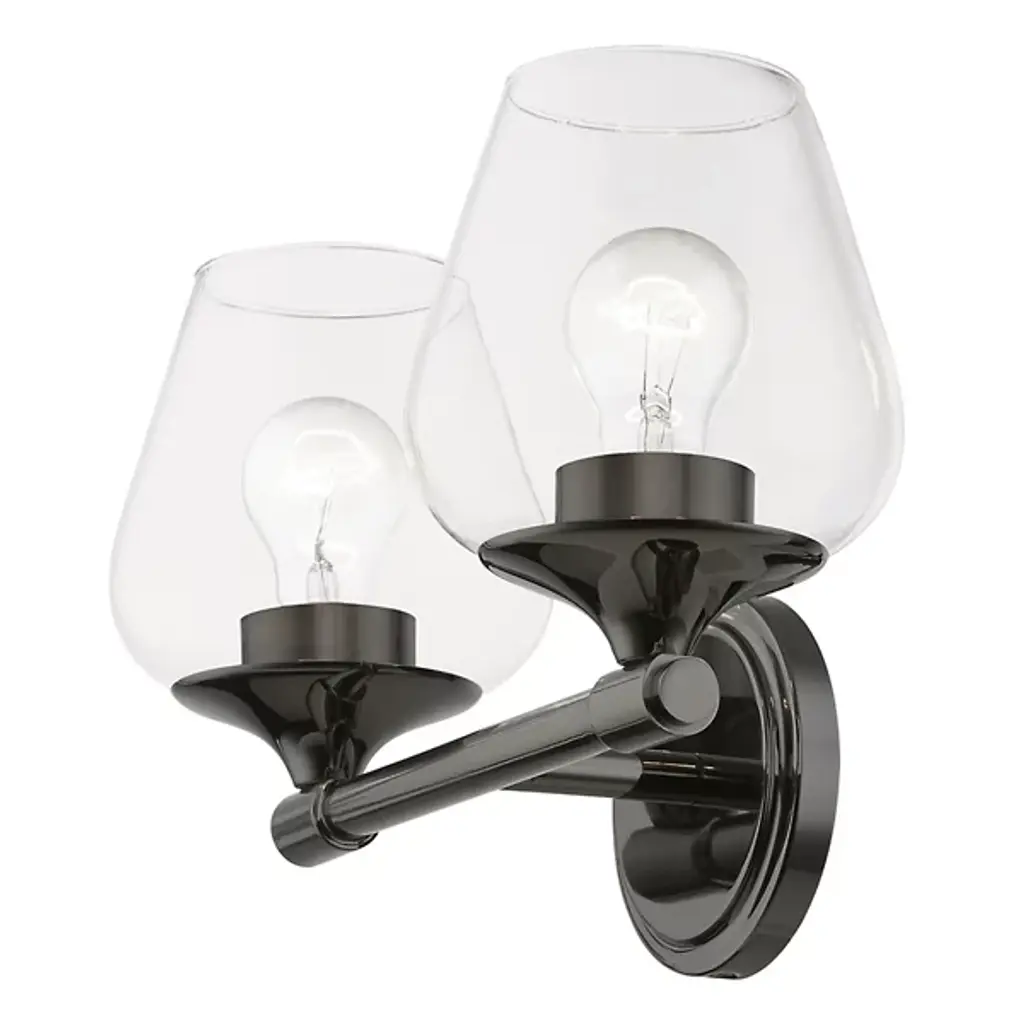 The Valentina Vanity Light from Alder & Ore lends a lasting appeal to its surroundings. A welcoming fixture with refined, willowy curves, it extends a slim crossbar from a circular wall plate, securing a series of lamps along it, extending single sockets from flared bobeches. Clear glass goblet shades reduce glare to the sides, splashing out an inspiring warmth that gleams off the clean-surfaced metal.