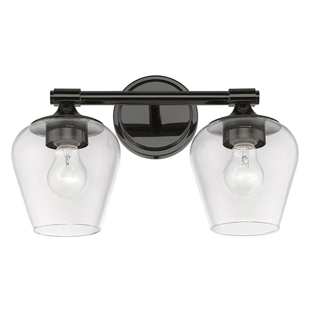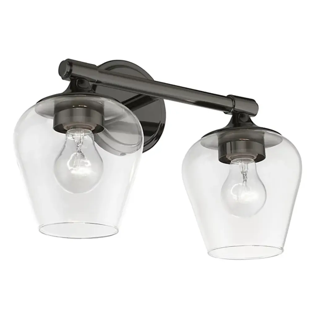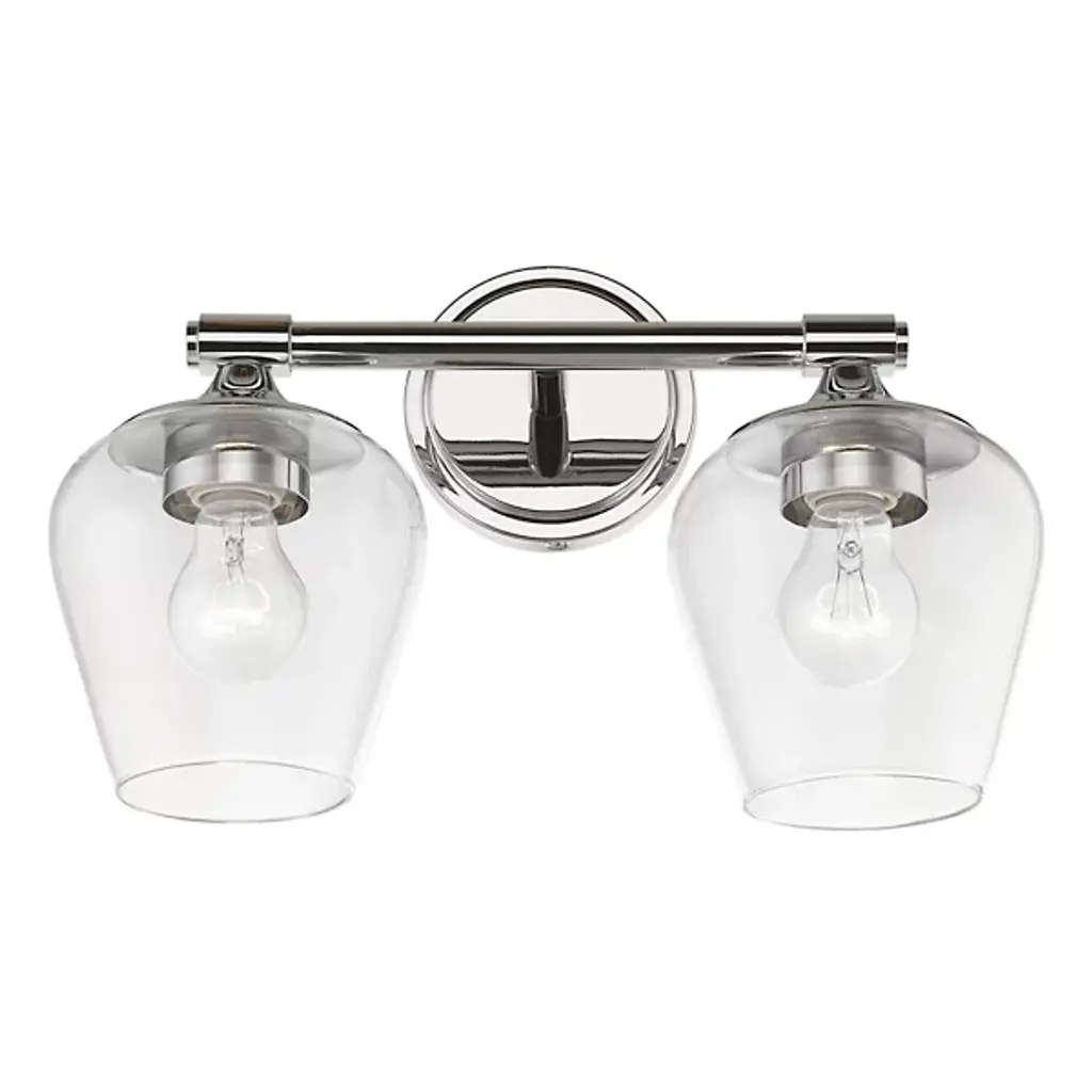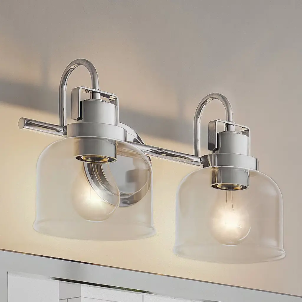 The Valentina Vanity Light from Alder & Ore lends a lasting appeal to its surroundings. A welcoming fixture with refined, willowy curves, it extends a slim crossbar from a circular wall plate, securing a series of lamps along it, extending single sockets from flared bobeches. Clear glass goblet shades reduce glare to the sides, splashing out an inspiring warmth that gleams off the clean-surfaced metal.