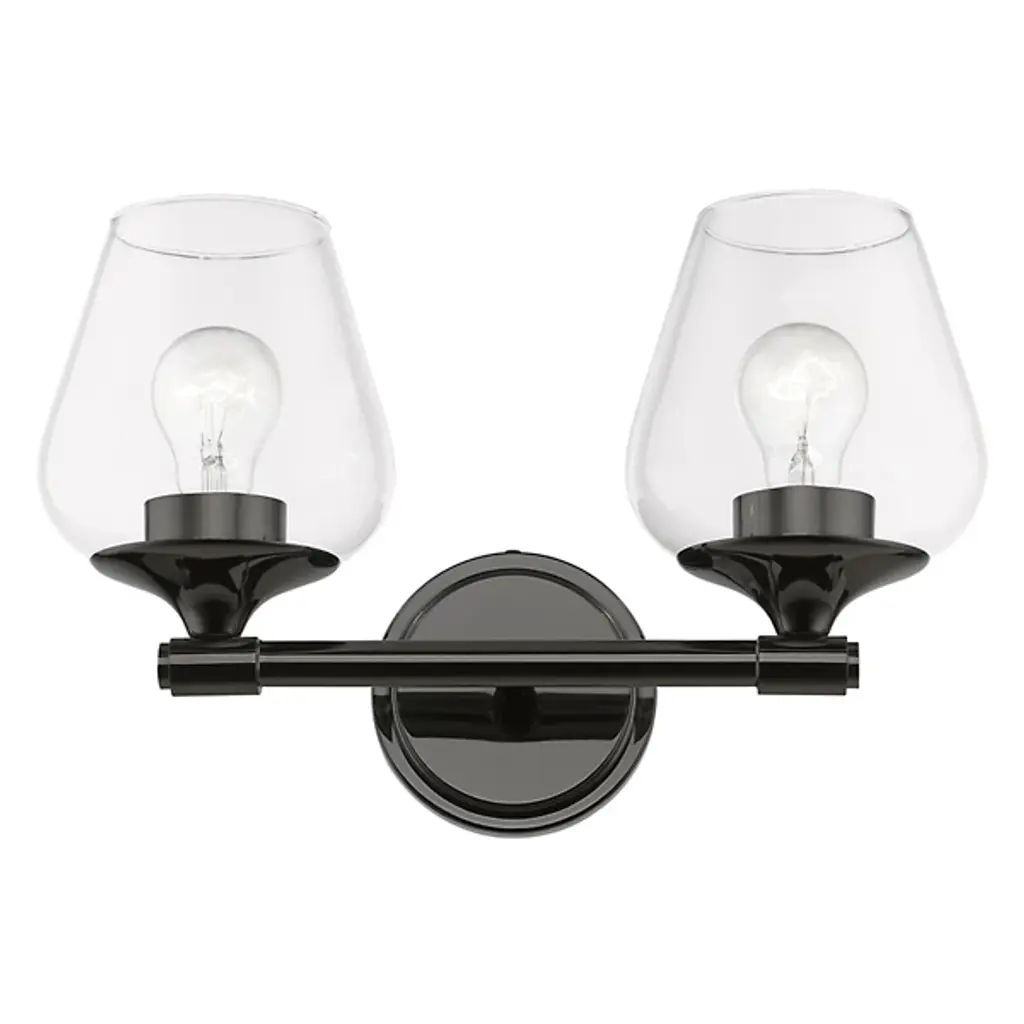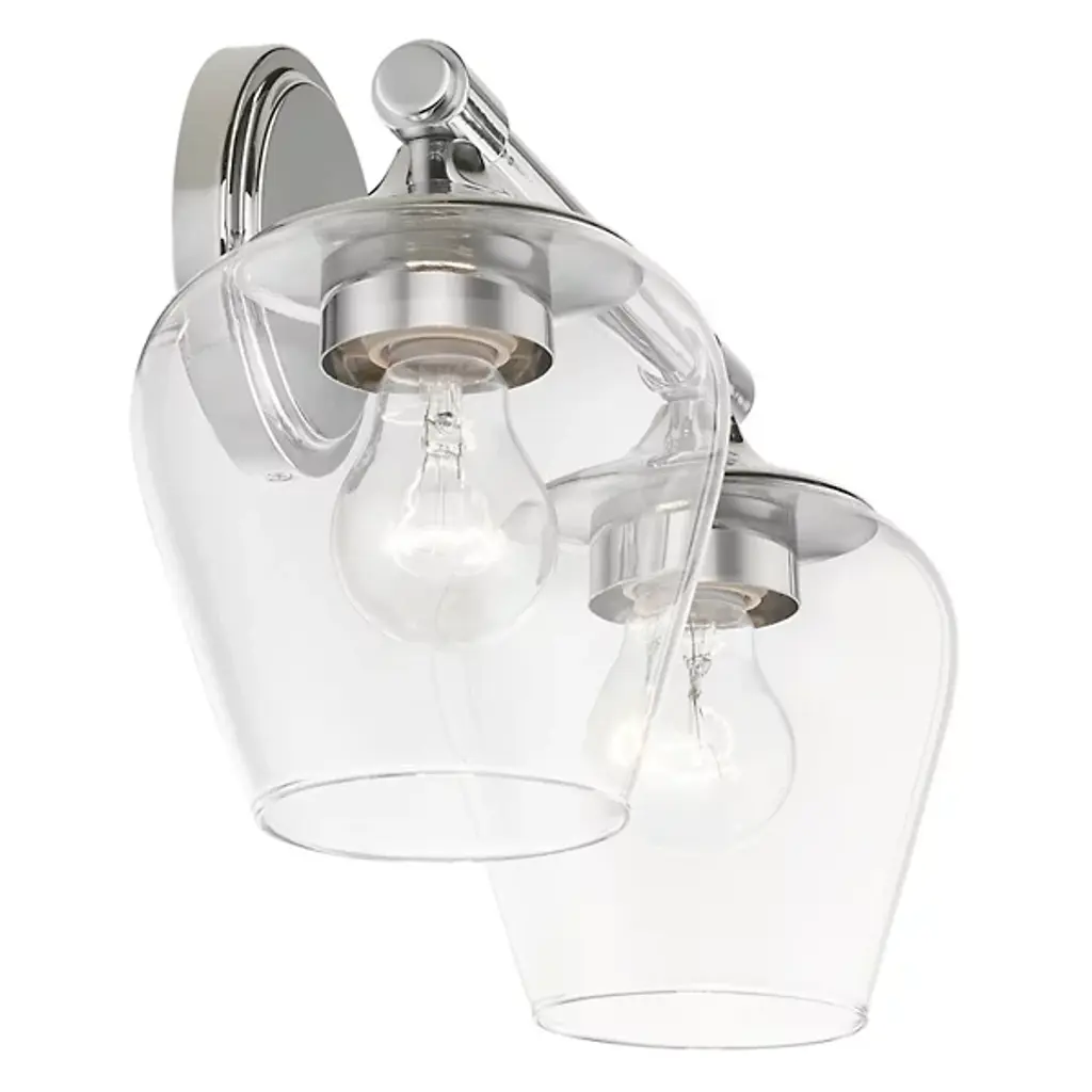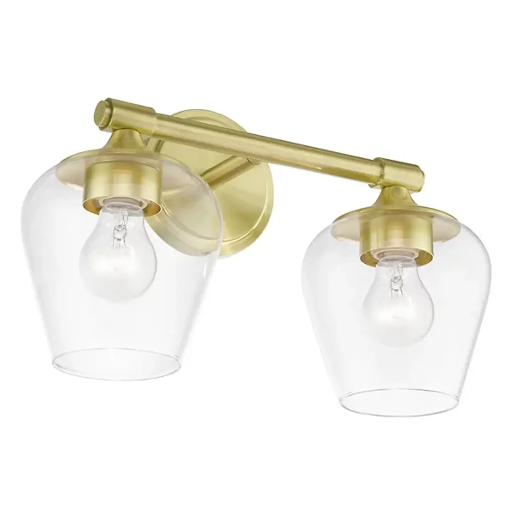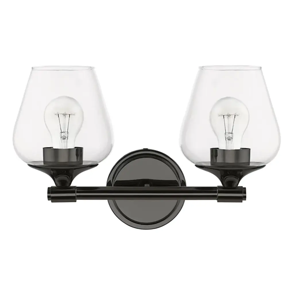 The Valentina Vanity Light from Alder & Ore lends a lasting appeal to its surroundings. A welcoming fixture with refined, willowy curves, it extends a slim crossbar from a circular wall plate, securing a series of lamps along it, extending single sockets from flared bobeches. Clear glass goblet shades reduce glare to the sides, splashing out an inspiring warmth that gleams off the clean-surfaced metal.