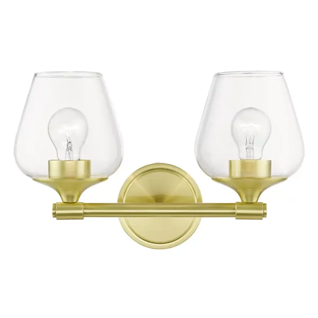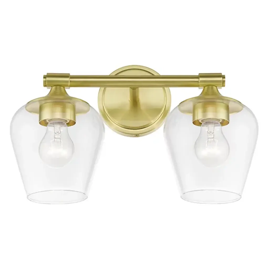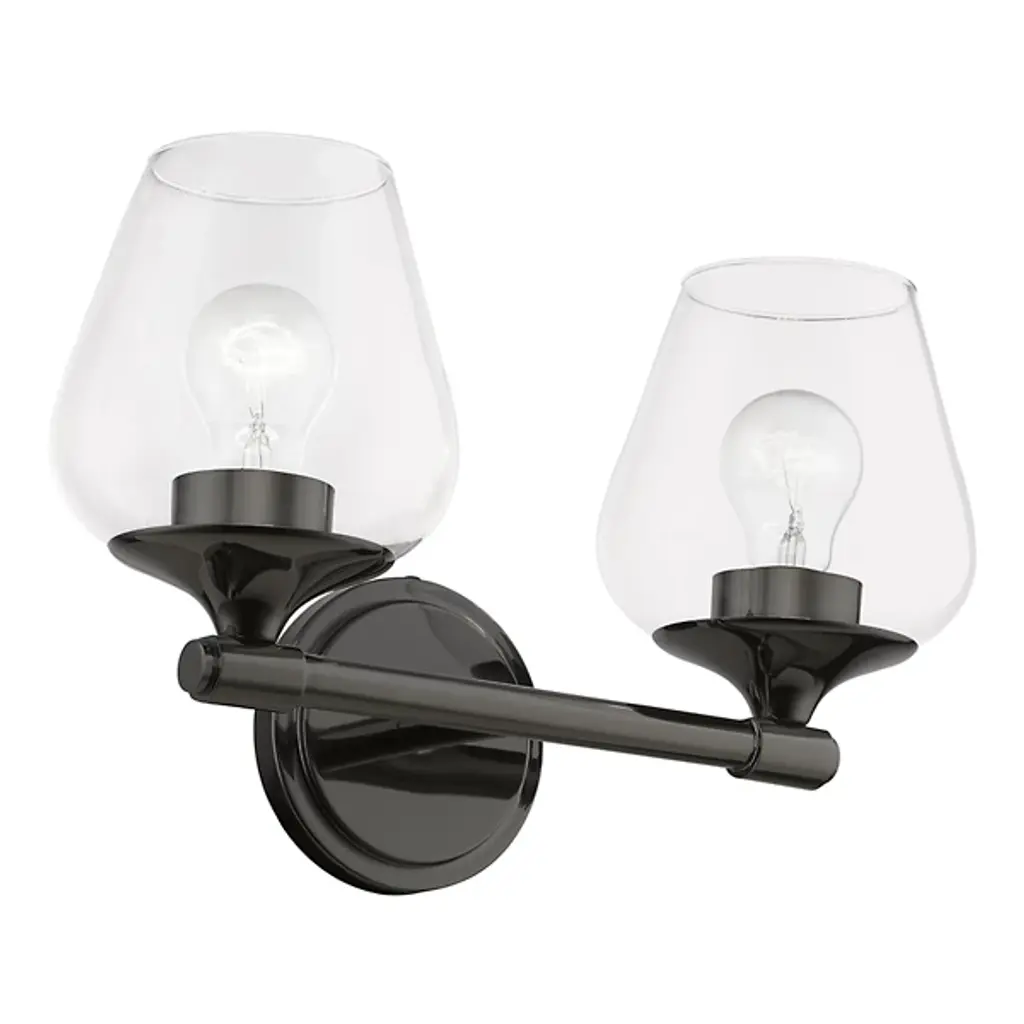 The Valentina Vanity Light from Alder & Ore lends a lasting appeal to its surroundings. A welcoming fixture with refined, willowy curves, it extends a slim crossbar from a circular wall plate, securing a series of lamps along it, extending single sockets from flared bobeches. Clear glass goblet shades reduce glare to the sides, splashing out an inspiring warmth that gleams off the clean-surfaced metal.