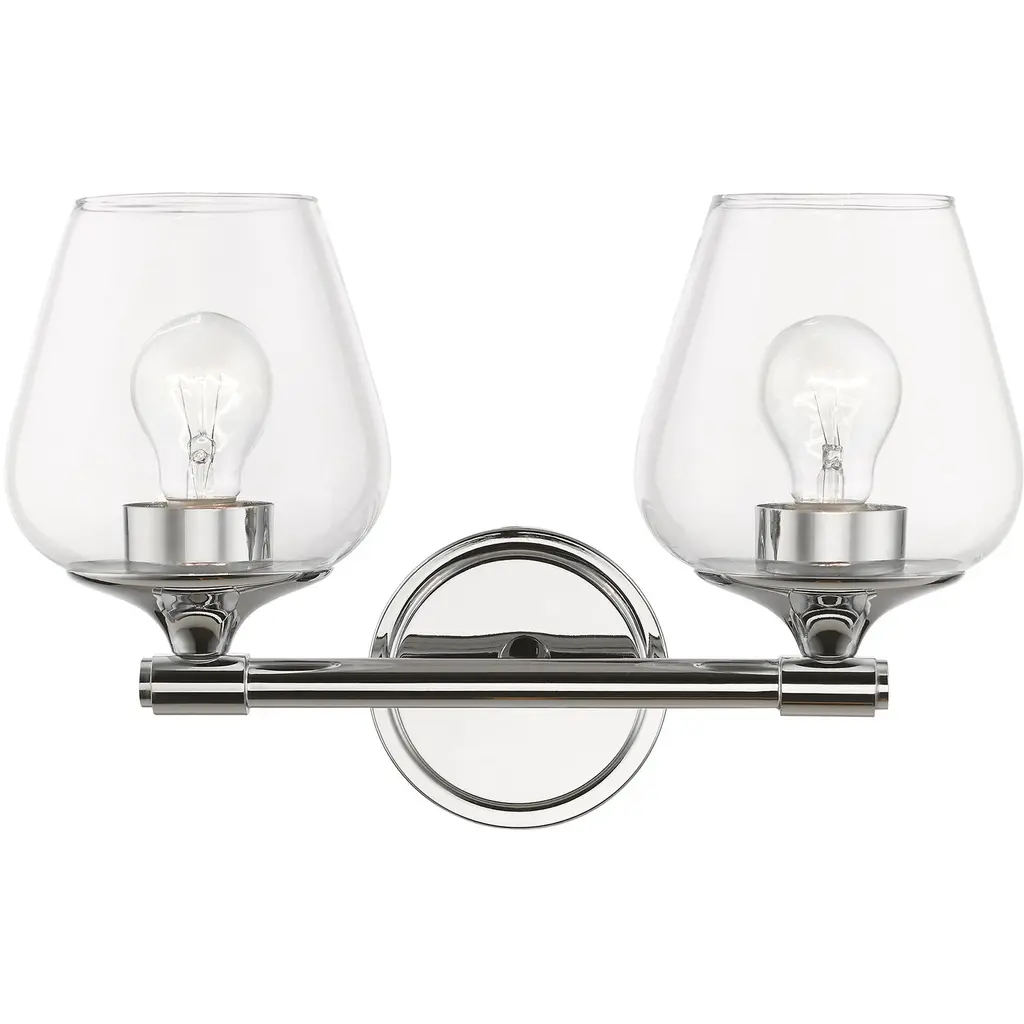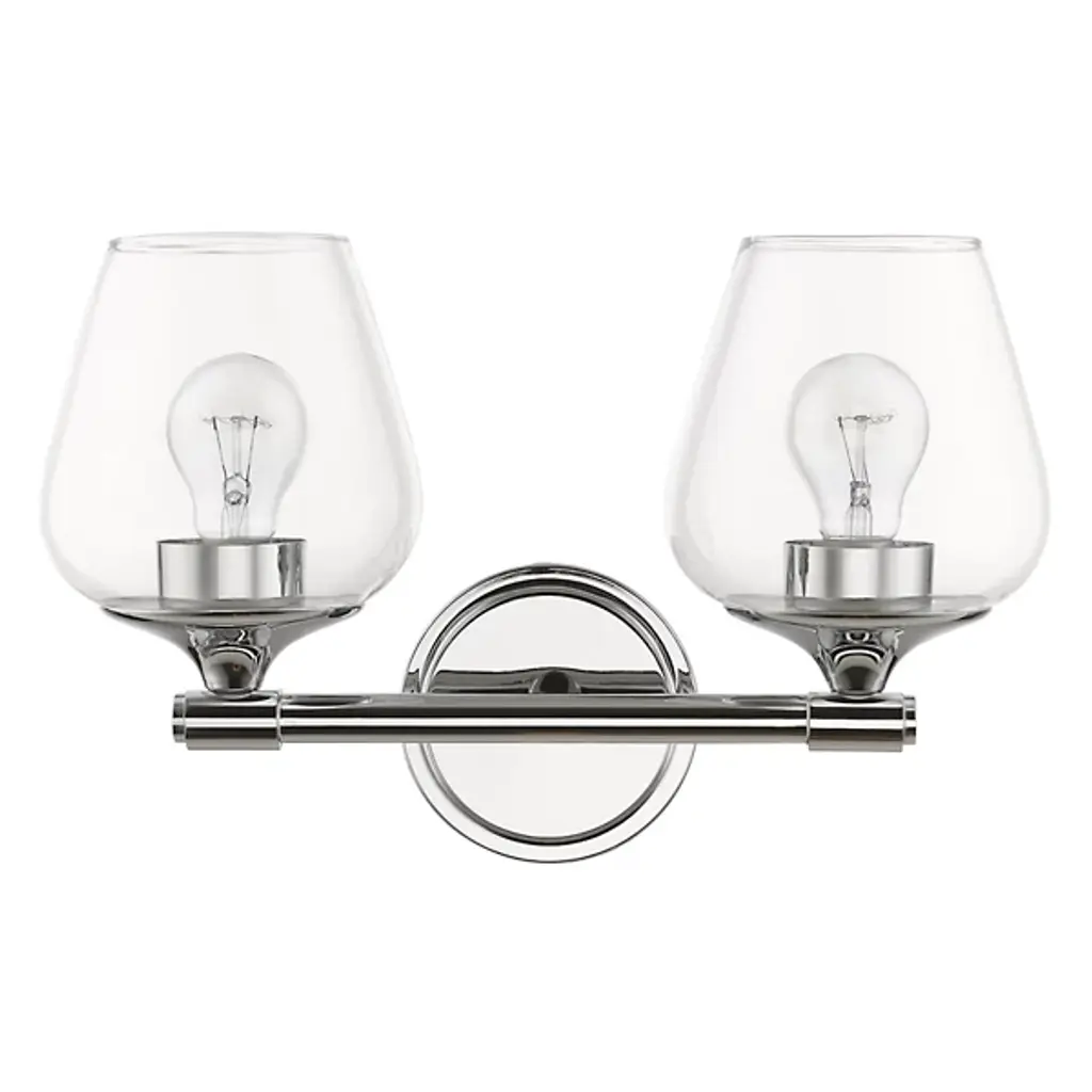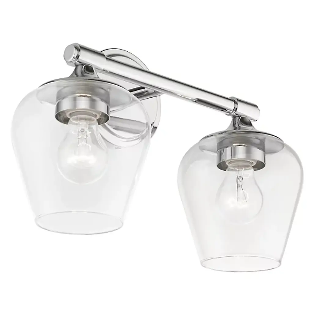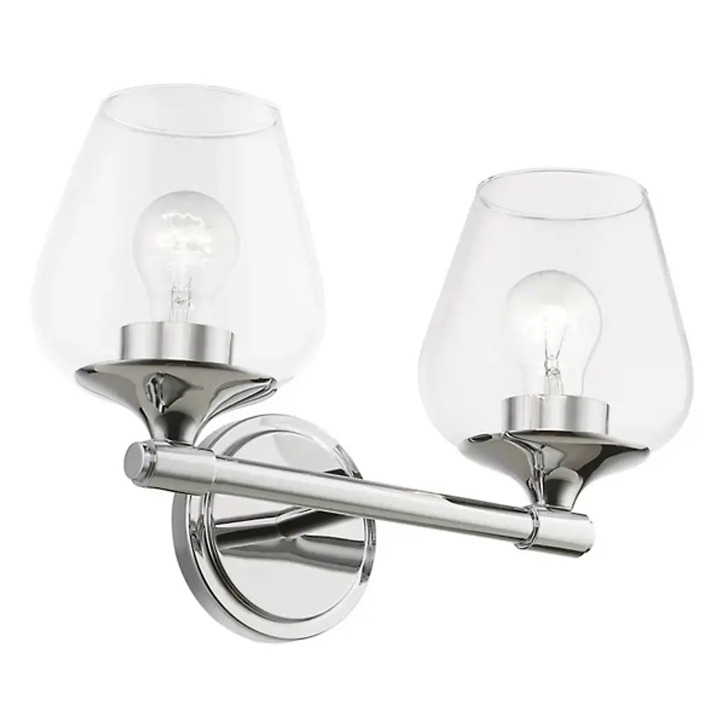 The Valentina Vanity Light from Alder & Ore lends a lasting appeal to its surroundings. A welcoming fixture with refined, willowy curves, it extends a slim crossbar from a circular wall plate, securing a series of lamps along it, extending single sockets from flared bobeches. Clear glass goblet shades reduce glare to the sides, splashing out an inspiring warmth that gleams off the clean-surfaced metal.