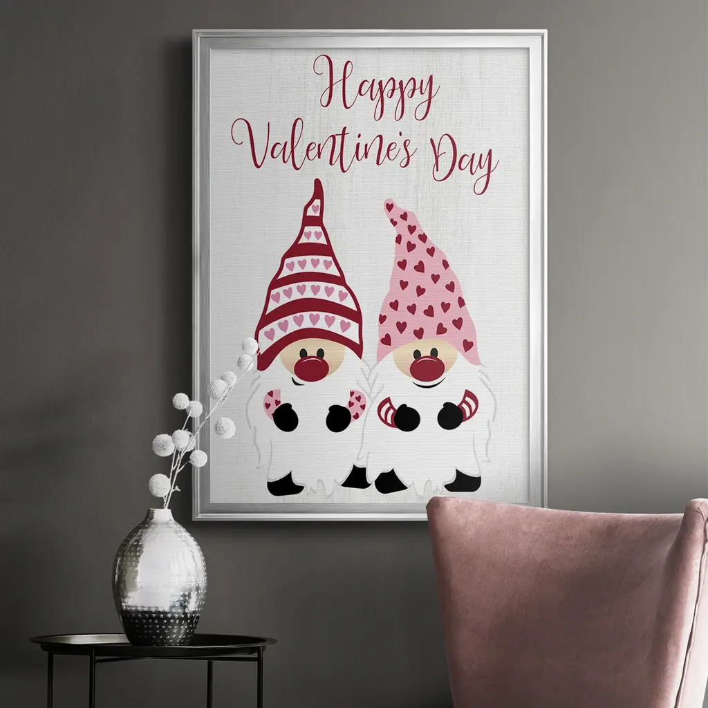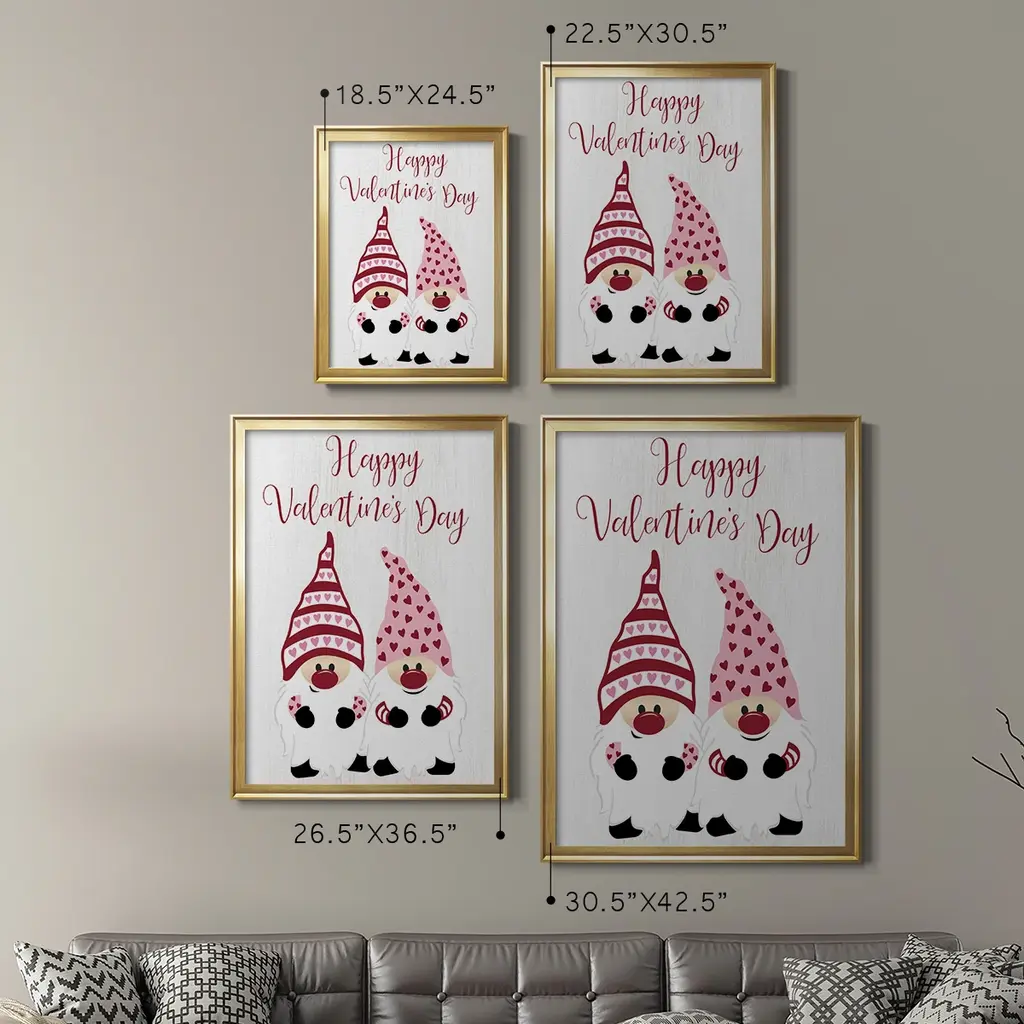 Valentines Gnomes Premium Framed Print - Ready to Hang A Premium Framed Print created to last. Framed in distressed wood and available in an array of sizes and colors Featuring a beveled a solid wood stretcher bar, each piece comes ready to hand 4 SIZES AVAILABLE 30.5''X42.5'' - Overall Size 26.5'X36.5'' - Overall Size 22.5''x30.5'' - Overall Size 18.5''x24.5'' - Overall Size Each piece is made to order. Each piece comes with hanging hardware. Made in the USA Ready to Hang