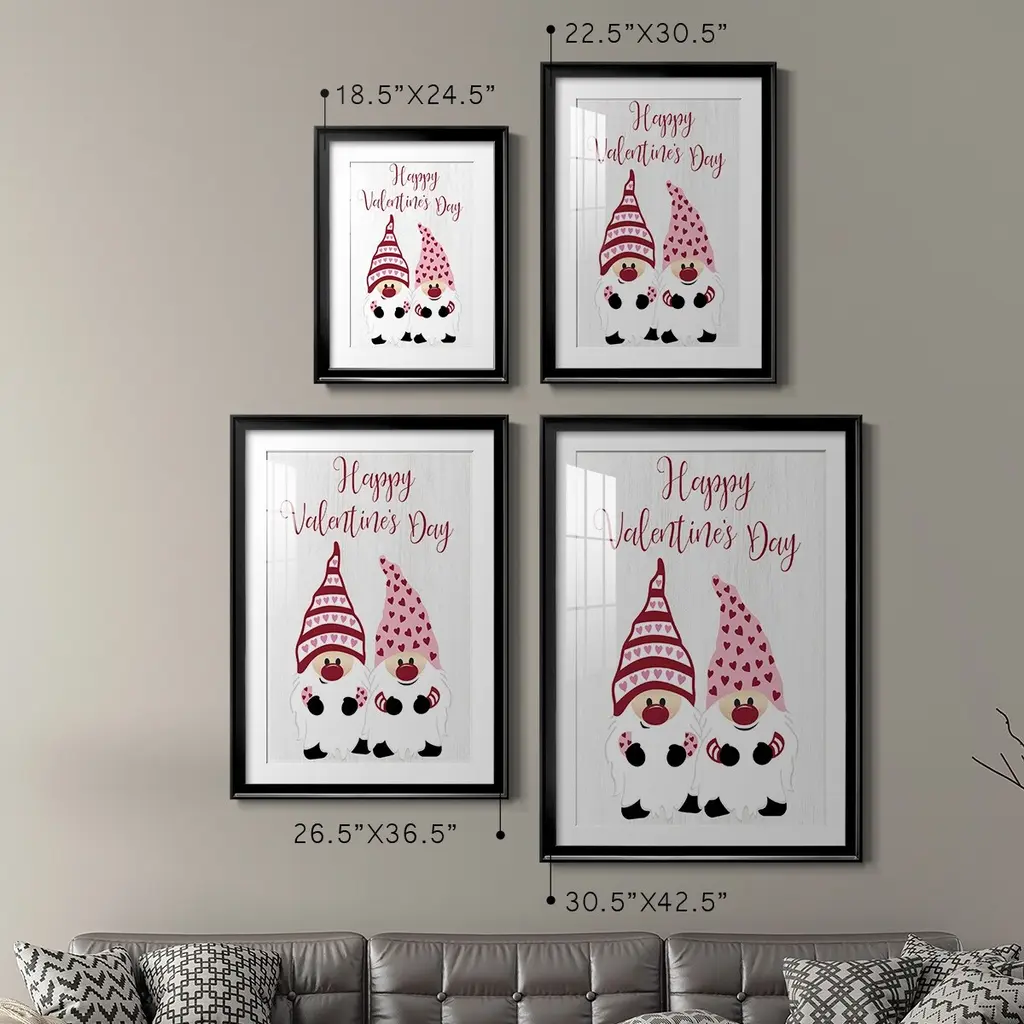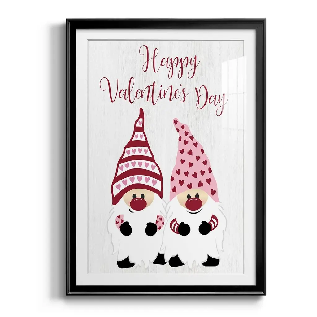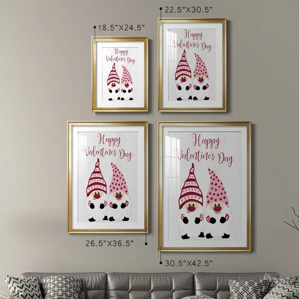 Valentines Gnomes Premium Framed Print - Ready to Hang A Premium Framed Print created to last. Framed in distressed wood and available in an array of sizes and colors Featuring a beveled a solid wood stretcher bar, each piece comes ready to hand 4 SIZES AVAILABLE 30.5''X42.5'' - Overall Size 26.5'X36.5'' - Overall Size 22.5''x30.5'' - Overall Size 18.5''x24.5'' - Overall Size Each piece is made to order. Each piece comes with hanging hardware. Made in the USA Ready to Hang Giclee Paper Print Acrylic Glass Beveled Matt Board