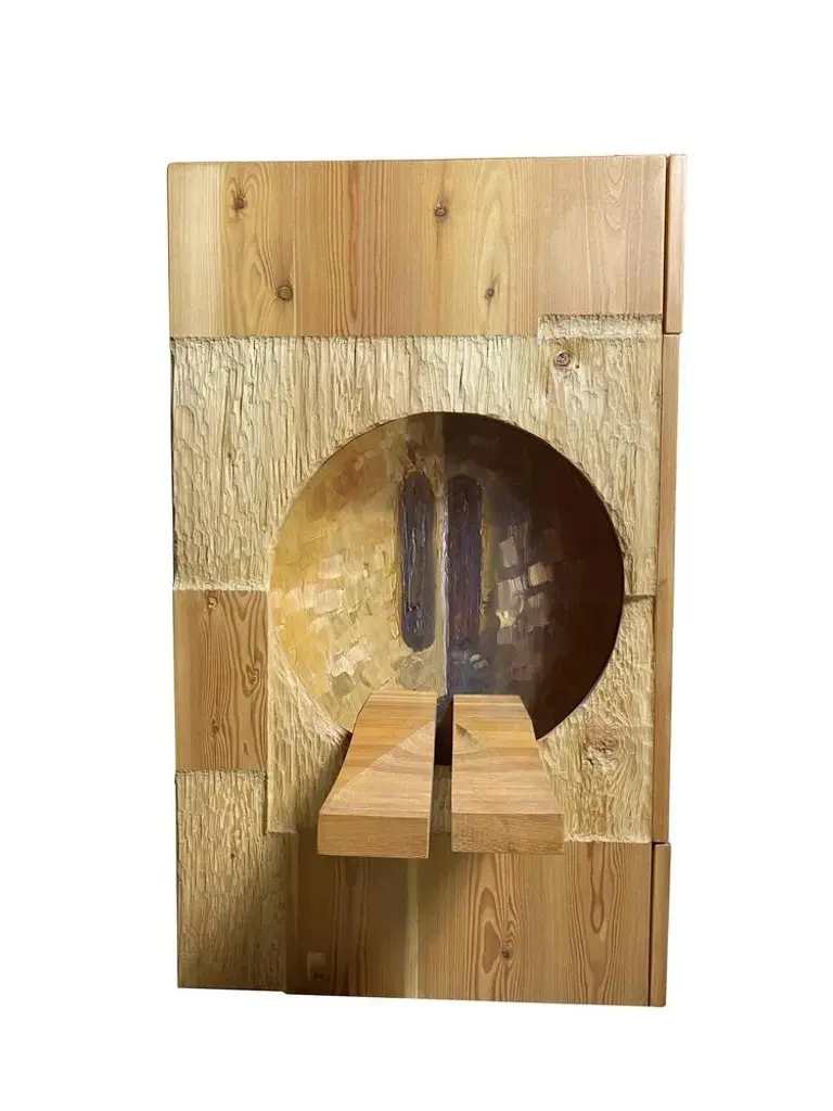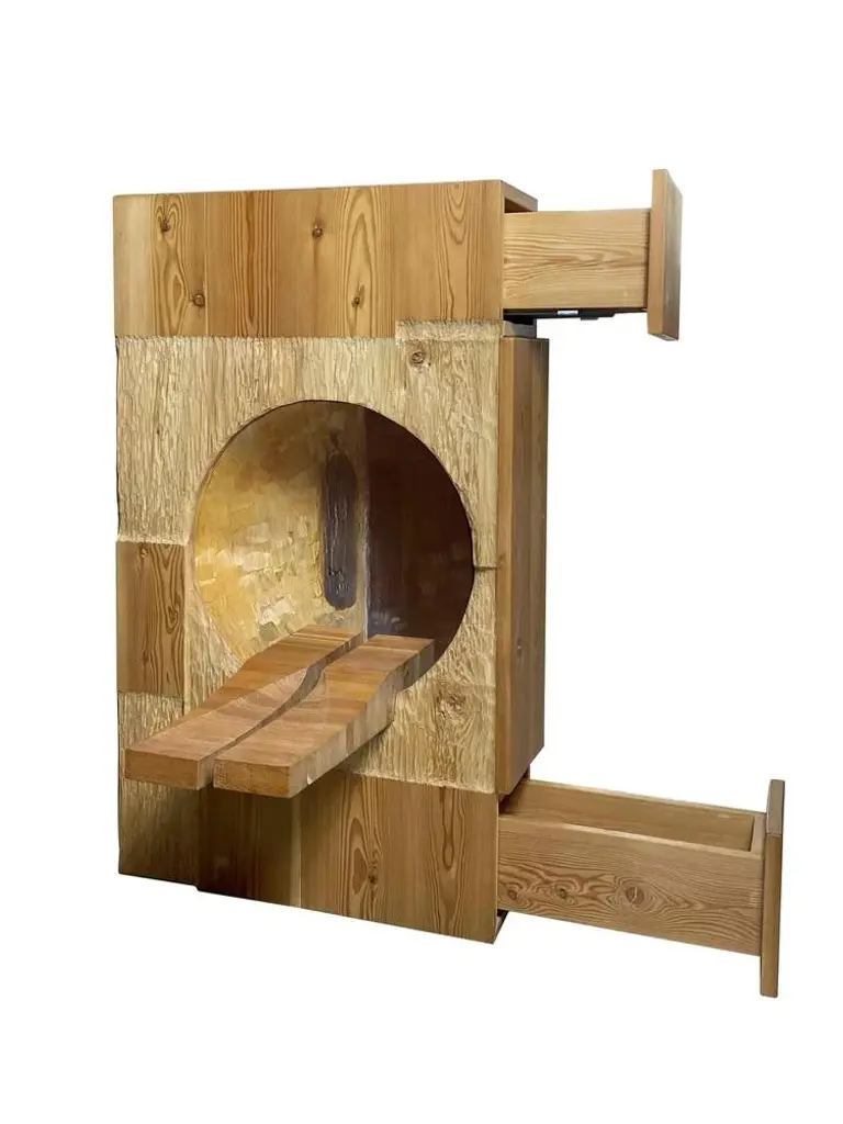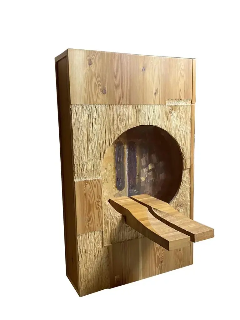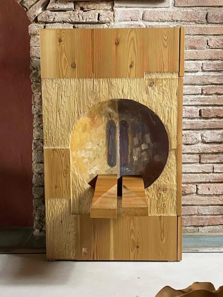 VALIGIA DUE of Pietro Meccani for Meccani Design, 2022 Solid European larch credenza with hand carved parts, with two drawers. Internally hand-decorated with oil painting. Limited edition of 10. Each piece is numbered and signed by the author. Dimensions cm 60 x 52 x h 101 Open 97.5 x 52 x h 101 cm Labeled by Maker,Numbered